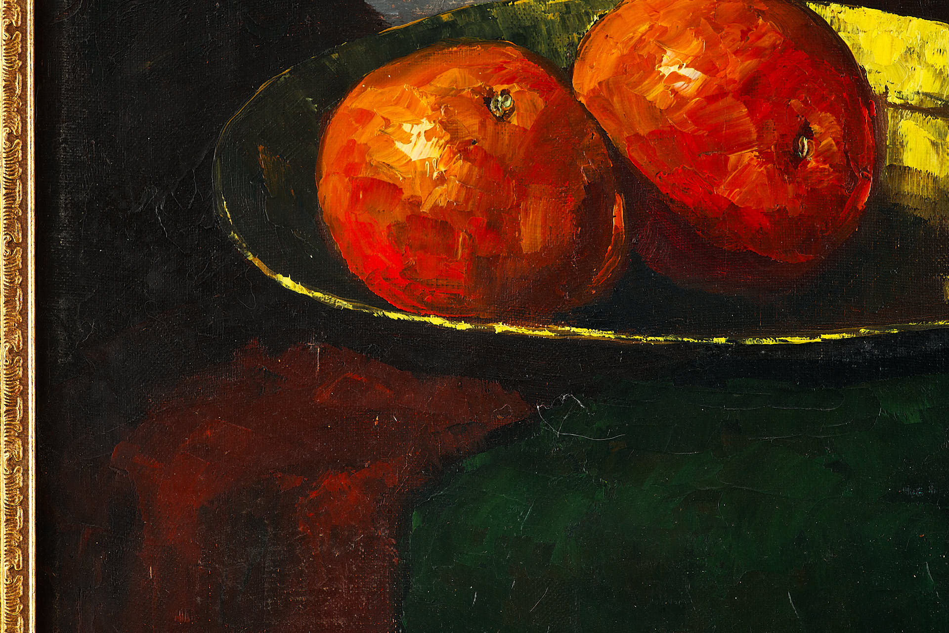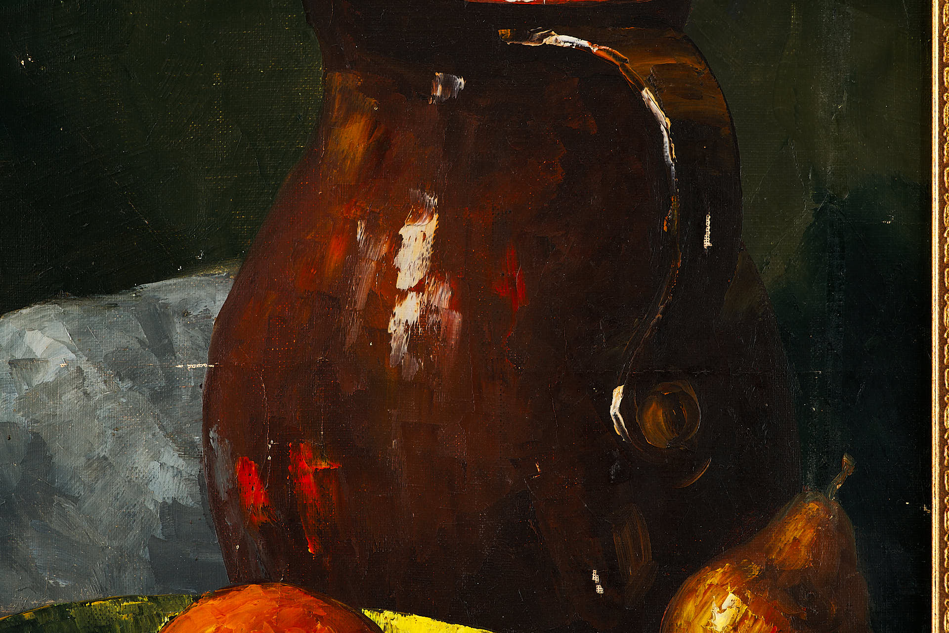 Перед нами классический натюрморт середины XX века, изображающий скромную, но выразительную сцену: на столе, покрытом темно-зелёной скатертью с бордовой полосой, располагаются глиняный кувшин, медная тарелка с мандаринами и сочная груша. Фоном служит тёмная, почти монохромная плоскость, подчёркивающая игру света на предметах и выделяющая тёплые оттенки керамики, фруктов и металла. Завершающим штрихом служит скомканная белая бумага, добавляющая реалистичную небрежность композиции.
