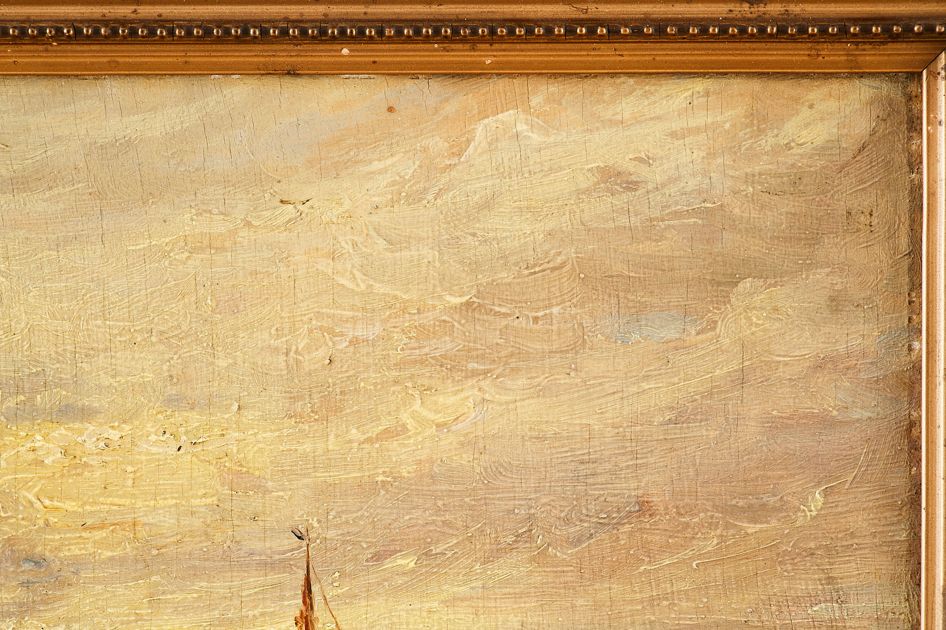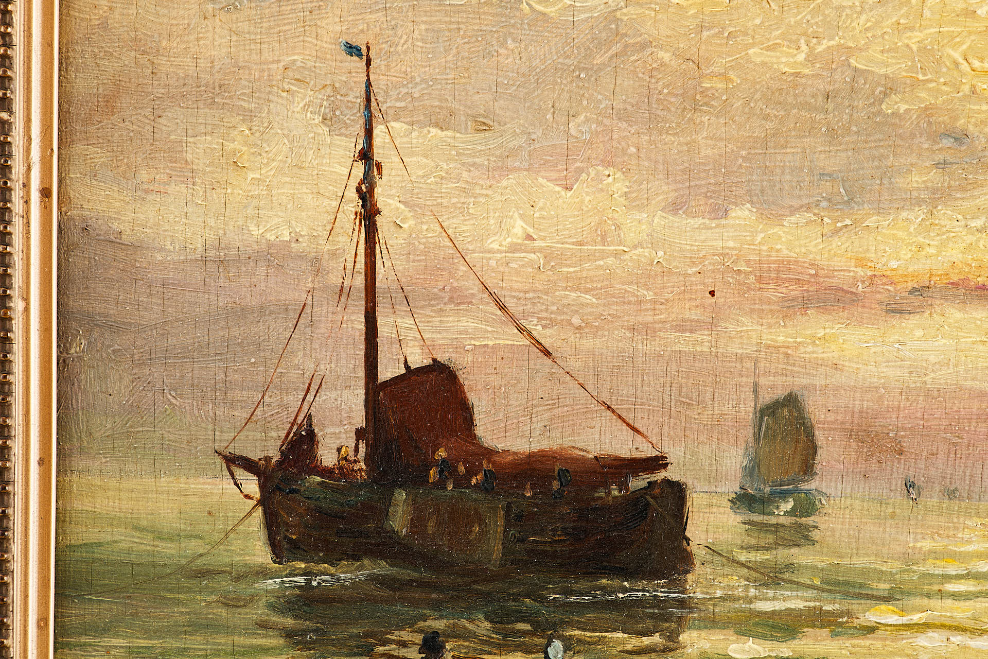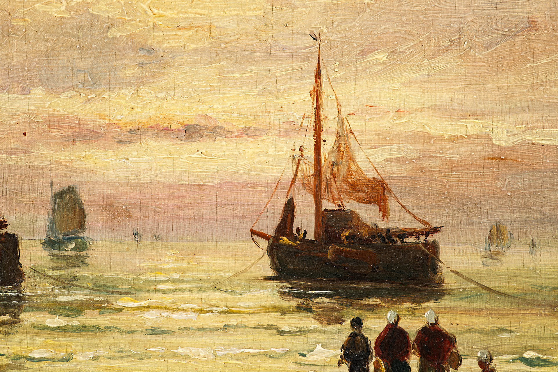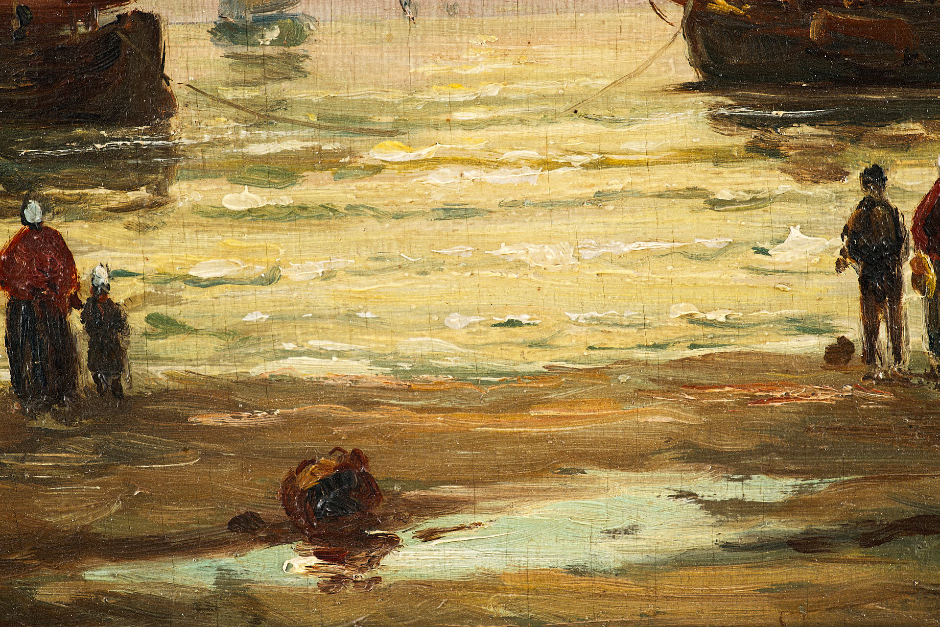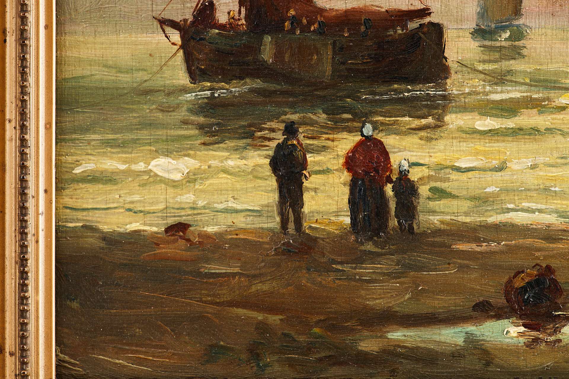 На картине изображена сцена вечернего прибытия рыбаков к морскому берегу. В центре композиции два судна приближаются к отмели, а на переднем плане их встречают женщины и дети. В отражениях на воде читается мягкий свет заходящего солнца, пробивающийся сквозь плотную облачность, что придаёт всей сцене драматическую, но одновременно спокойную атмосферу. Автор уделяет внимание не столько деталям, сколько общей эмоциональной тональности, достигаемой за счёт приглушённой палитры и эффекта рассеянного света.