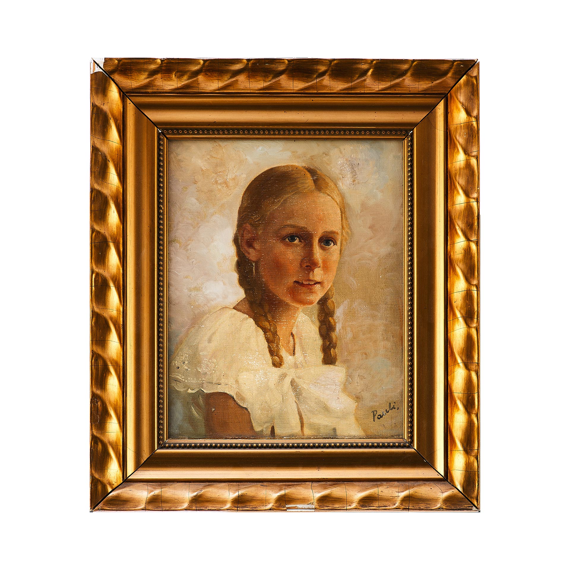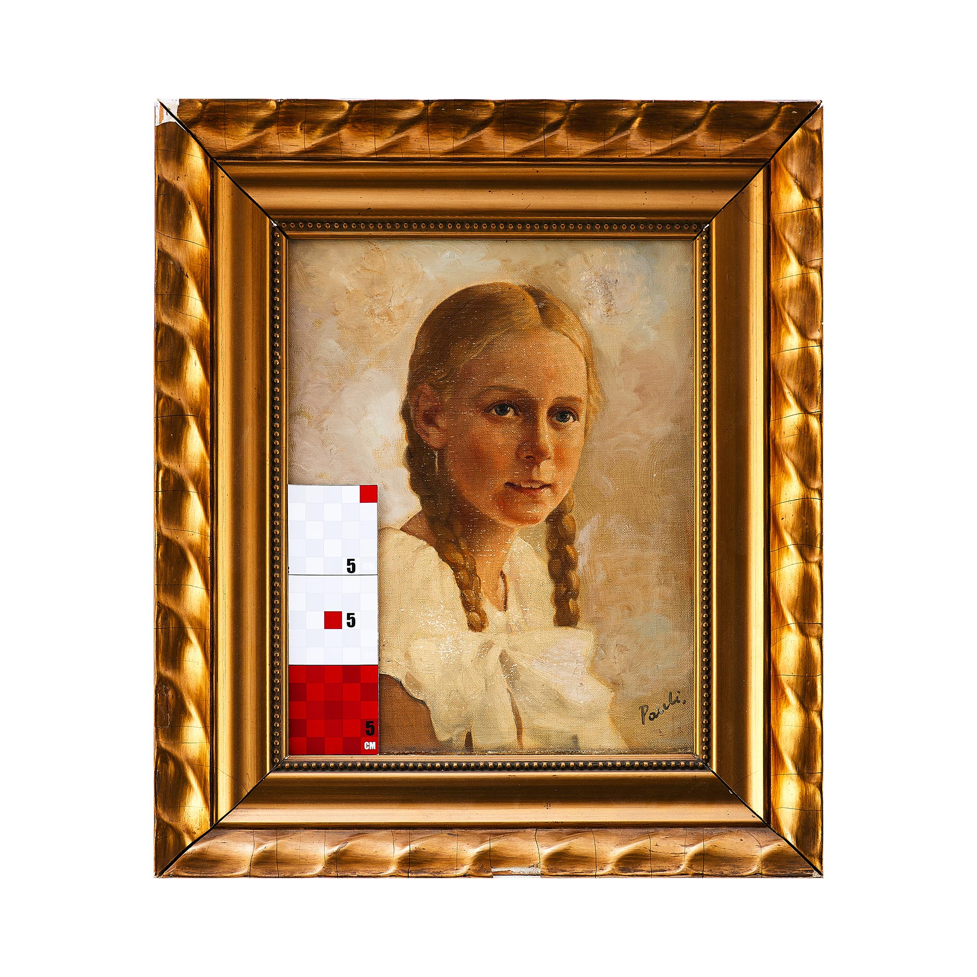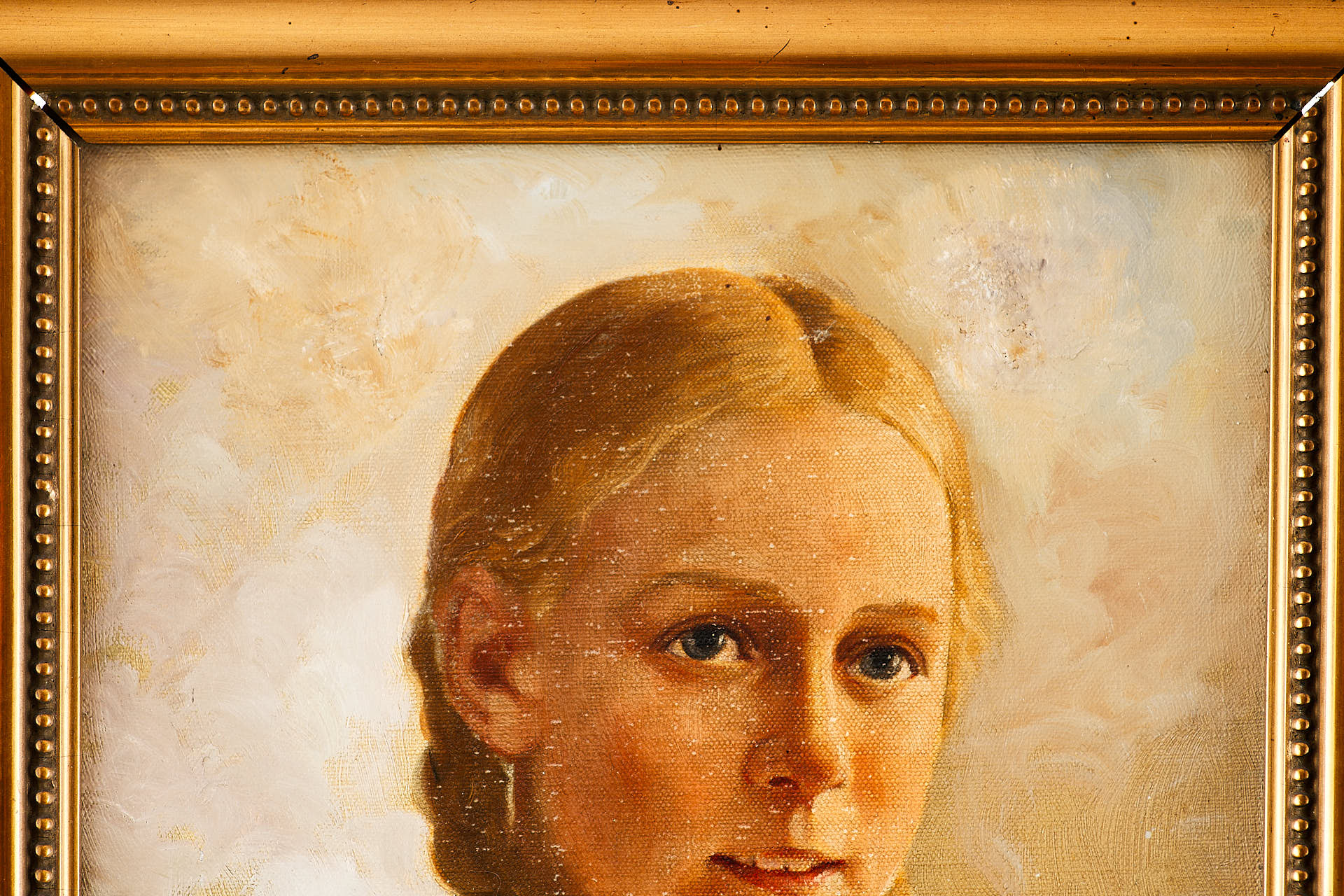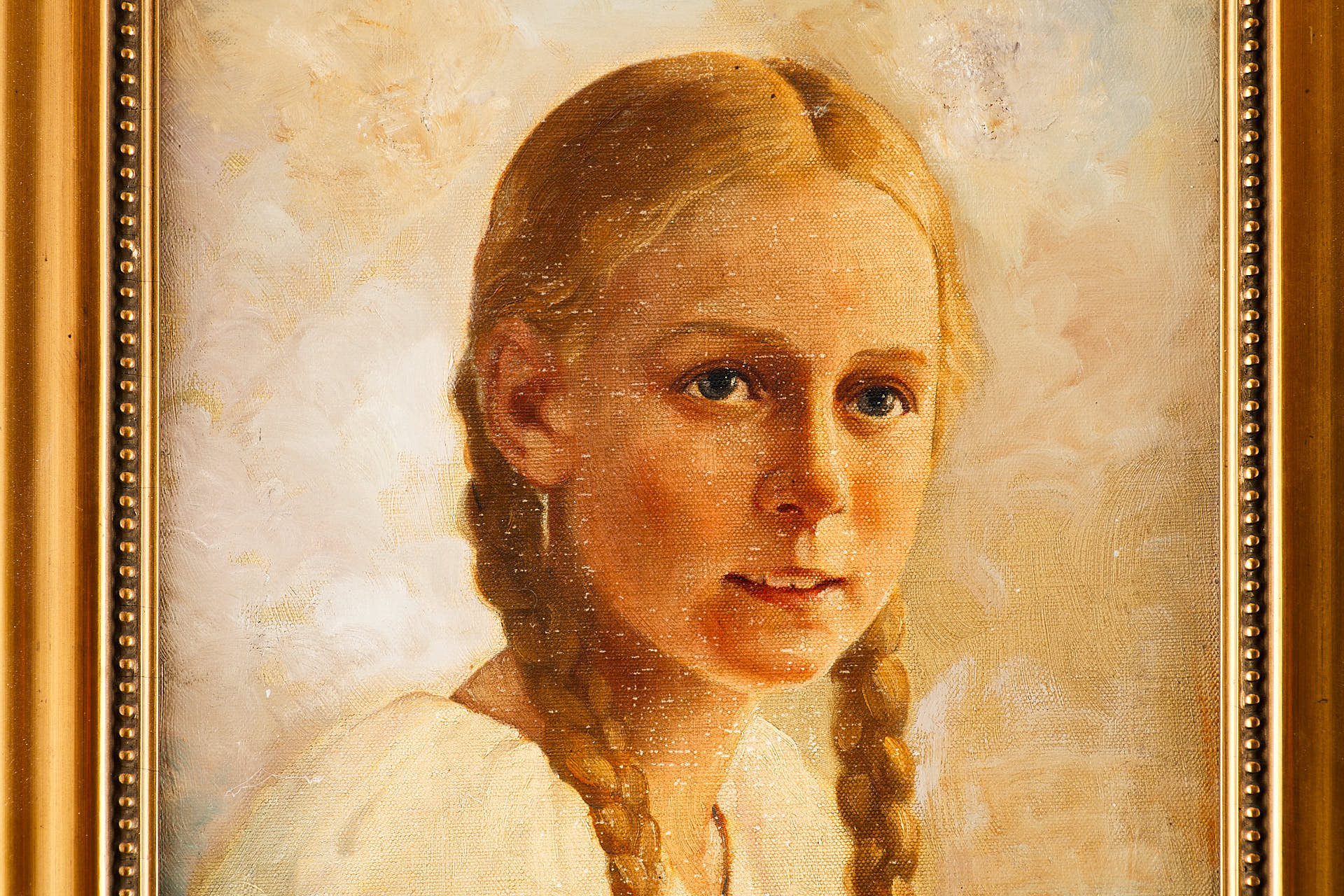 Перед нами изящный погрудный портрет девочки, написанный маслом на холсте в первой четверти XX века. Композиция выстроена по классическим канонам: фигура изображена вполоборота, взгляд направлен на зрителя, а фон нейтрален и светел, не отвлекает внимание от главного — лица модели. Девочка с прямым, спокойным взглядом, золотистыми волосами, заплетёнными в две аккуратные косы, одета в белое платье с пышными рукавами. Общий колорит картины выдержан в тёплых, естественных тонах, подчёркивая чистоту и юность модели.