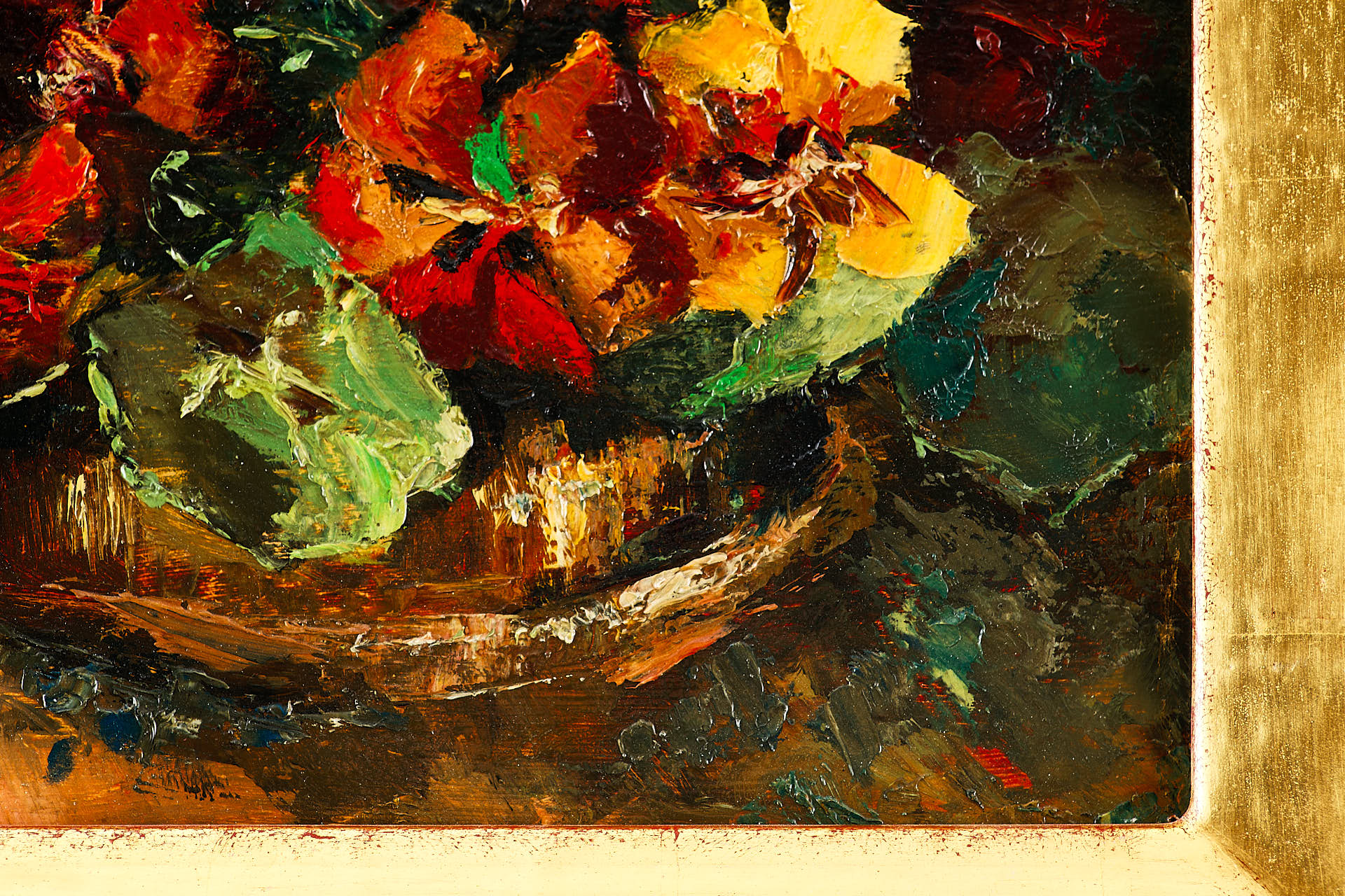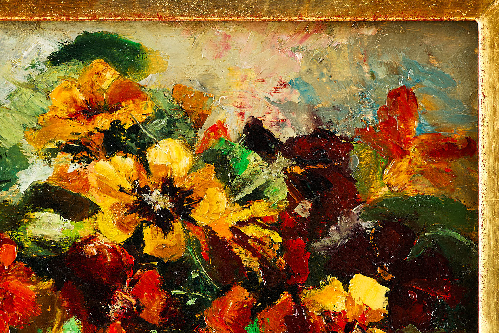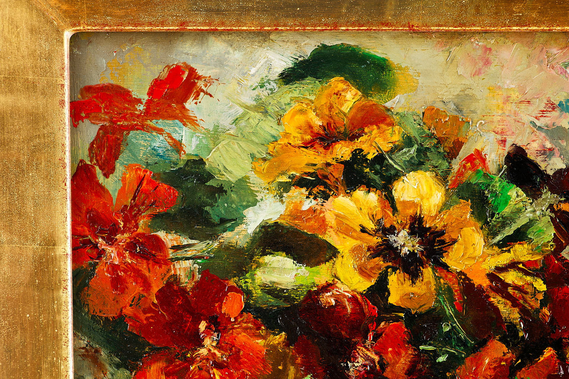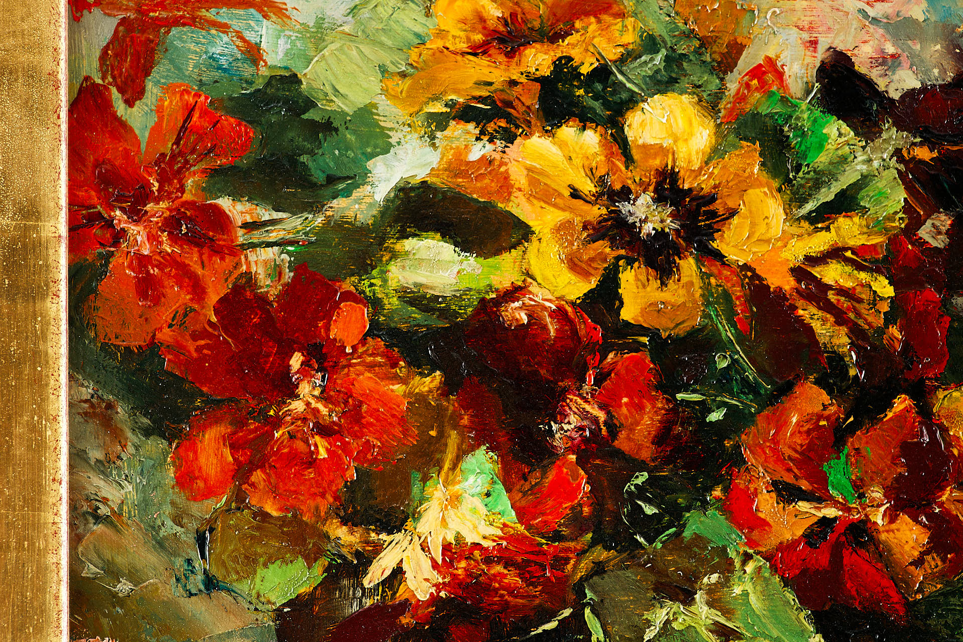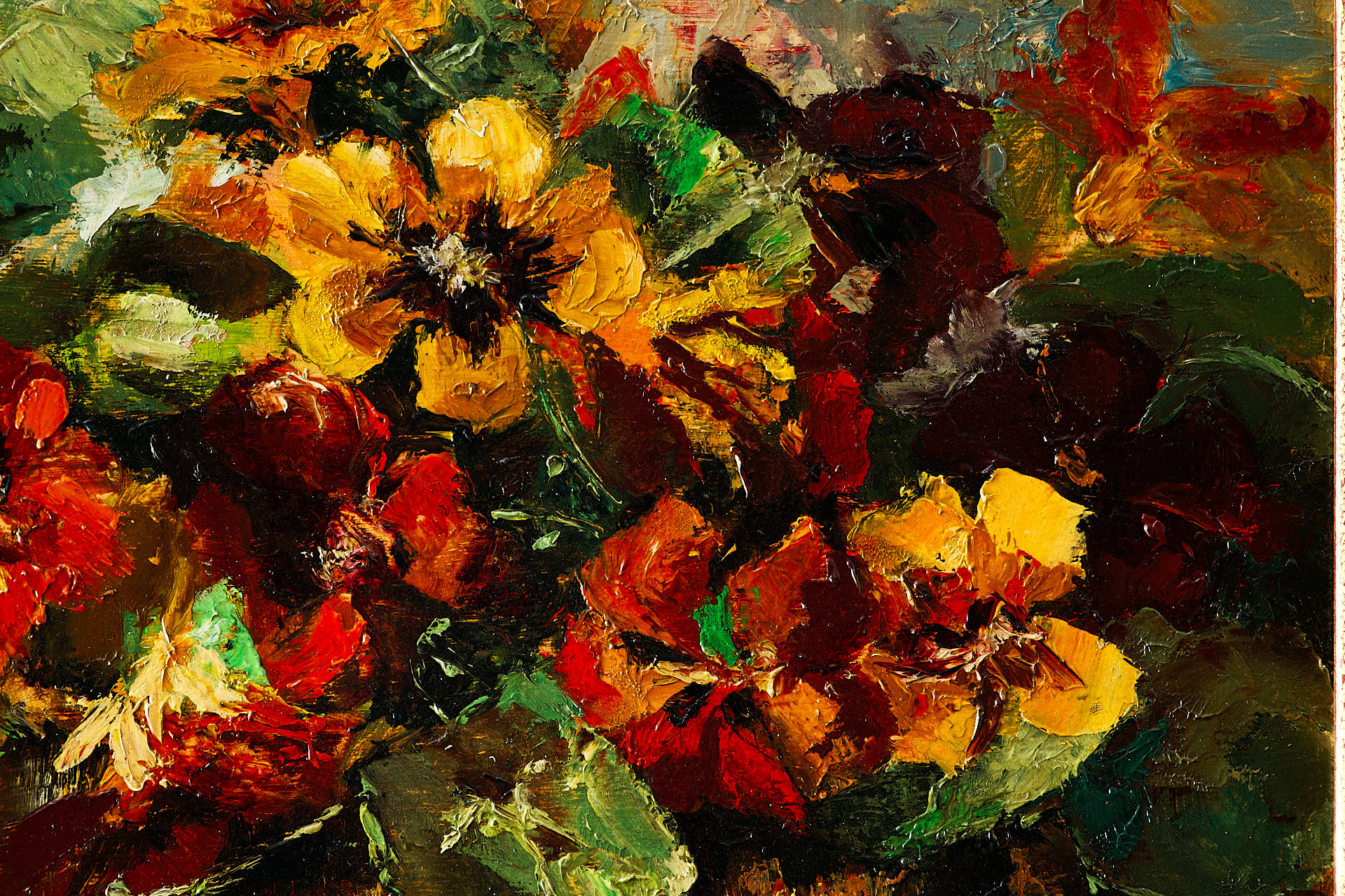На картине изображён пышный букет настурций в низком сосуде, выполненный с выразительной экспрессией. Жёлтые, алые и оранжевые цветы с крупными лепестками вырываются из густой зелени, создавая эффект насыщенного движения. Фон прописан сдержанными голубовато-серыми мазками, контрастирующими с теплотой переднего плана и подчеркивающими яркость композиции. Энергичные мазки, плотная фактура и интенсивные цветовые сочетания подчёркивают эмоциональную силу натюрморта.