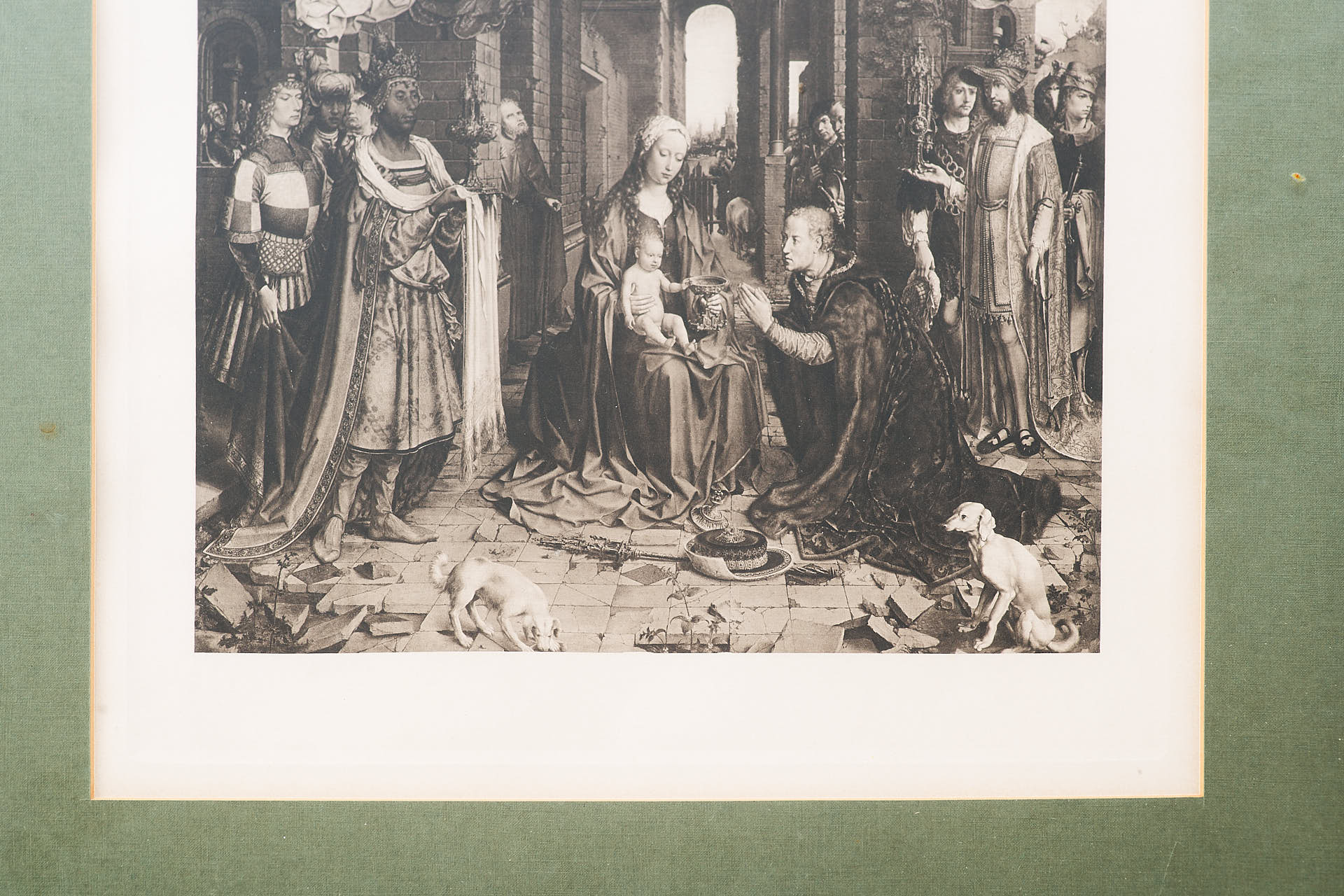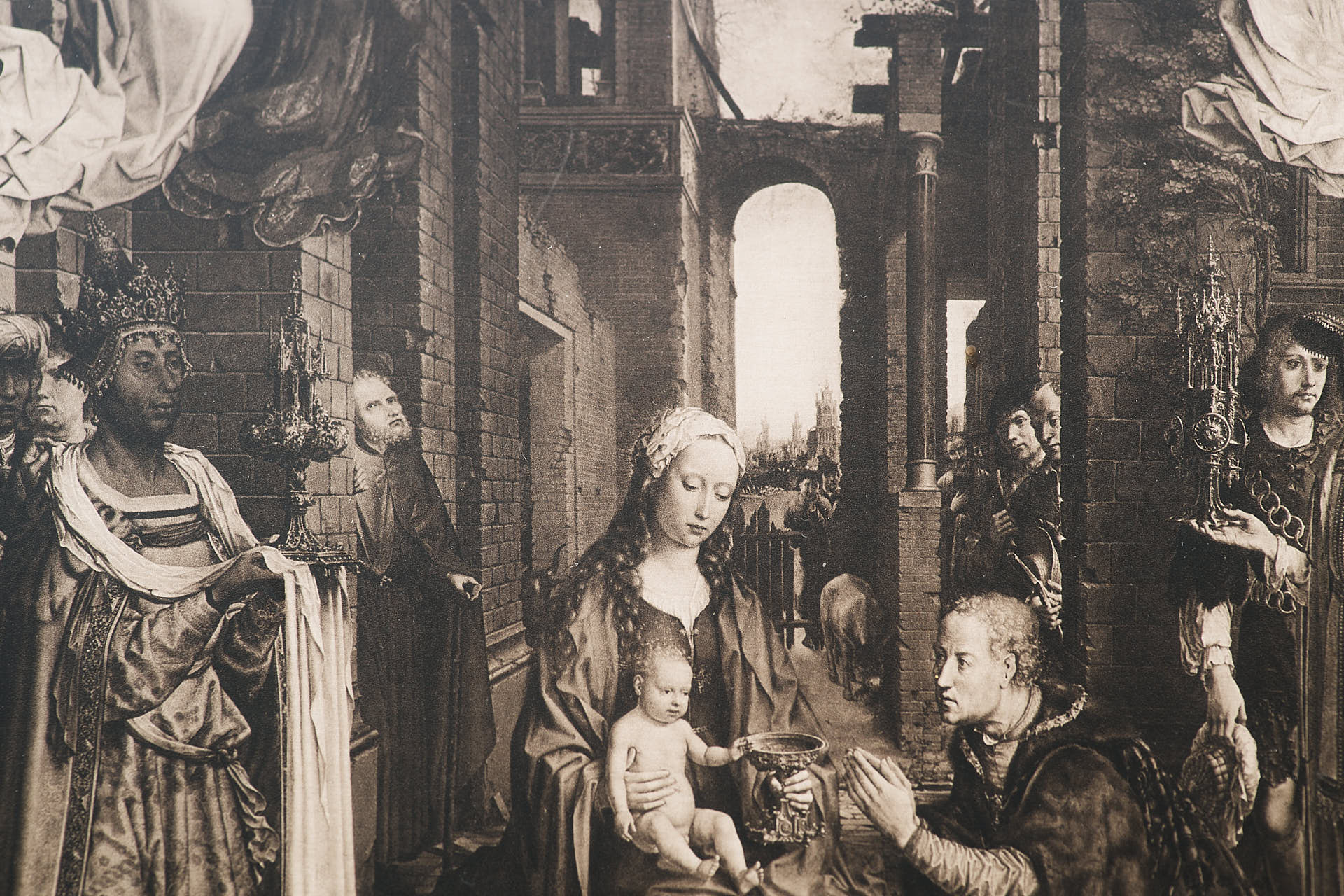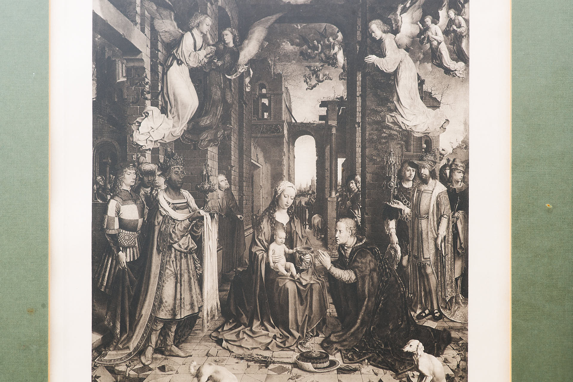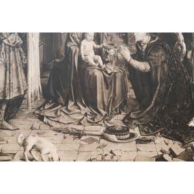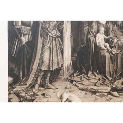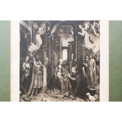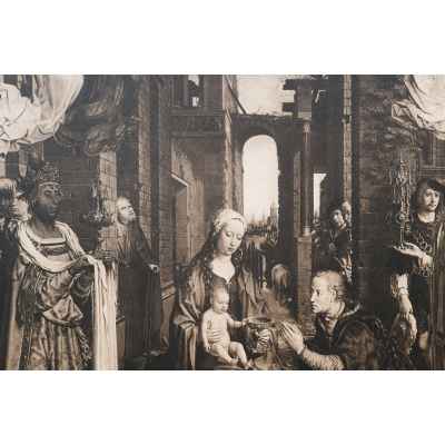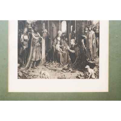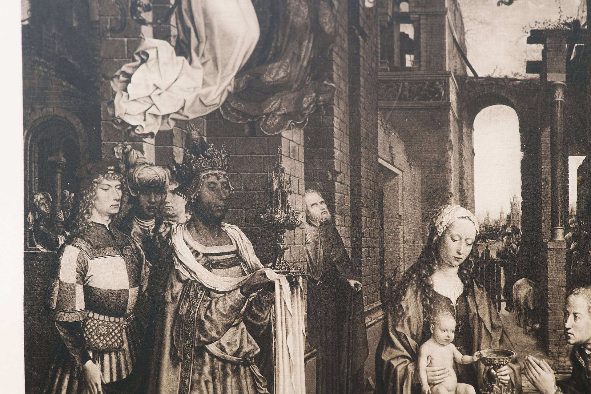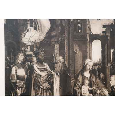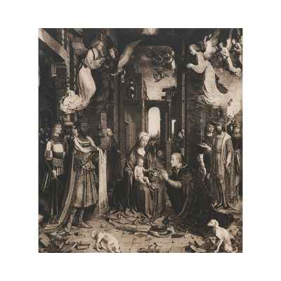 На изображении представлена фотогравюра по мотивам картины «Поклонение волхвов» работы Яна Госсарта, выполненная в 1904 году в Санкт-Петербурге. Тираж осуществлён Книгоиздательским Товариществом «Просвещение», специализировавшимся на выпуске альбомов с художественными репродукциями.