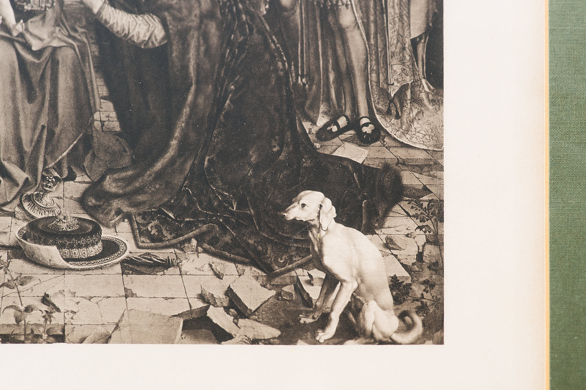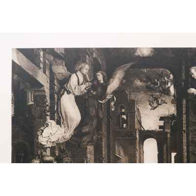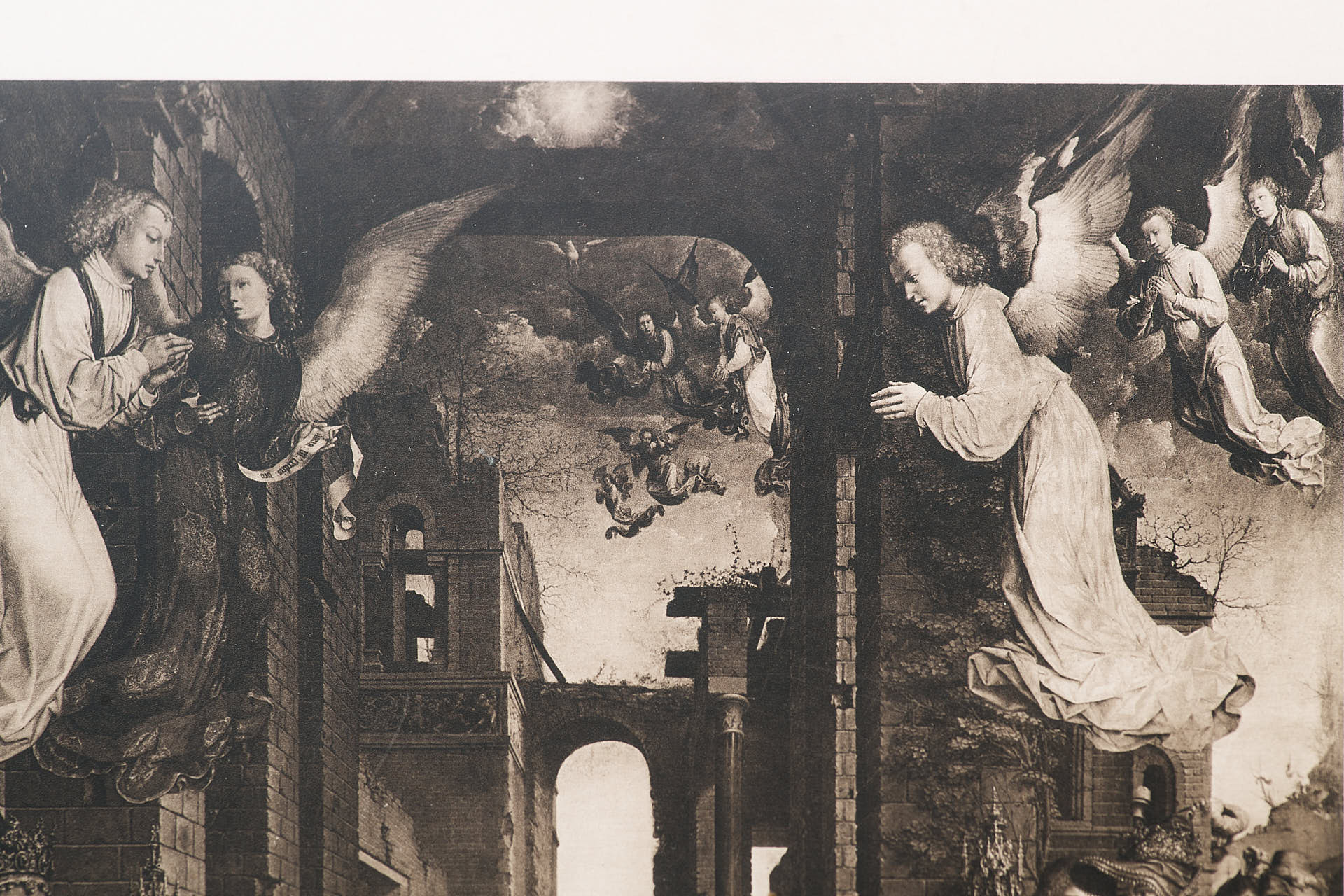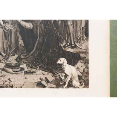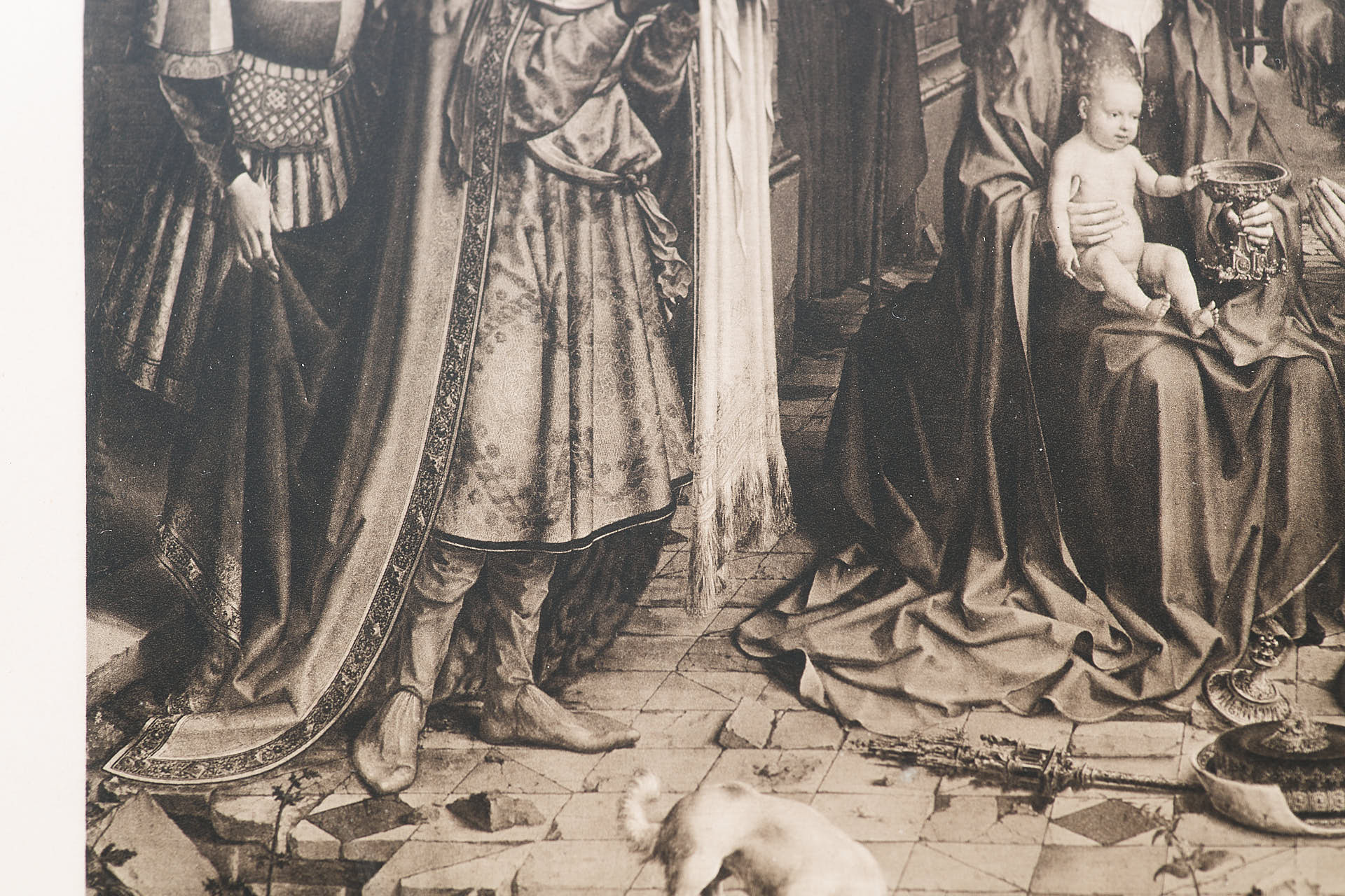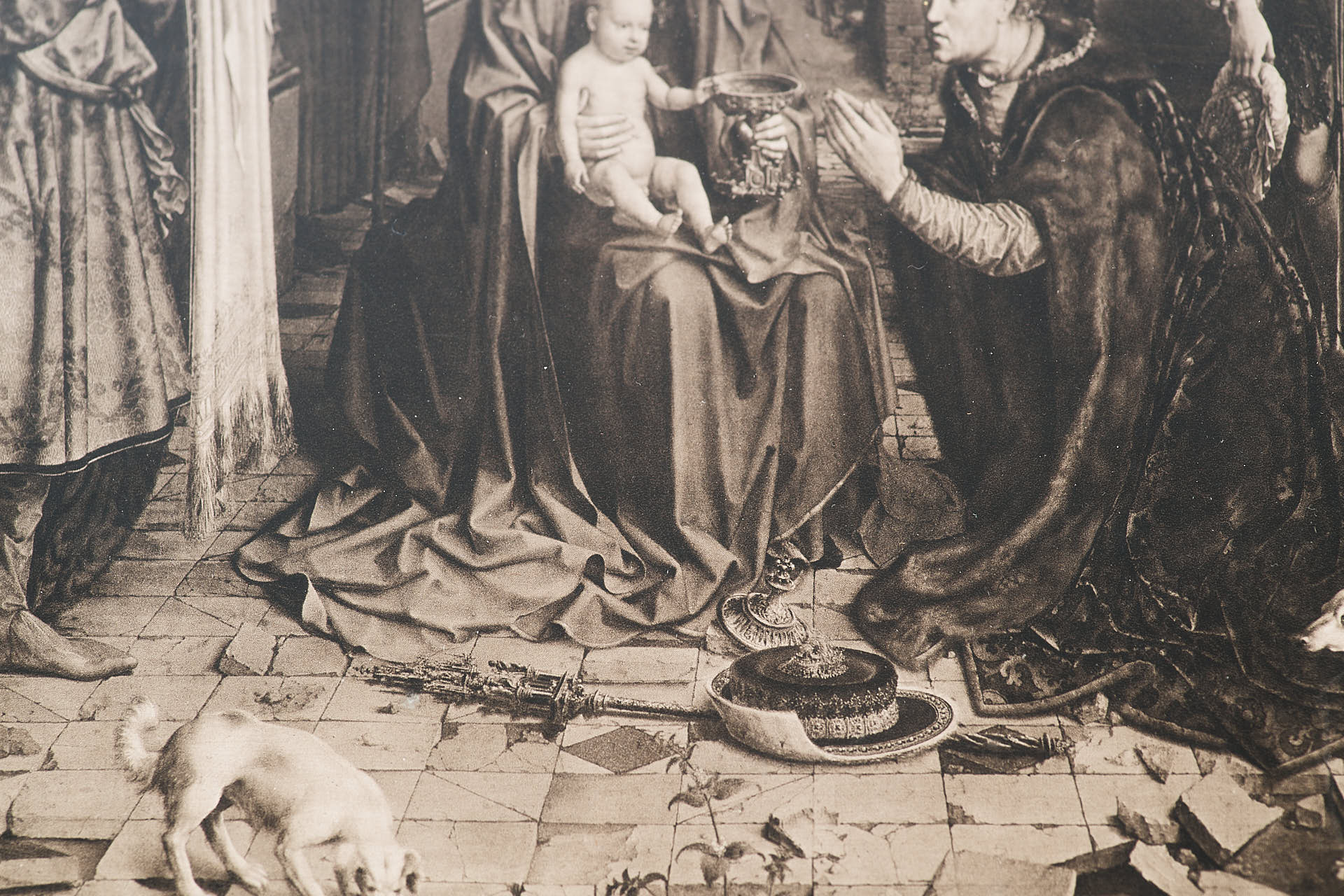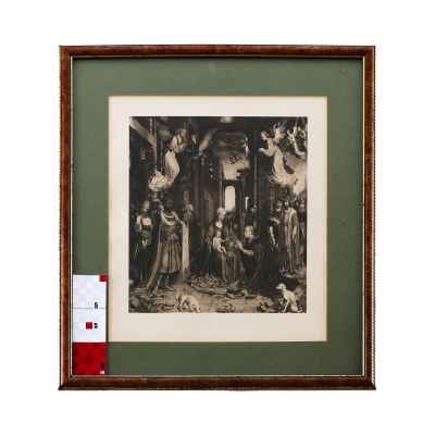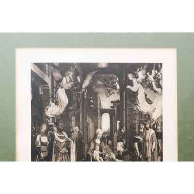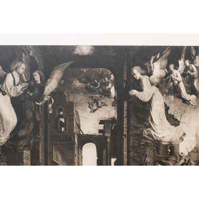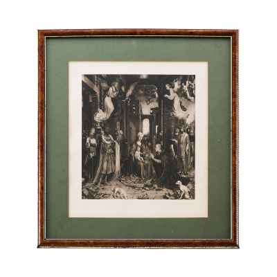 На изображении представлена фотогравюра по мотивам картины «Поклонение волхвов» работы Яна Госсарта, выполненная в 1904 году в Санкт-Петербурге. Тираж осуществлён Книгоиздательским Товариществом «Просвещение», специализировавшимся на выпуске альбомов с художественными репродукциями.