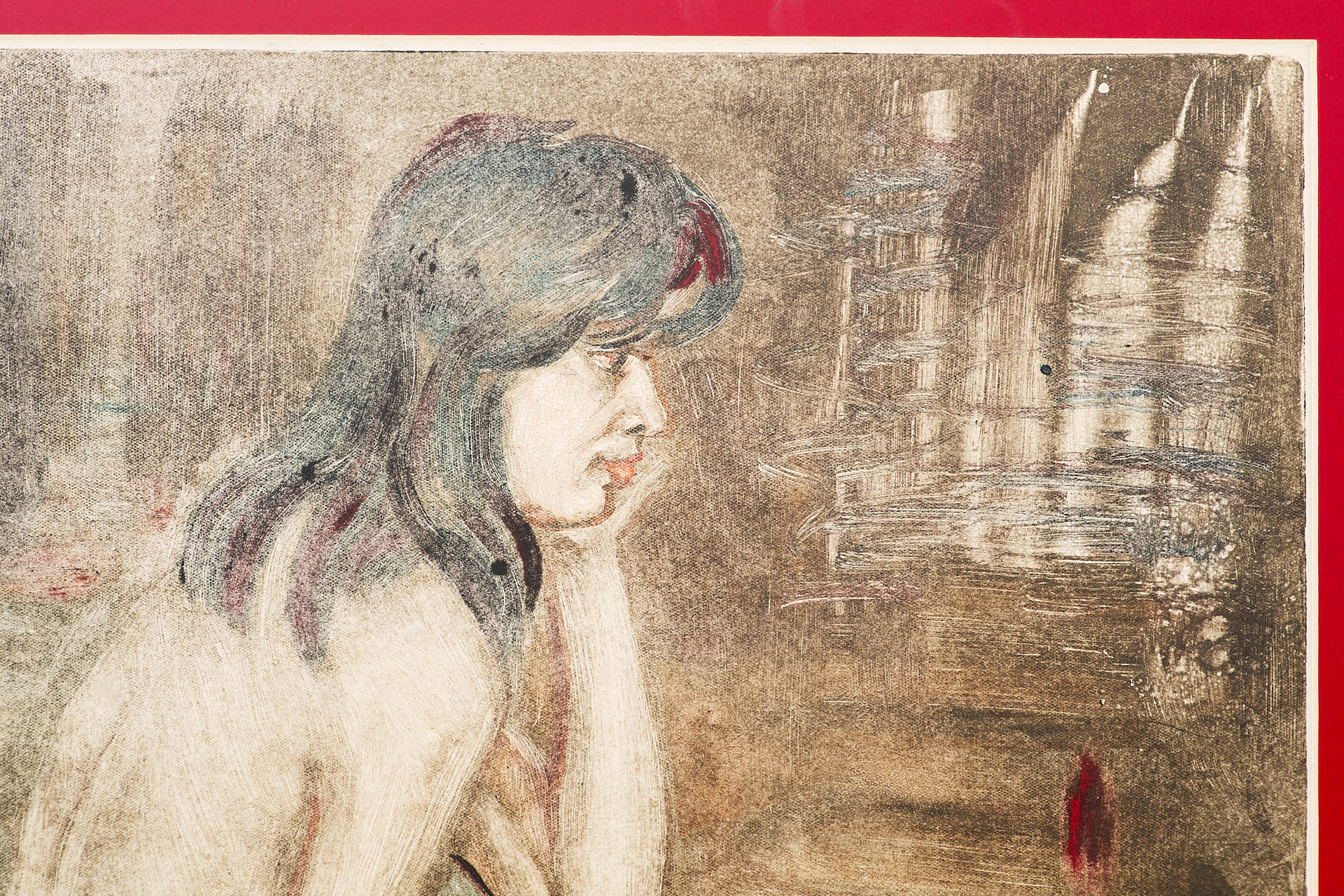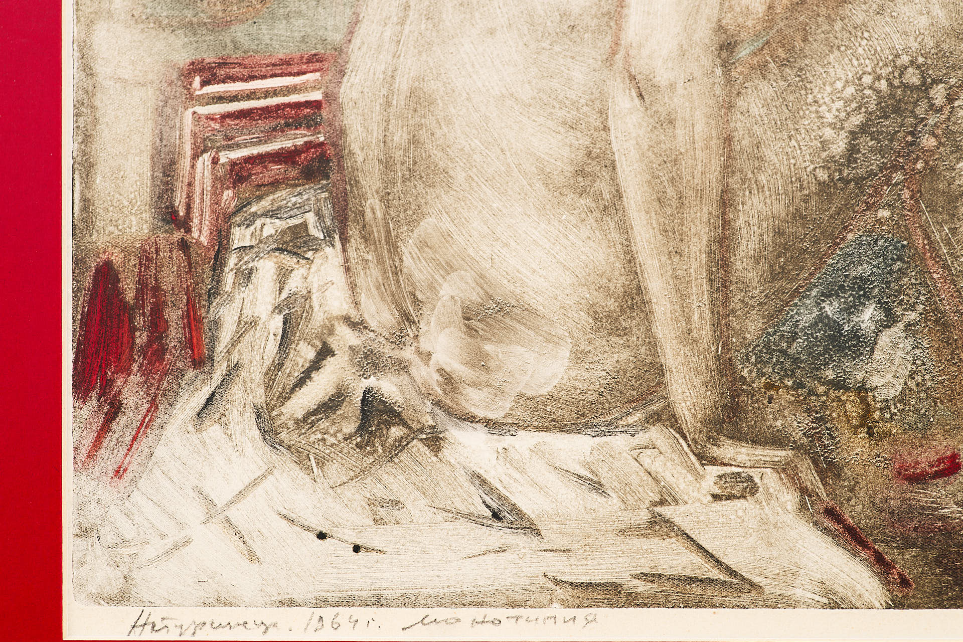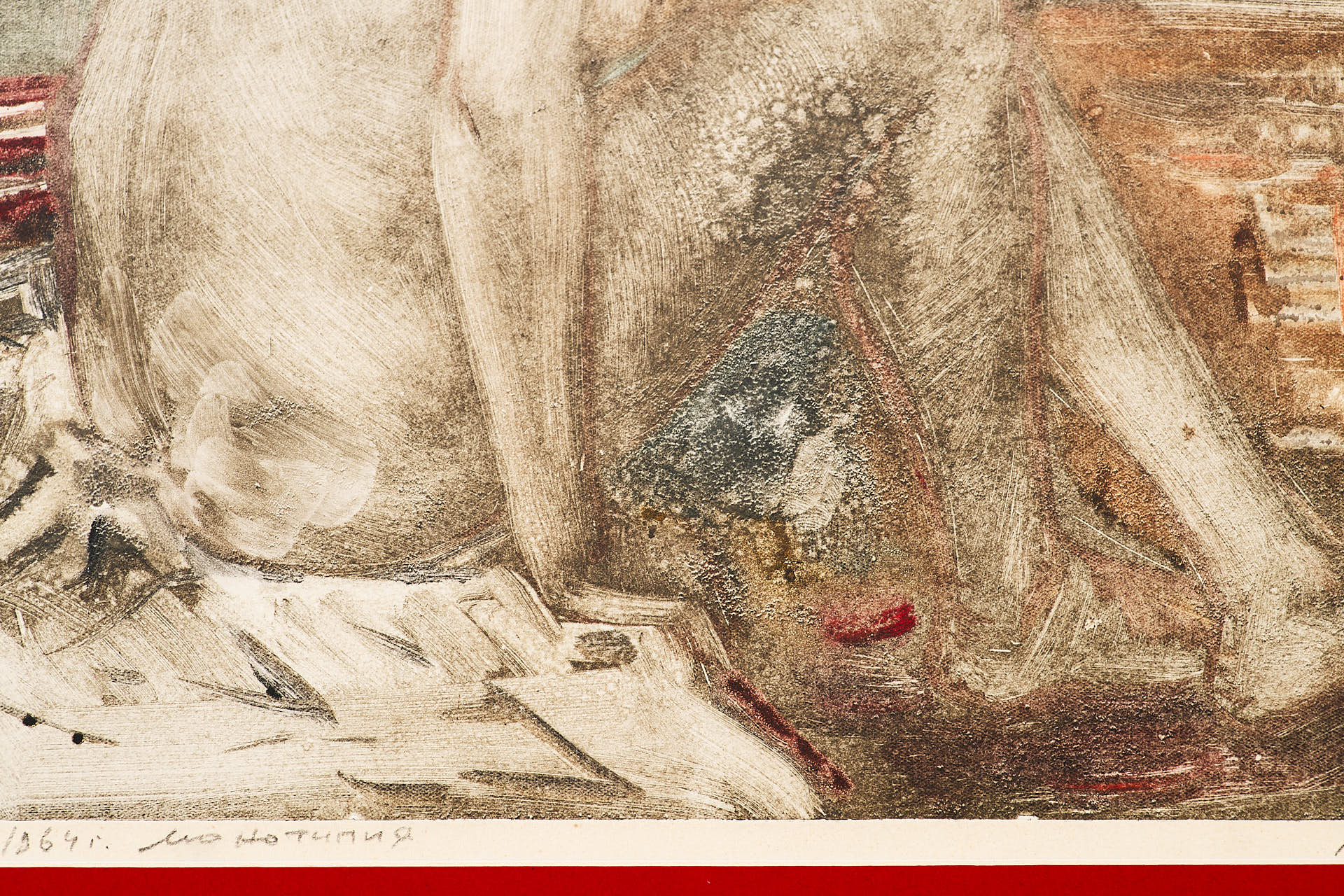 Техника монотипии — редкая и трудоёмкая разновидность печатной графики, при которой отпечатывается только один оттиск. Это придаёт работе живописный, неповторимый характер и делает её ближе к живописи, чем к классической тиражной графике. Такое решение подчеркивает экспериментальный подход художника и его стремление к эмоциональной выразительности.