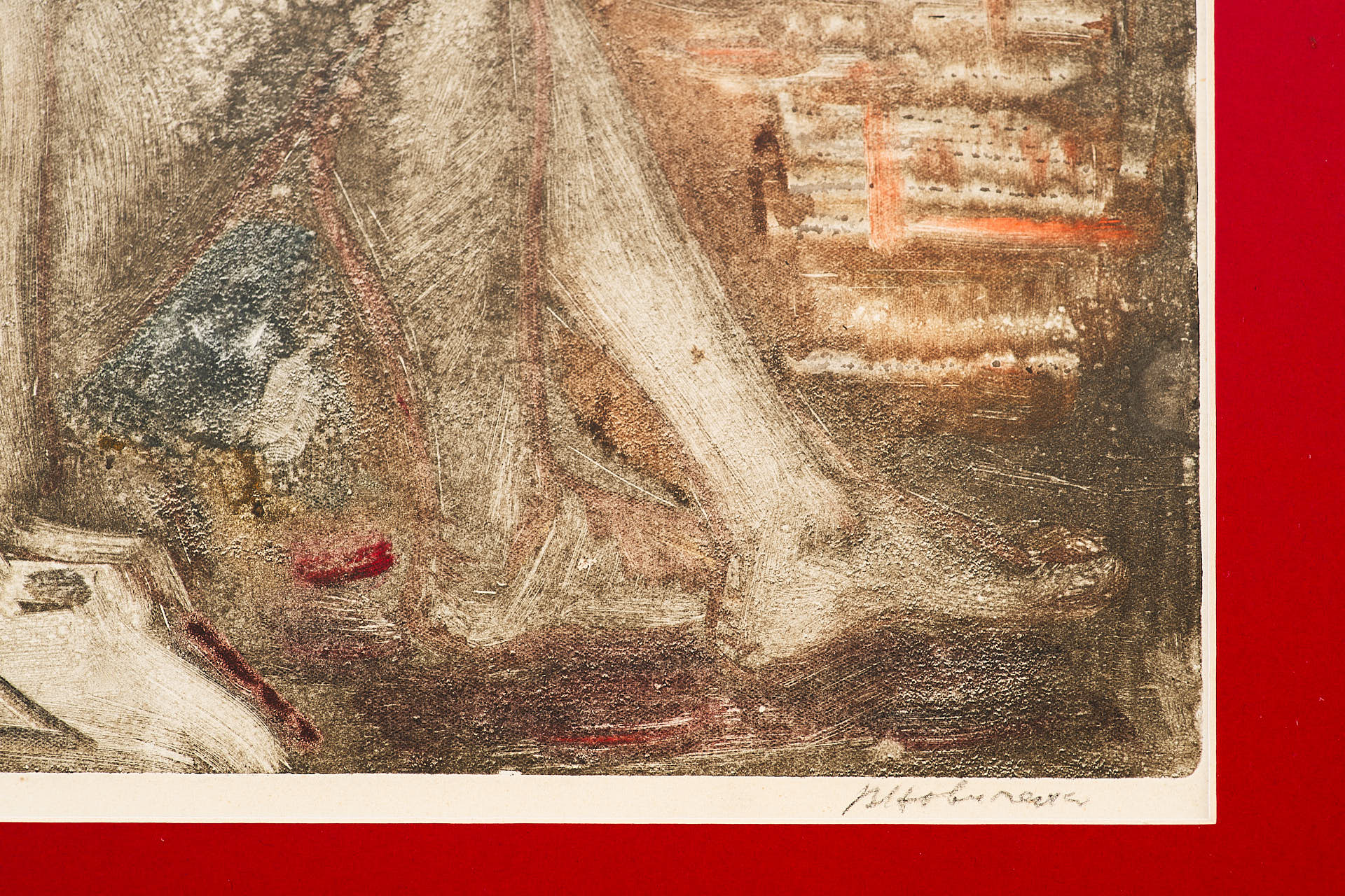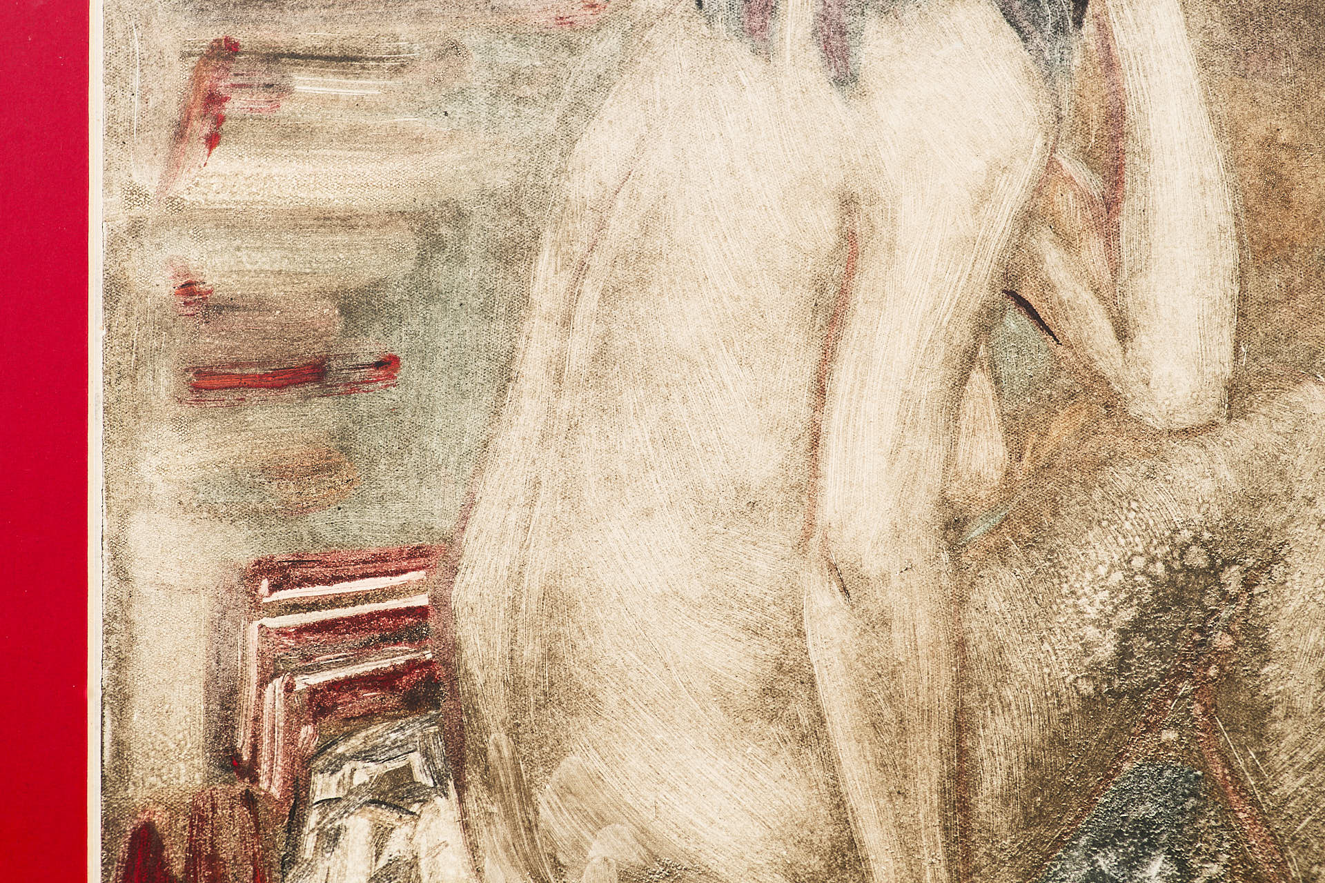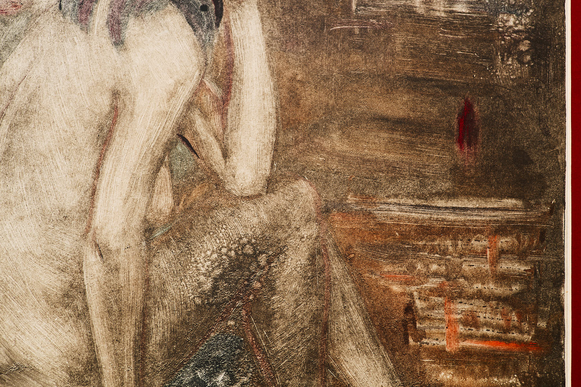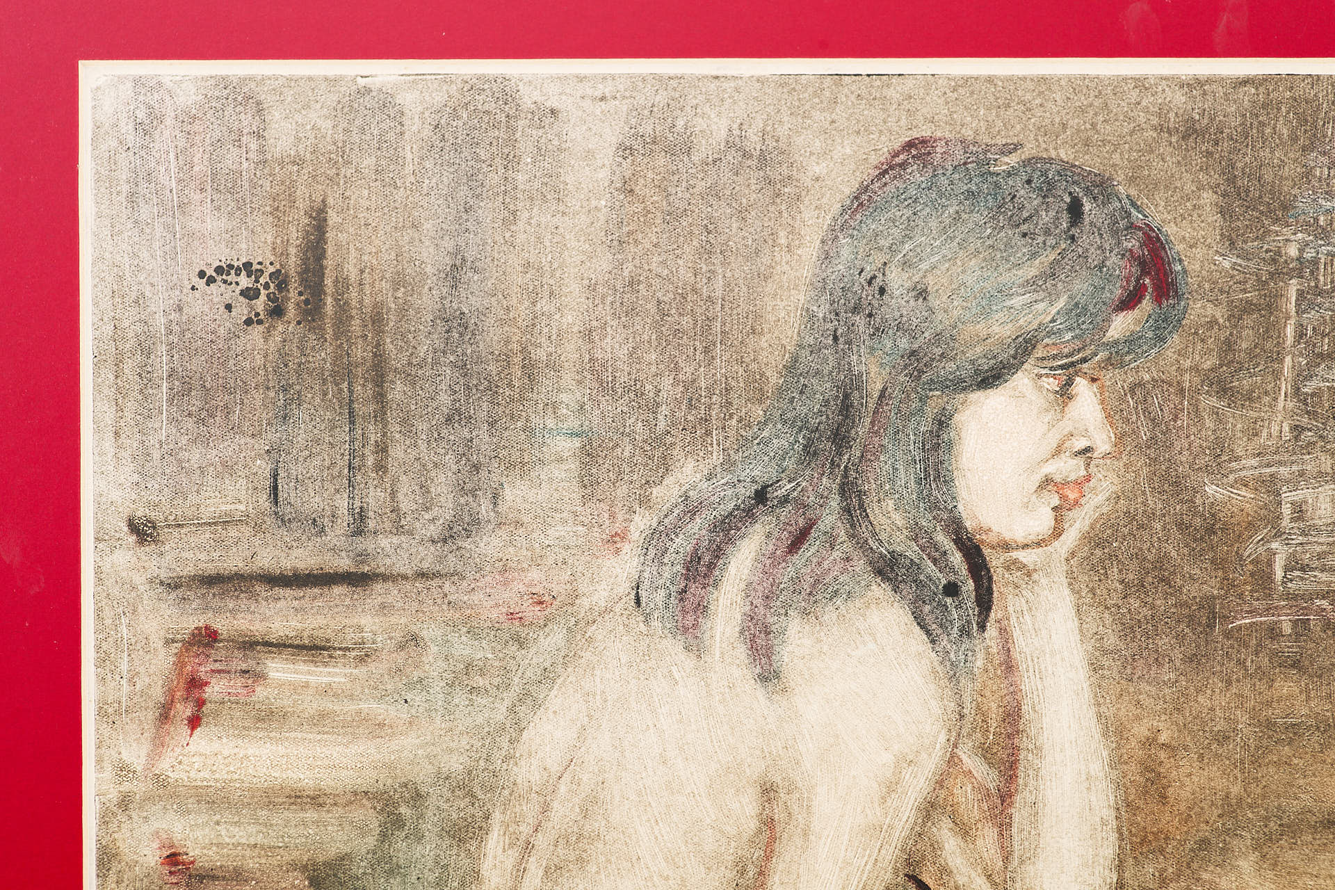 Техника монотипии — редкая и трудоёмкая разновидность печатной графики, при которой отпечатывается только один оттиск. Это придаёт работе живописный, неповторимый характер и делает её ближе к живописи, чем к классической тиражной графике. Такое решение подчеркивает экспериментальный подход художника и его стремление к эмоциональной выразительности.