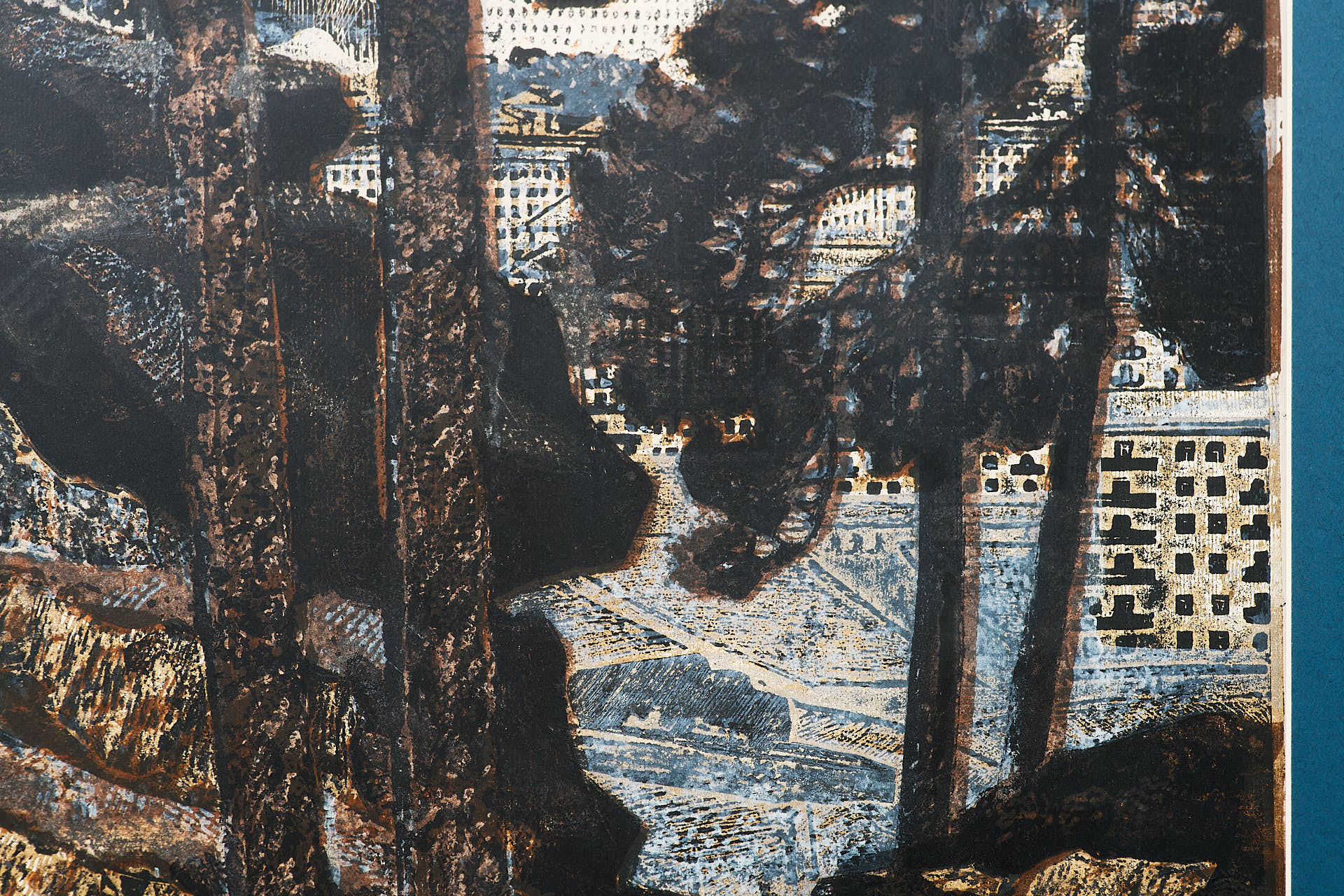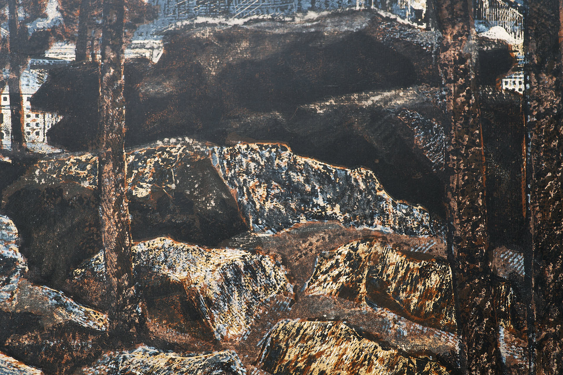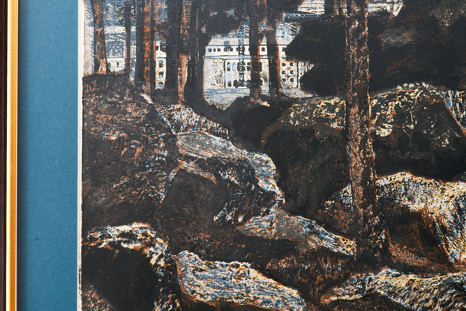 Работа выполнена в художественной технике линогравюры, что заметно по чёткости форм и плоскостной трактовке изображения. Линогравюра позволила художнику акцентировать внимание на тектонической структуре ландшафта и декоративной выразительности кроны деревьев.