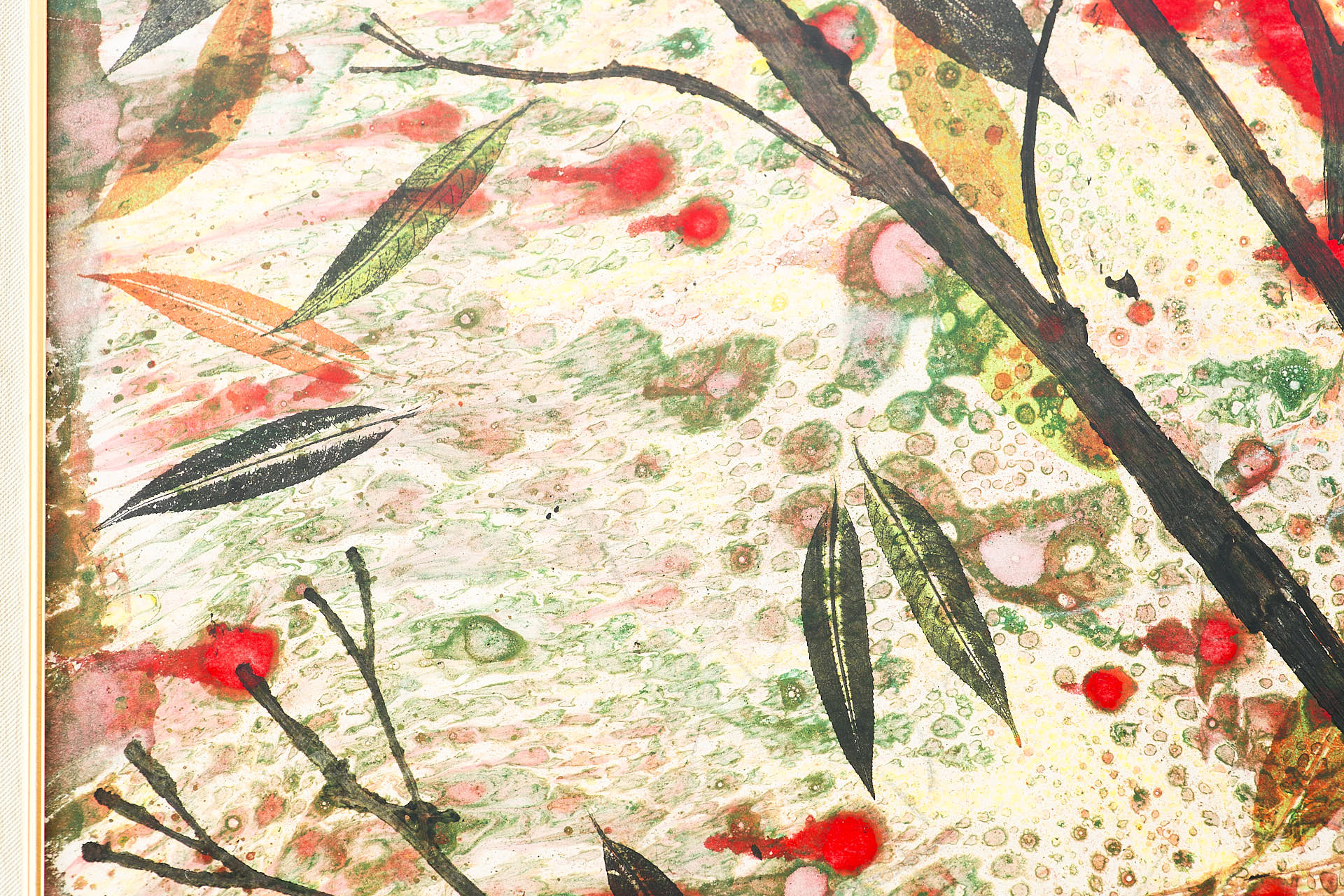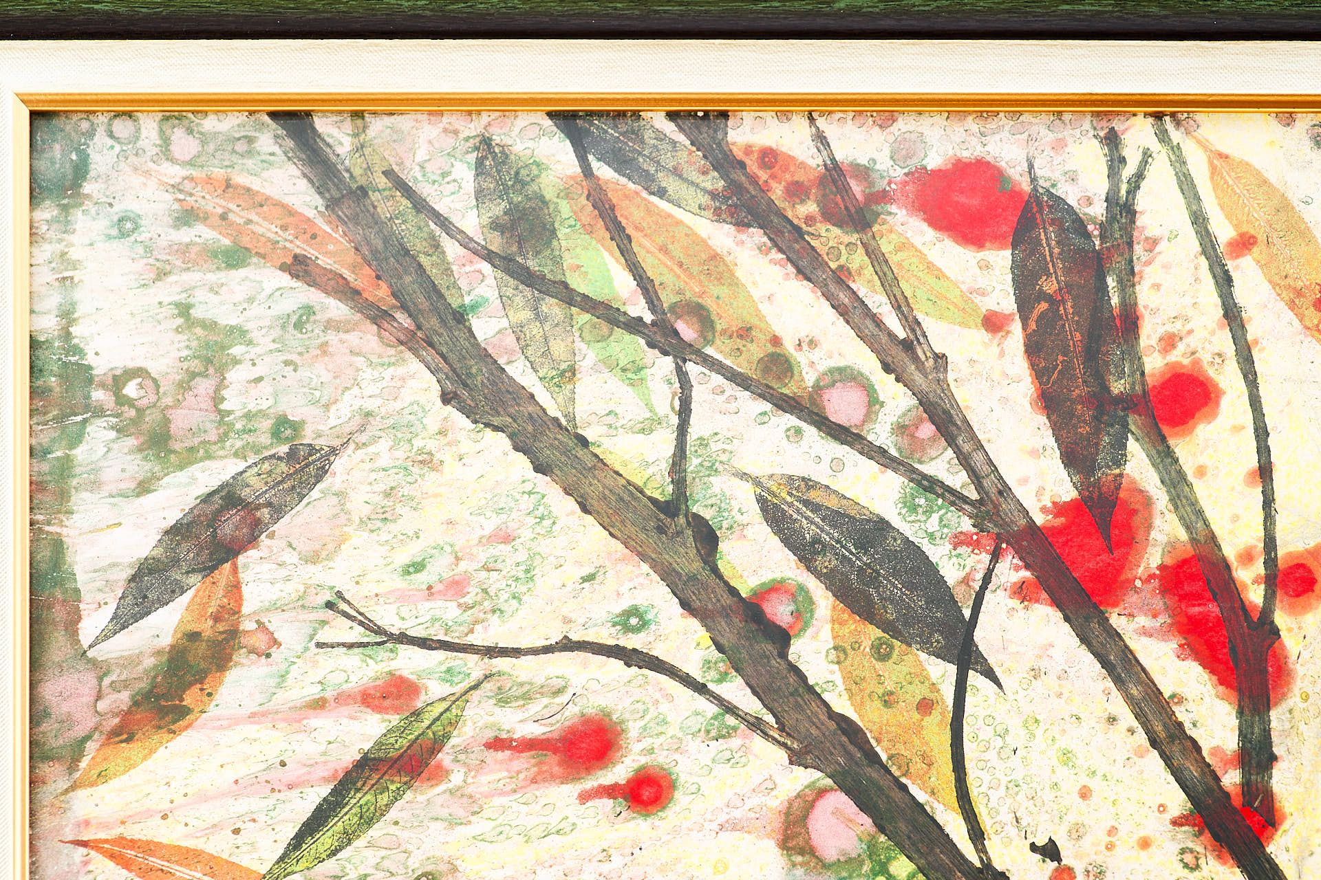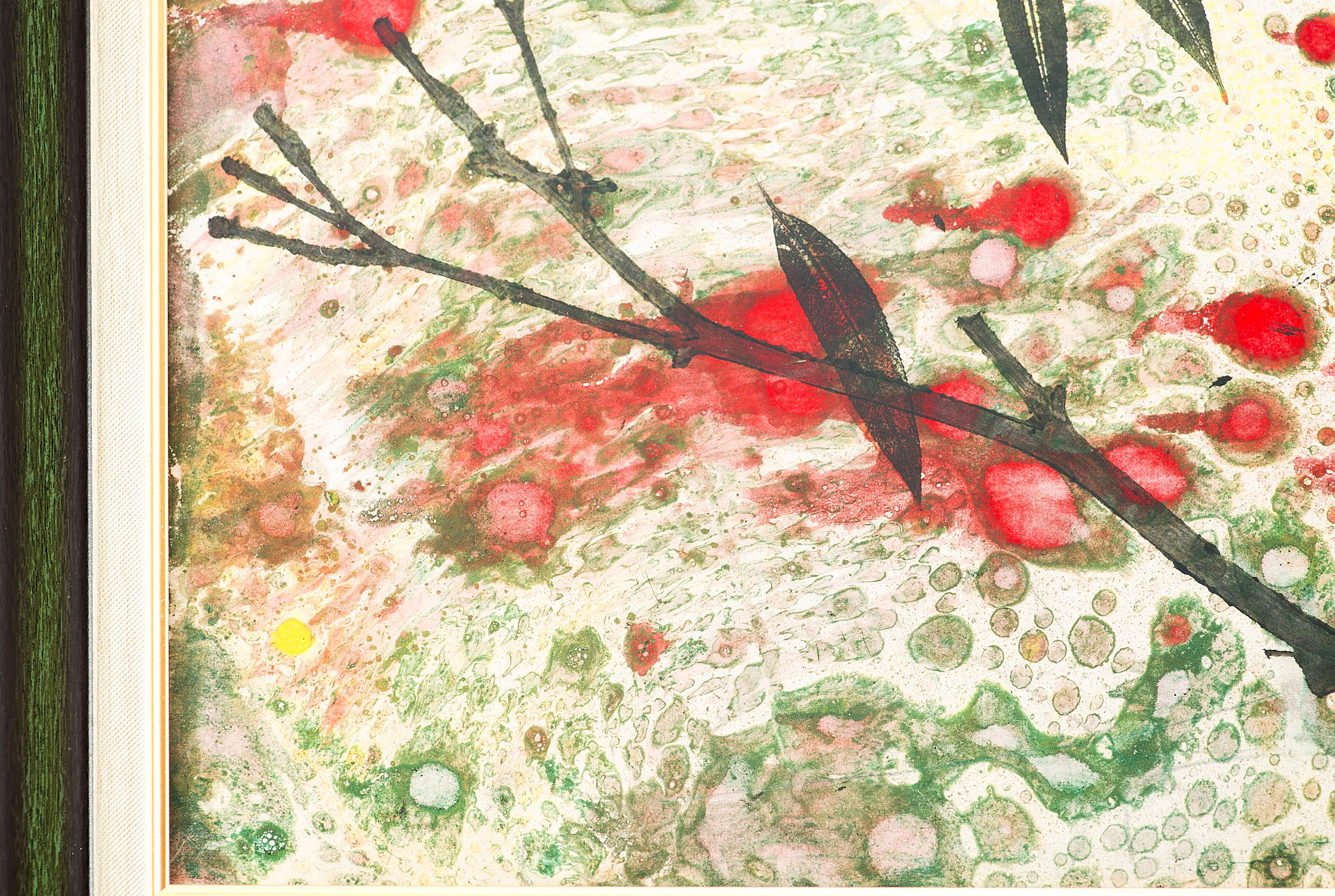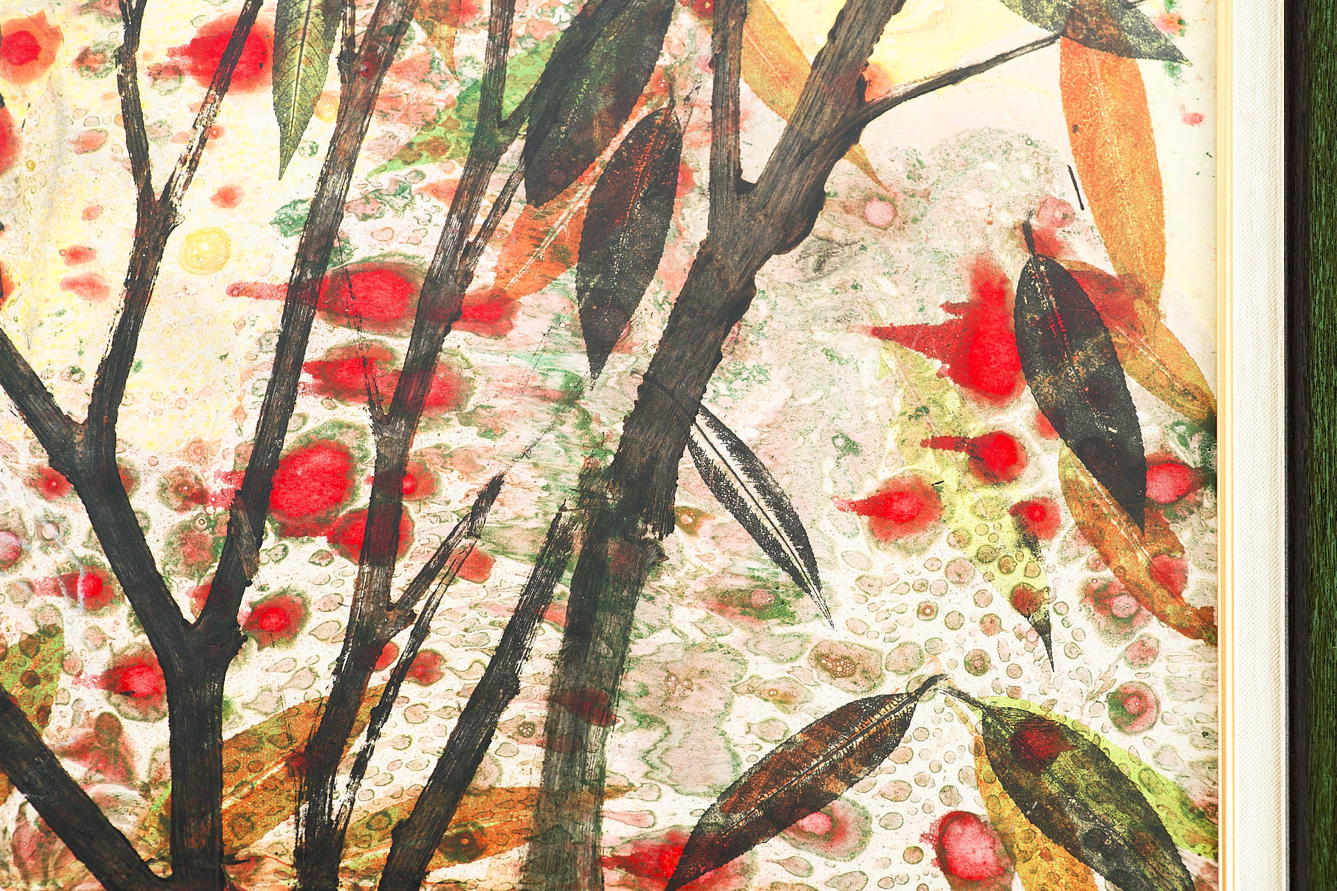 Произведение выполнено в смешанной технике на картоне, что позволило художнику соединить элементы живописи, графики и, возможно, коллажа. Фон создаёт иллюзию текучести и глубины, контрастируя с чёткими линиями ветвей и листьев. Яркие пятна ягод визуально усиливают декоративный ритм всей композиции.
