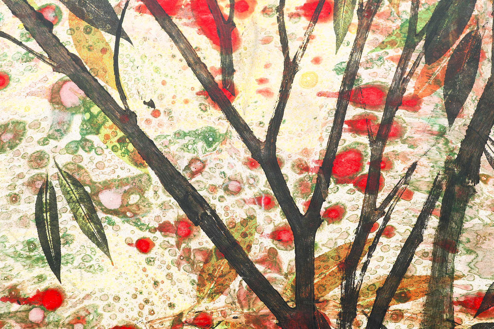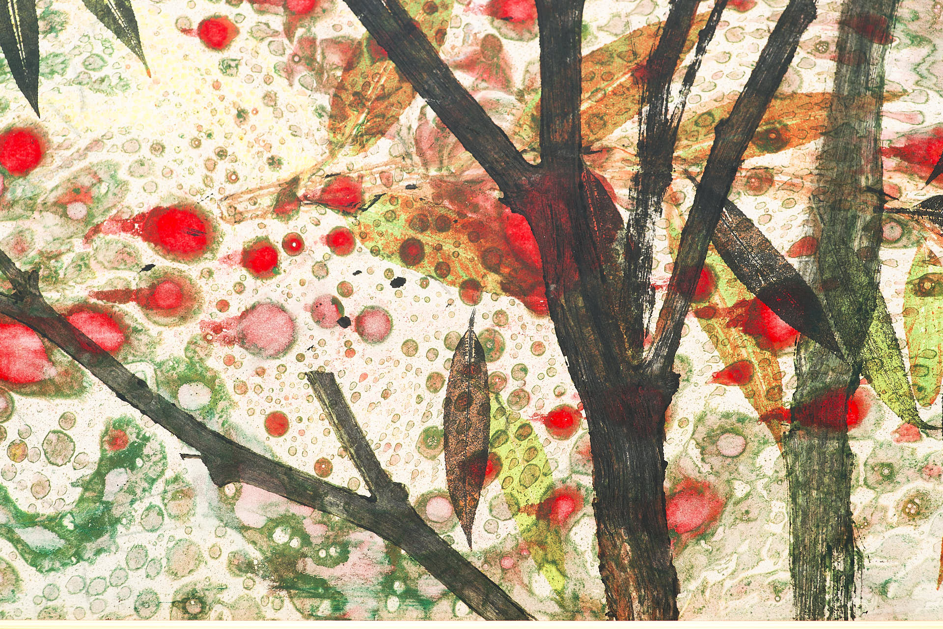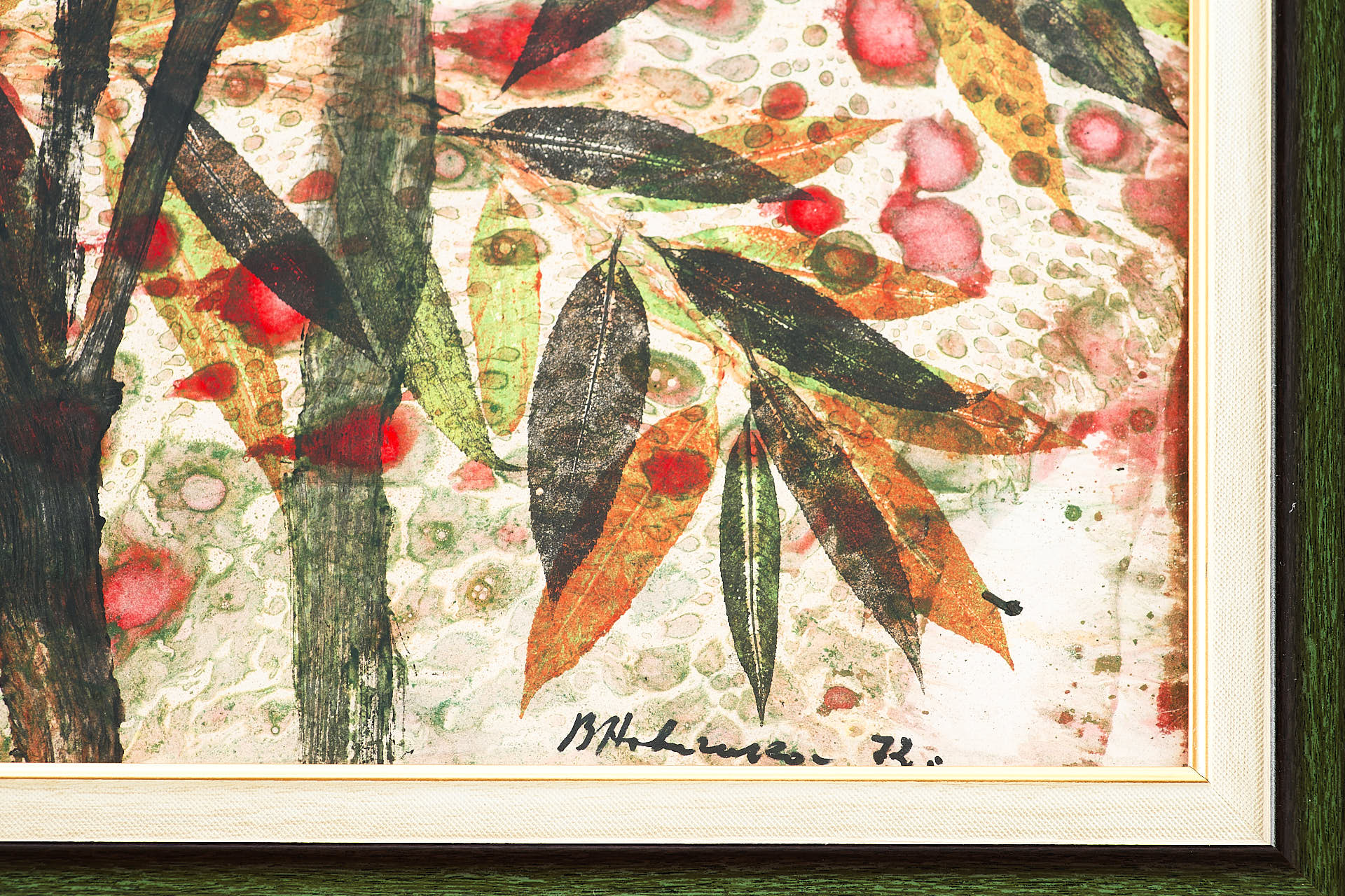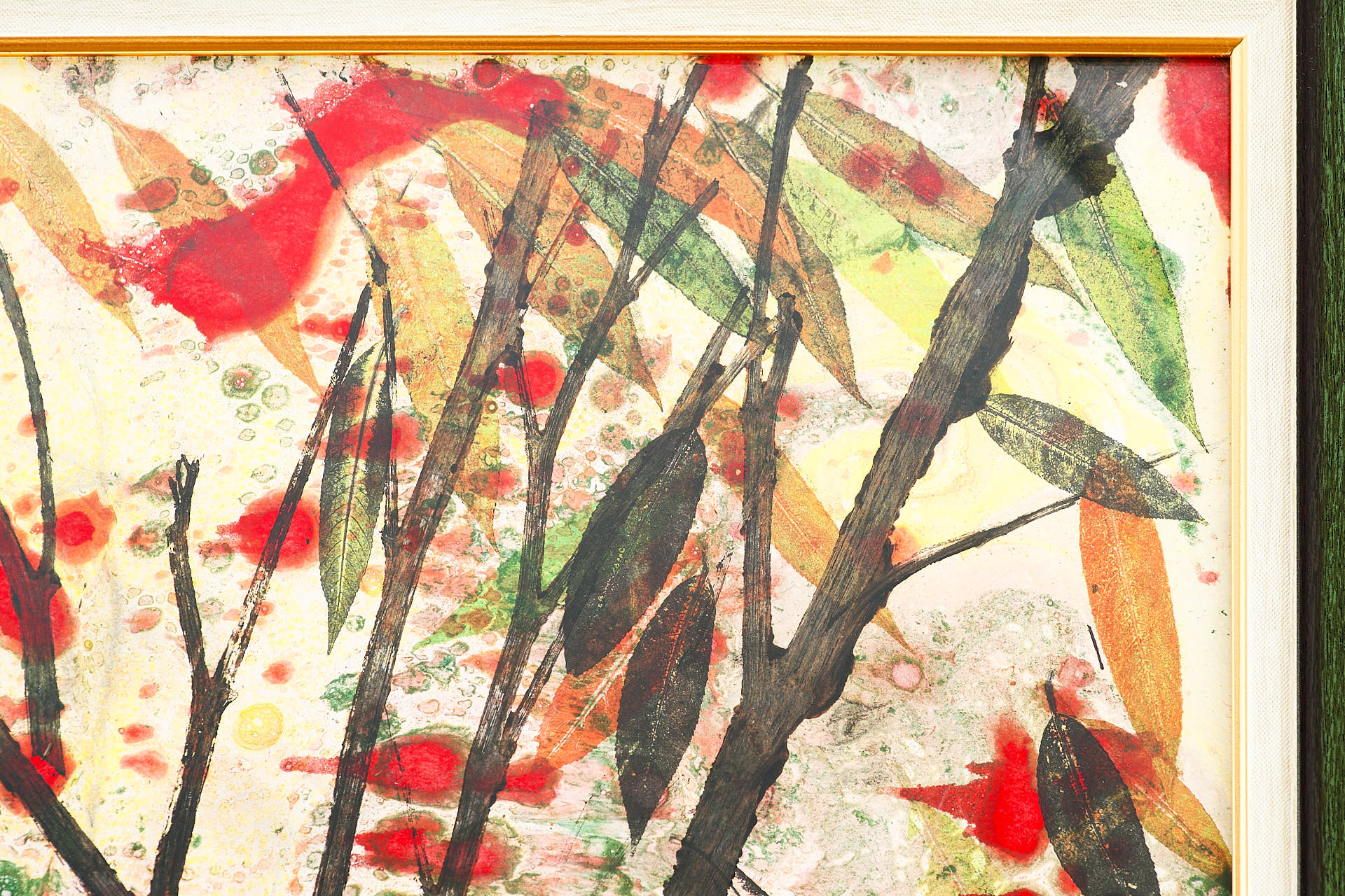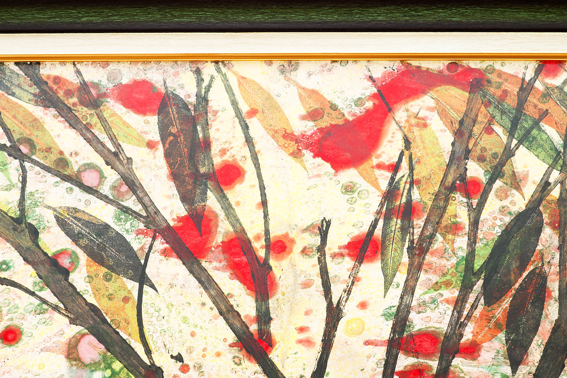 Произведение выполнено в смешанной технике на картоне, что позволило художнику соединить элементы живописи, графики и, возможно, коллажа. Фон создаёт иллюзию текучести и глубины, контрастируя с чёткими линиями ветвей и листьев. Яркие пятна ягод визуально усиливают декоративный ритм всей композиции.