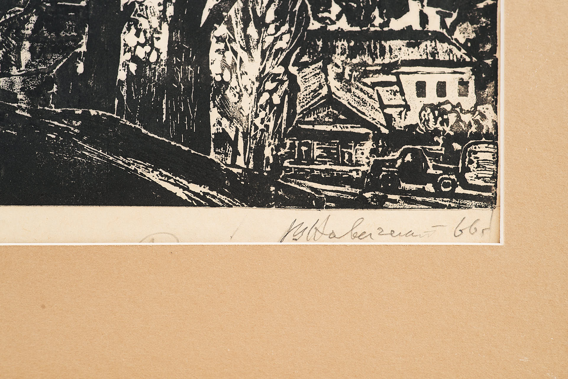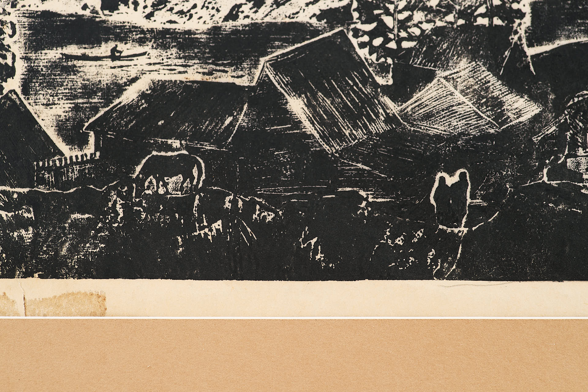 Произведение выполнено в технике линогравюры, что придаёт ему характерную резкость линий, контрастность и декоративную насыщенность. За счёт контраста чёрного и белого автор добивается сильного визуального эффекта: скалы кажутся почти рельефными, дома — вросшими в землю, а деревья и человеческие фигуры — крохотными и уязвимыми перед величием природы.
