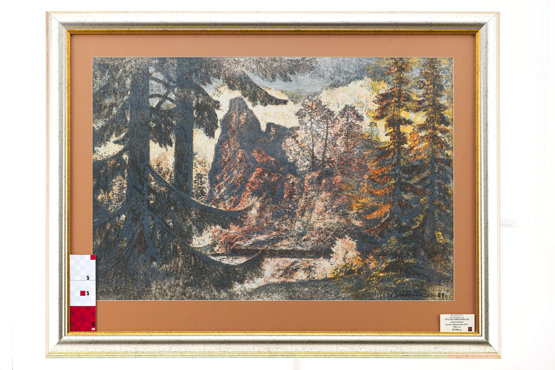 Графическая работа «Уральский пейзаж» выполнена Валентином Алексеевичем Новиченко в 1982 году в технике линогравюры. Размер произведения – 47 × 70 см. Это оригинальная печатная графика, в которой художник передаёт величие и атмосферу уральской природы.