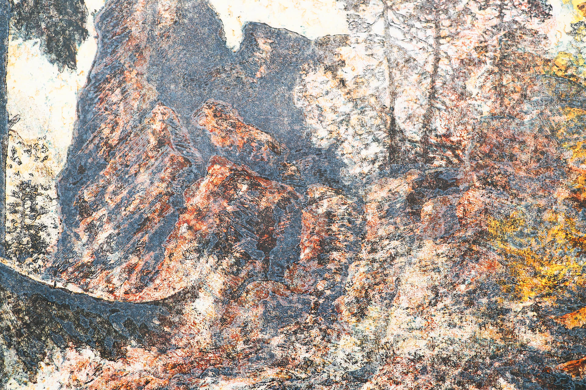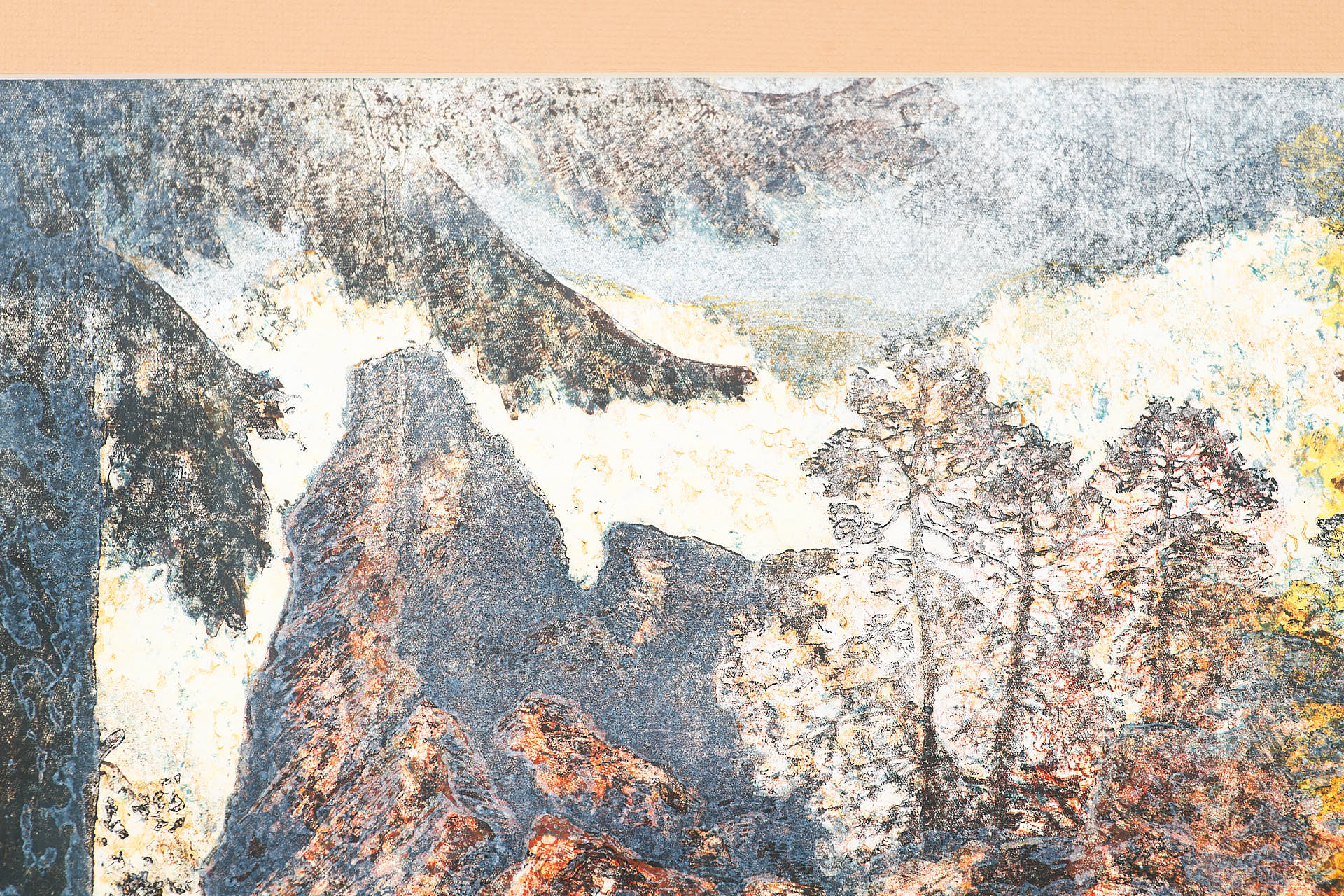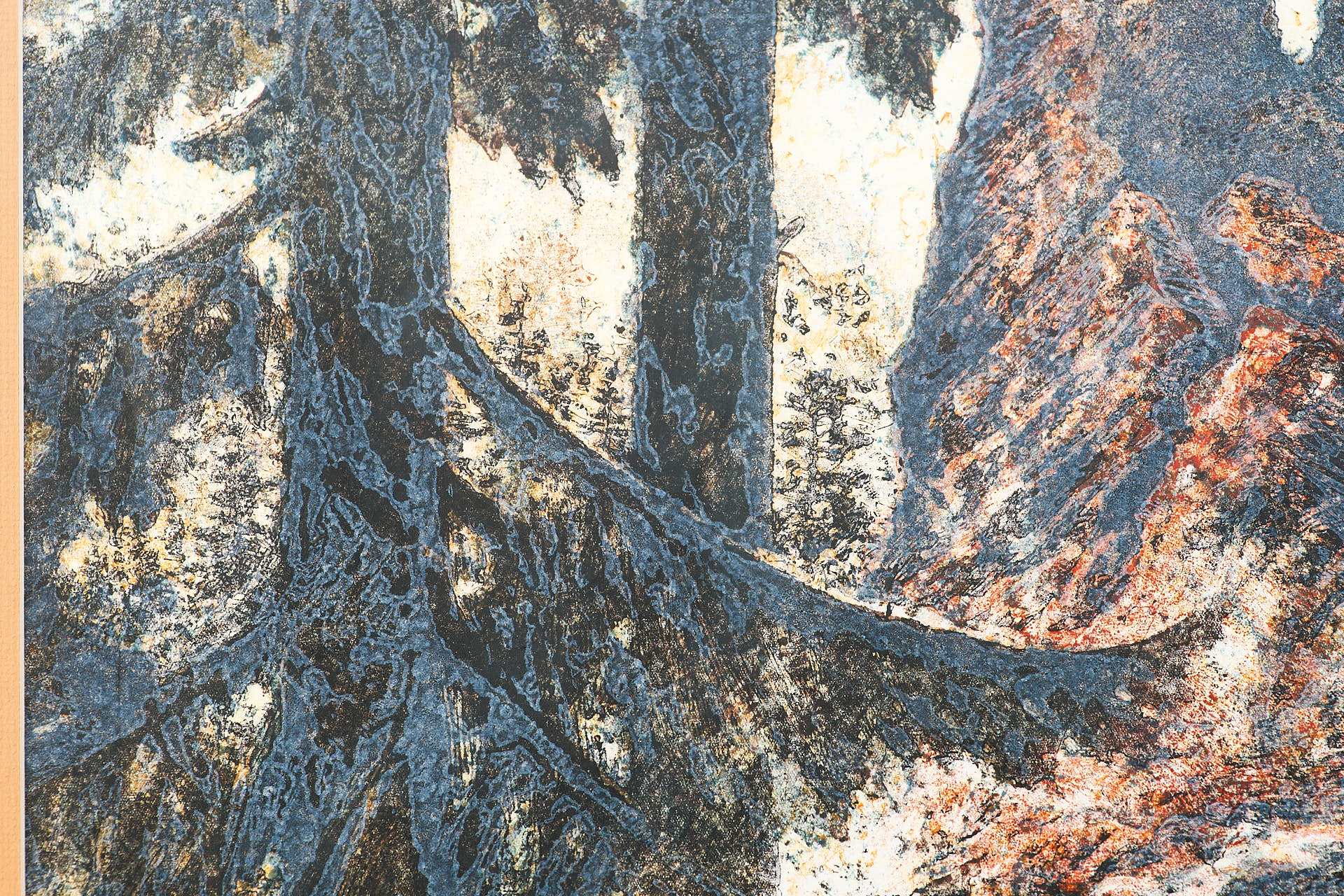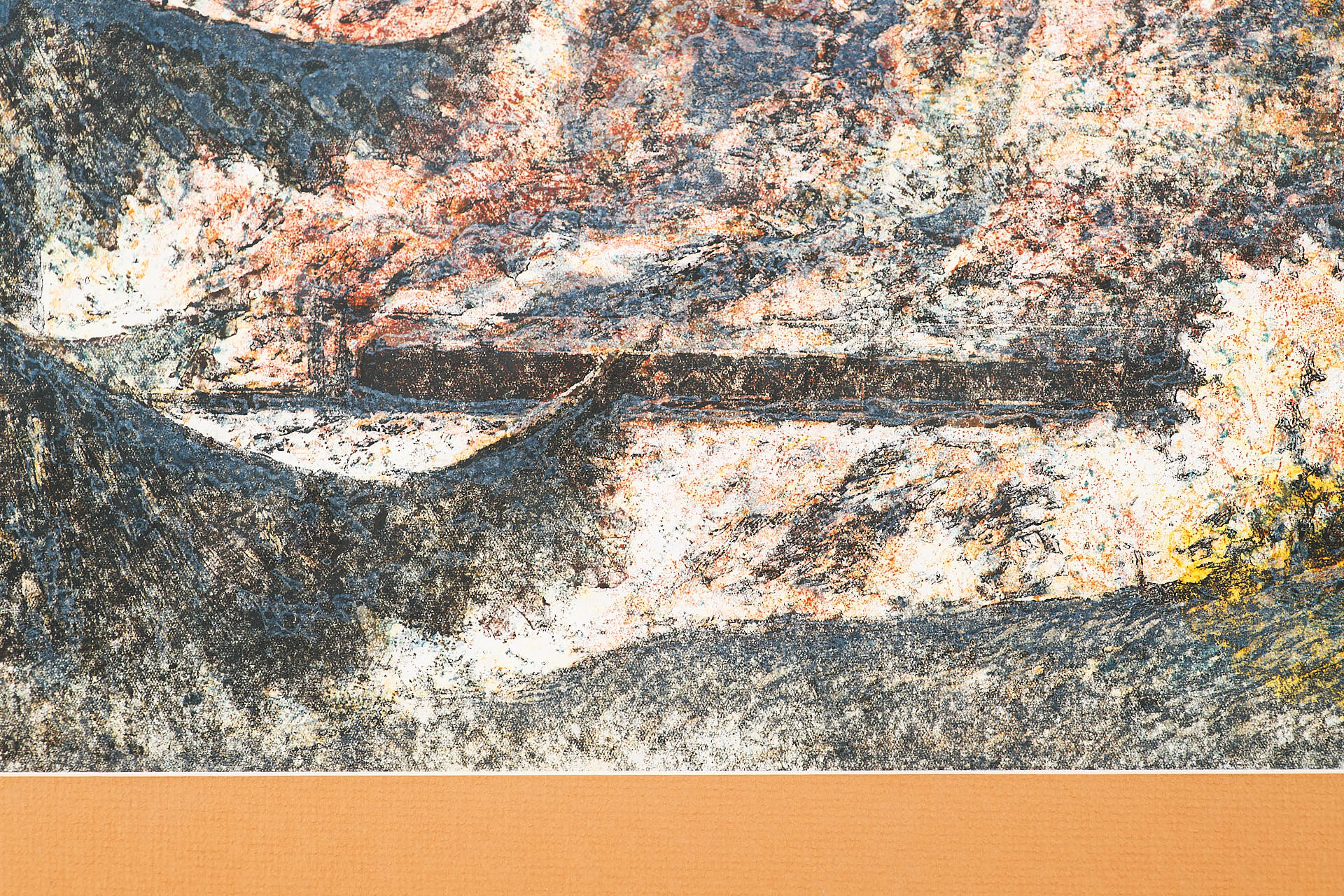 Линогравюра – техника высокой печати, позволяющая создавать выразительные контрасты и чёткость линий. В данной работе мастерски проработаны силуэты деревьев, каменистый рельеф и задний план, на котором угадываются силуэты индустриального города.