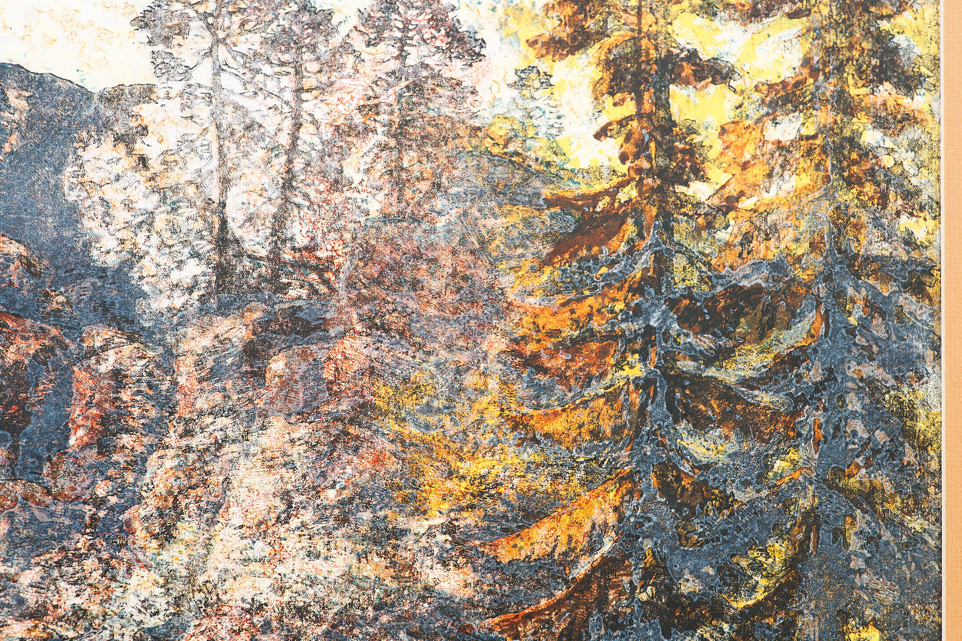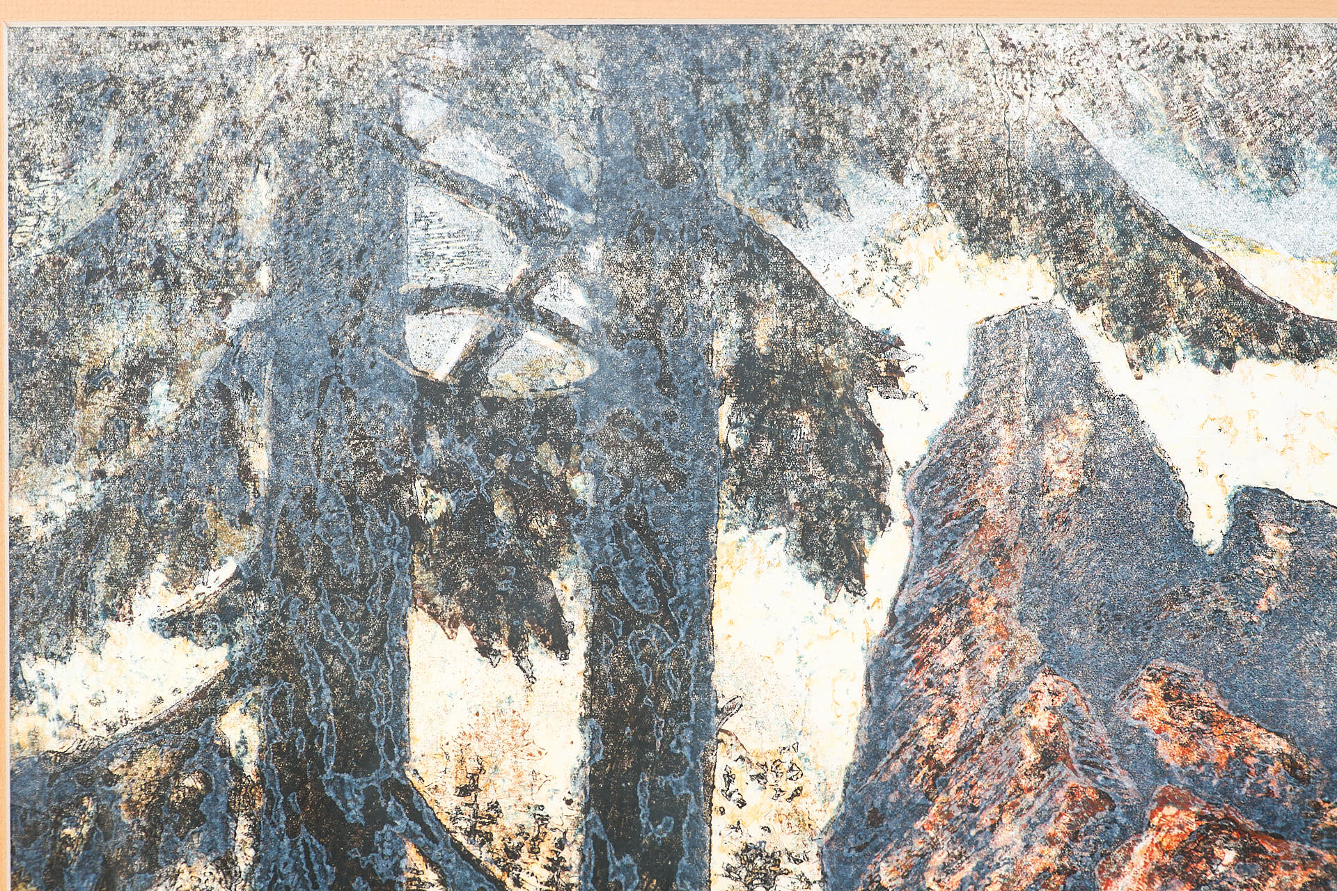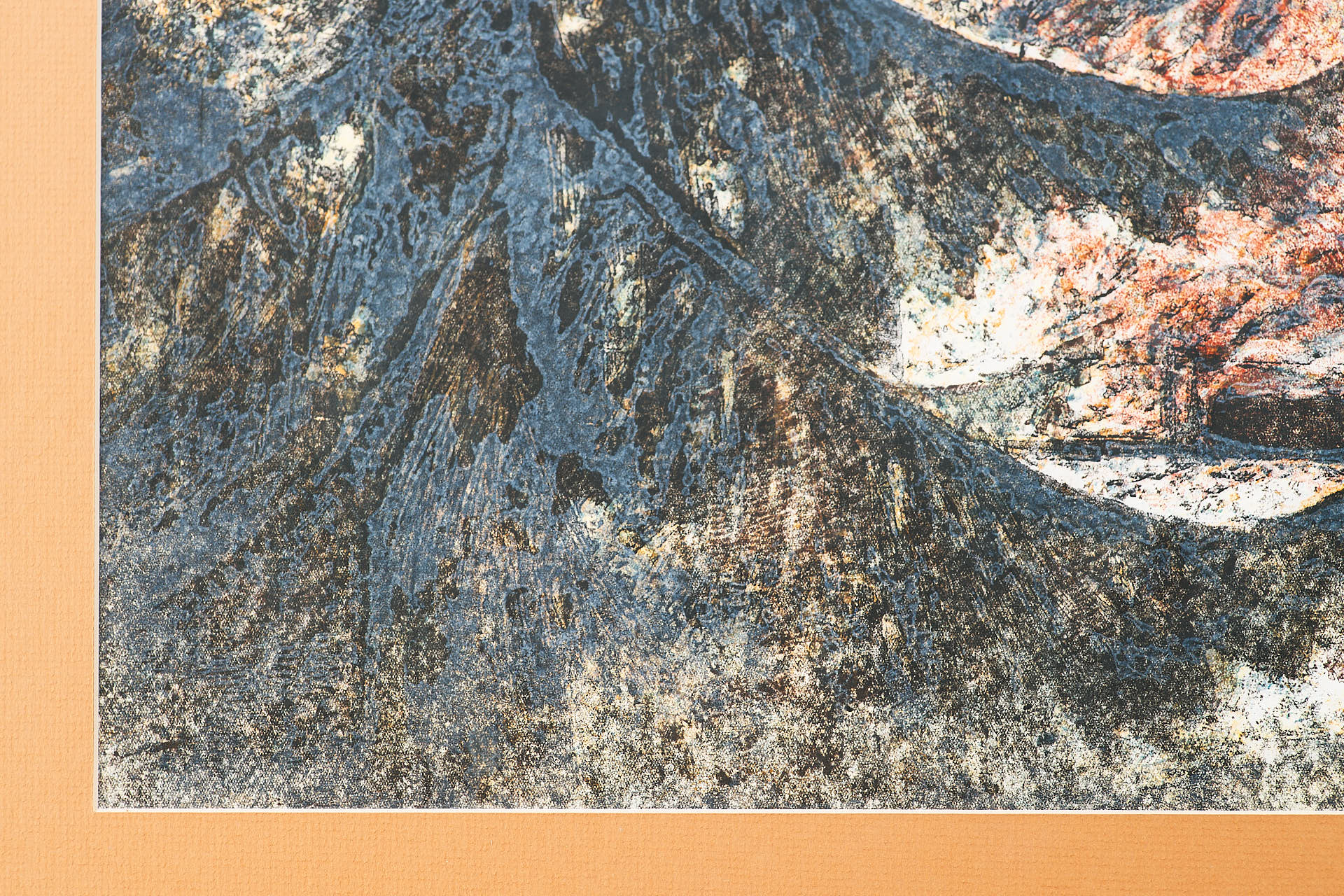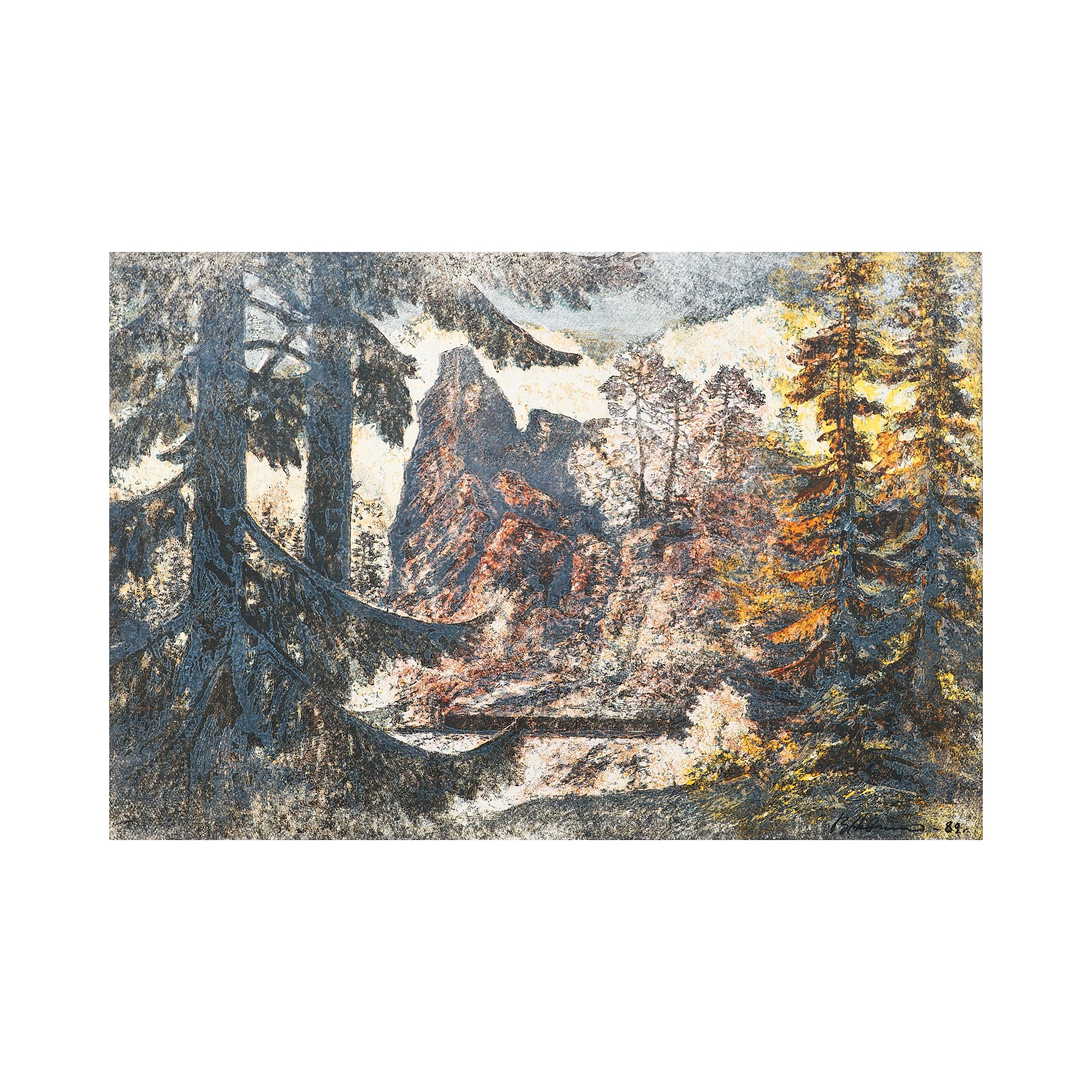 Линогравюра – техника высокой печати, позволяющая создавать выразительные контрасты и чёткость линий. В данной работе мастерски проработаны силуэты деревьев, каменистый рельеф и задний план, на котором угадываются силуэты индустриального города.