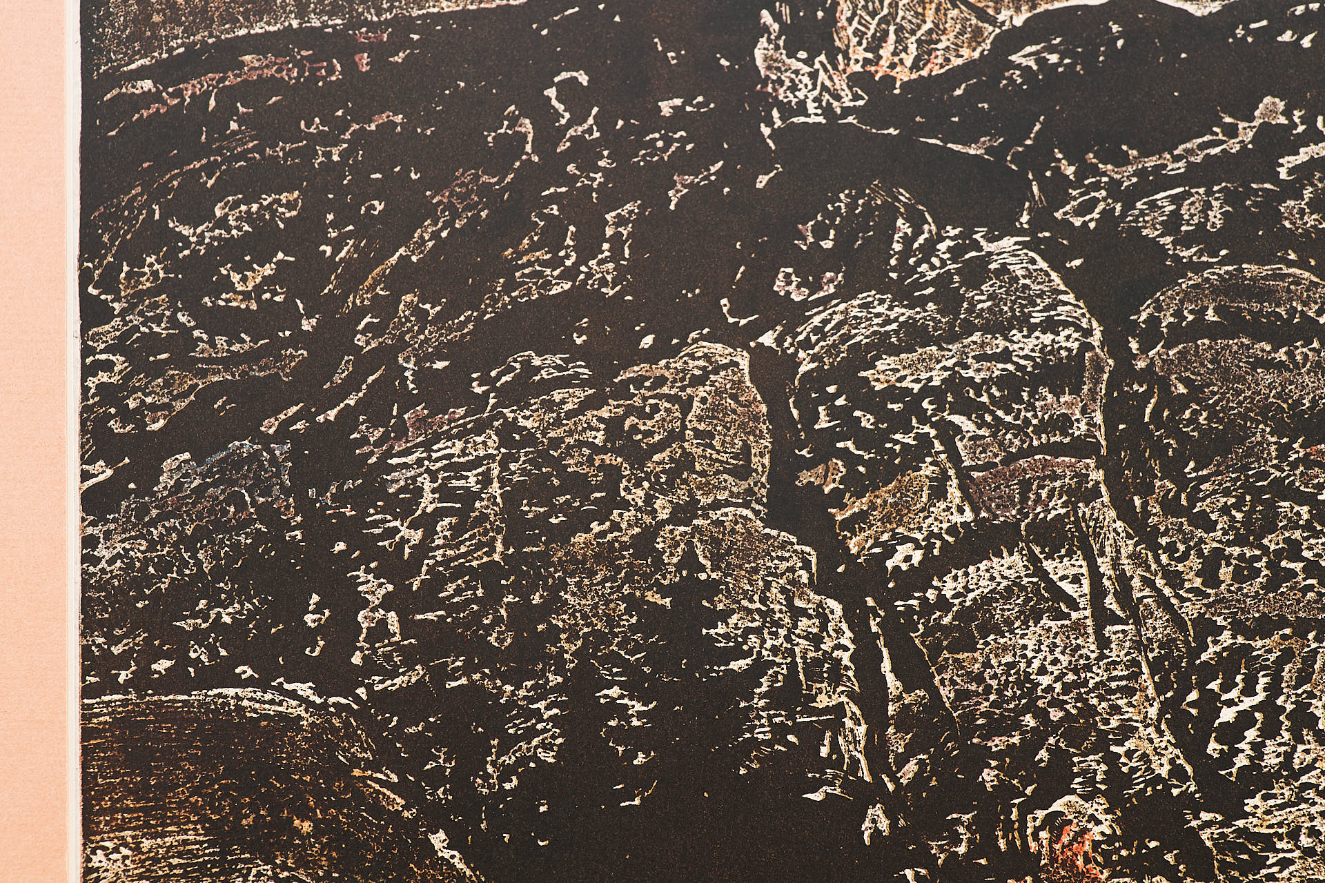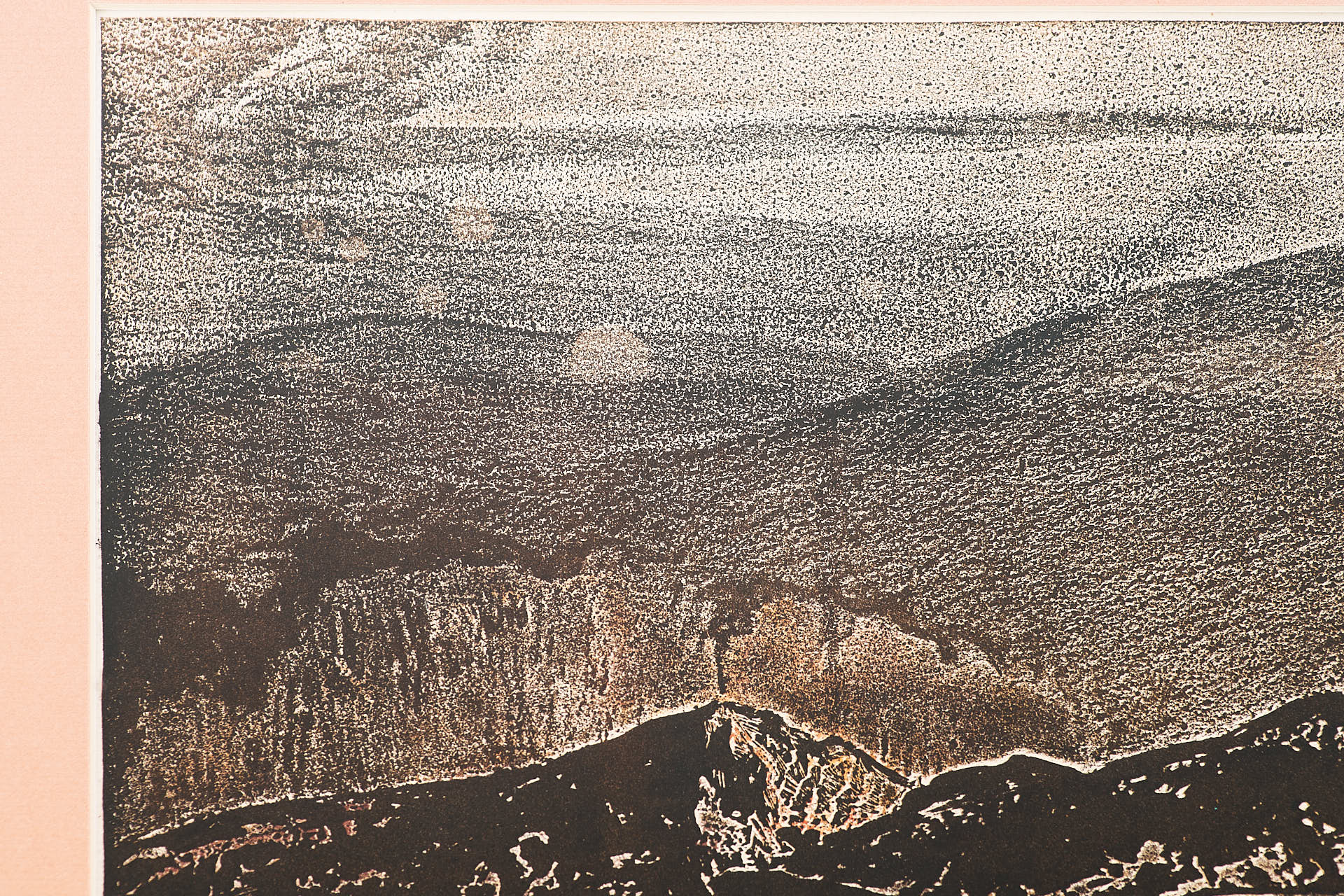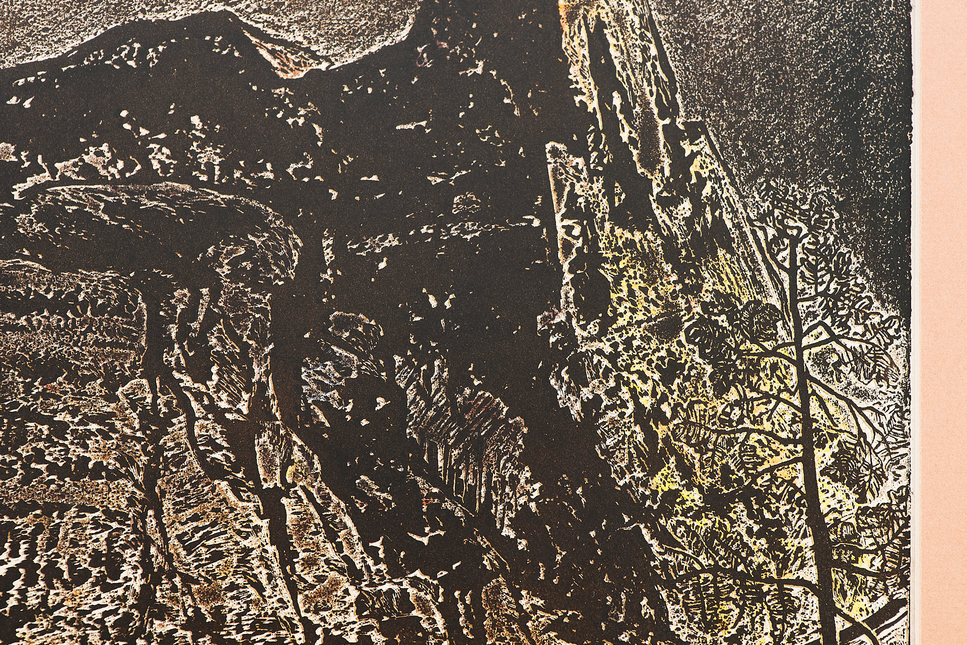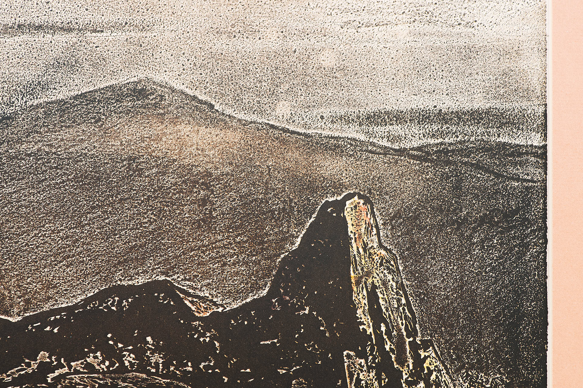 Офорт – техника глубокой печати, позволяющая передавать сложные текстуры и тонкие градации оттенков. В данной работе художник использует тонкую проработку рельефа горных массивов, создавая реалистичный и выразительный пейзаж.