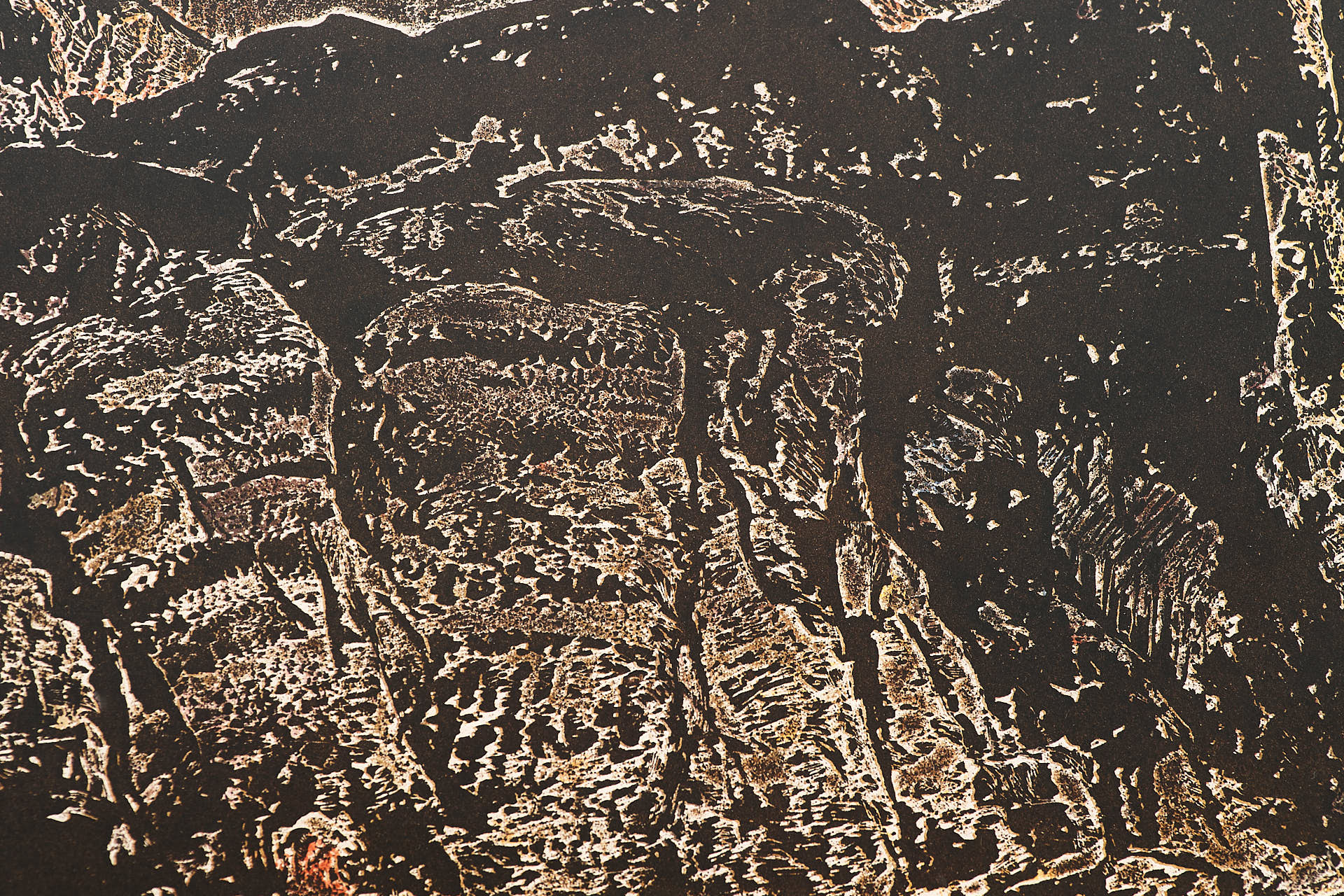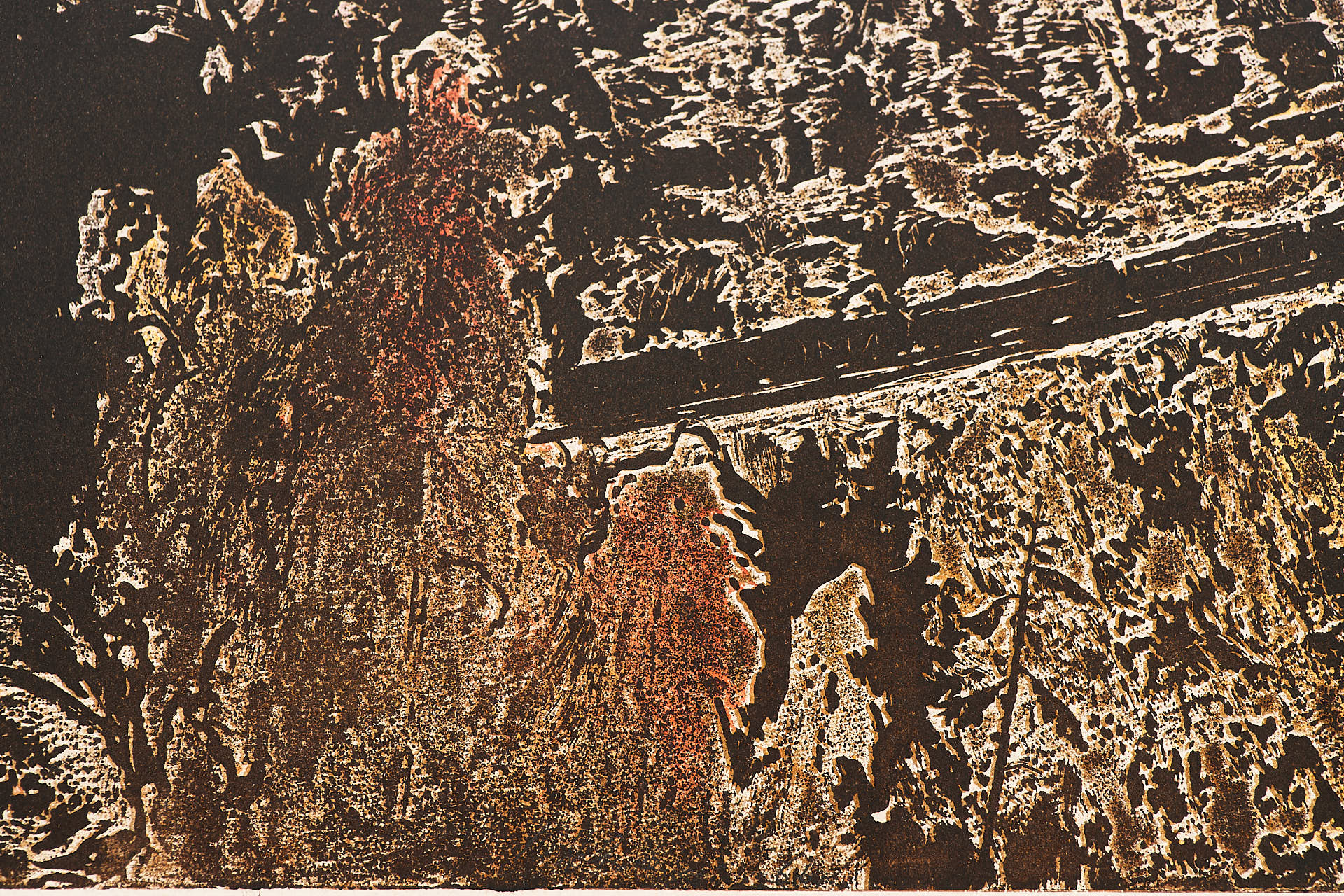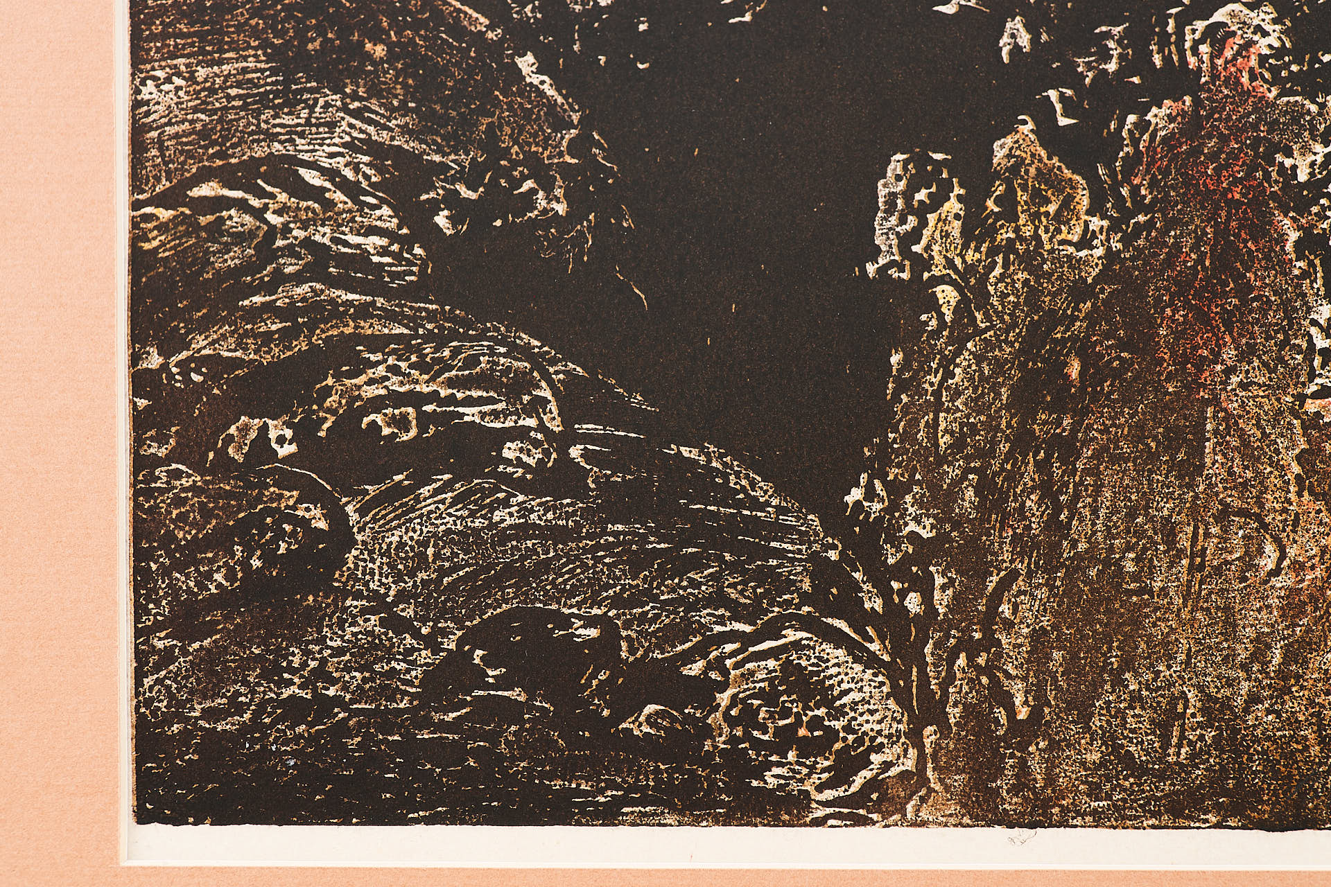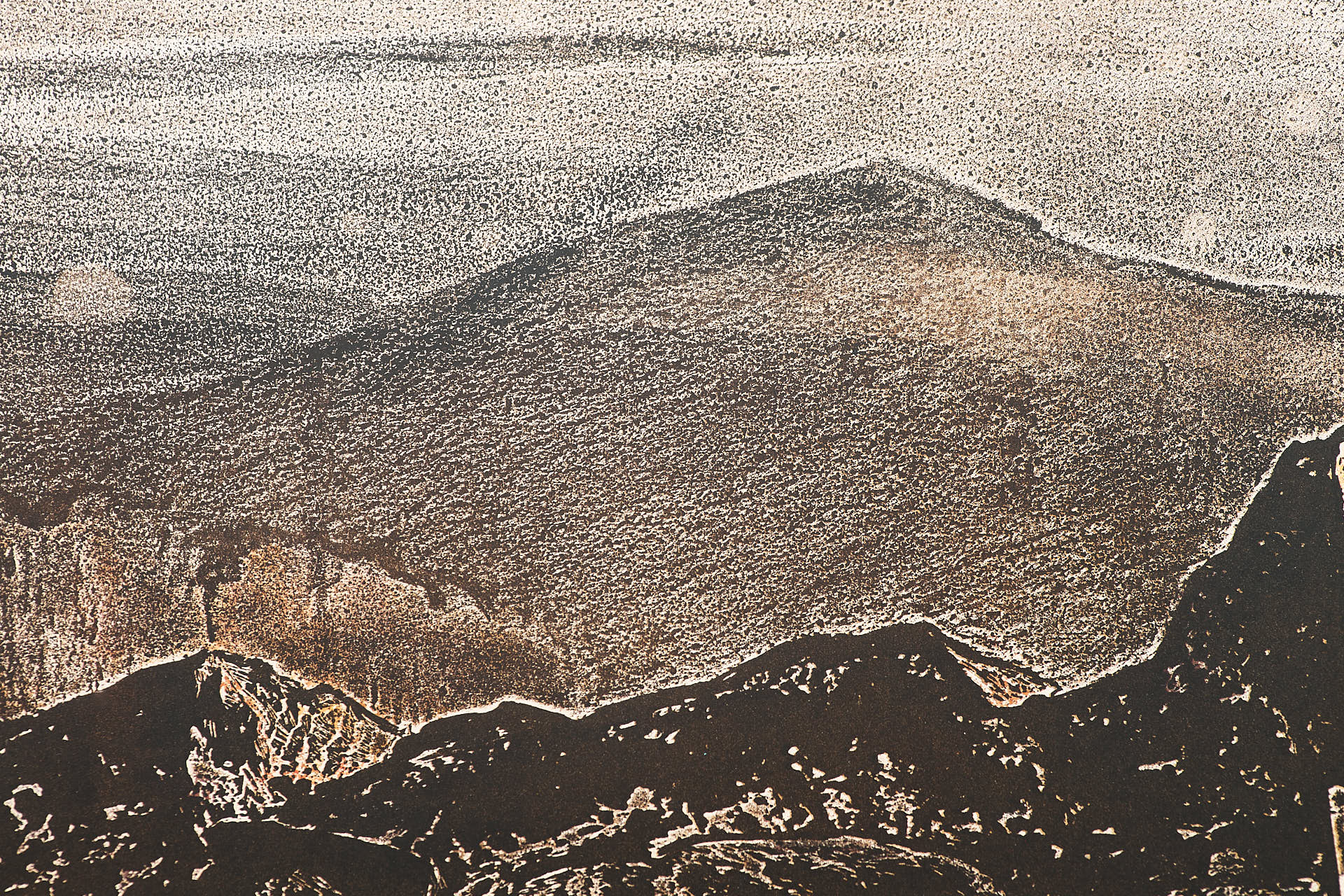 Офорт – техника глубокой печати, позволяющая передавать сложные текстуры и тонкие градации оттенков. В данной работе художник использует тонкую проработку рельефа горных массивов, создавая реалистичный и выразительный пейзаж.