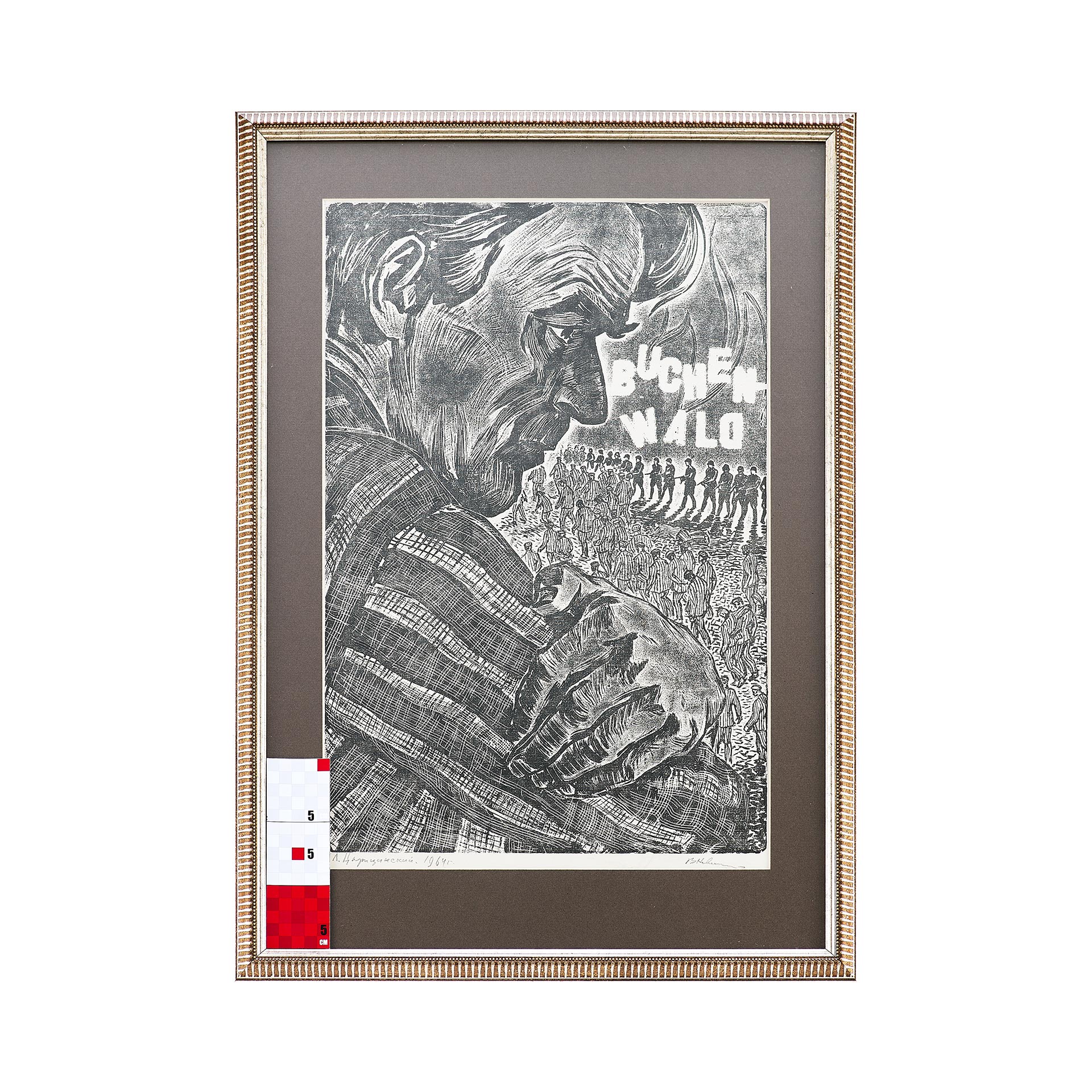 Дата создания — 1964 год, подтверждена авторскими надписями: слева — «Л. Царицинский. 1964 г.», справа — подпись «В. Новиченко». Также по фону нанесена надпись «Buchenwald» — немецкий концентрационный лагерь, символ ужаса и трагедии XX века.