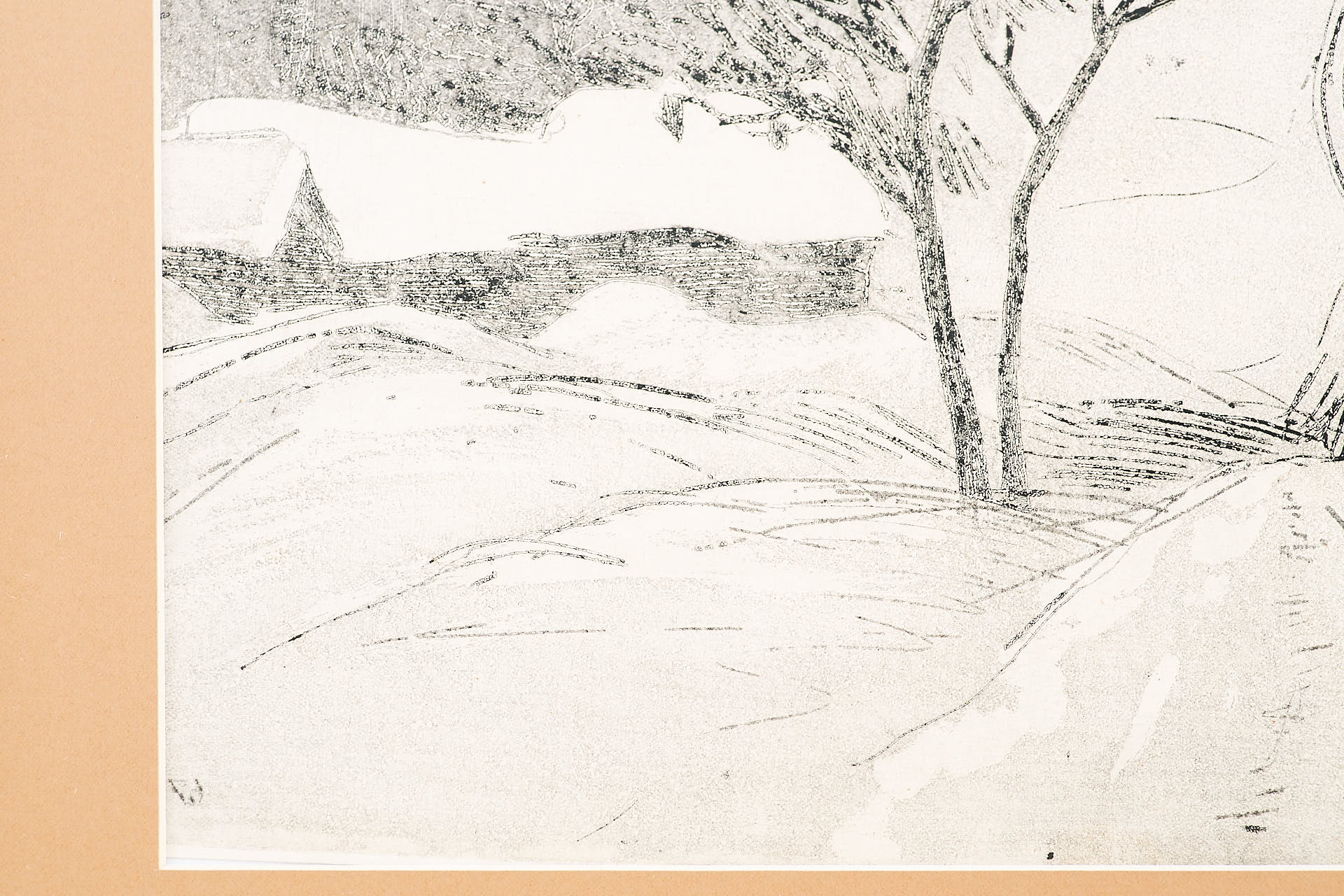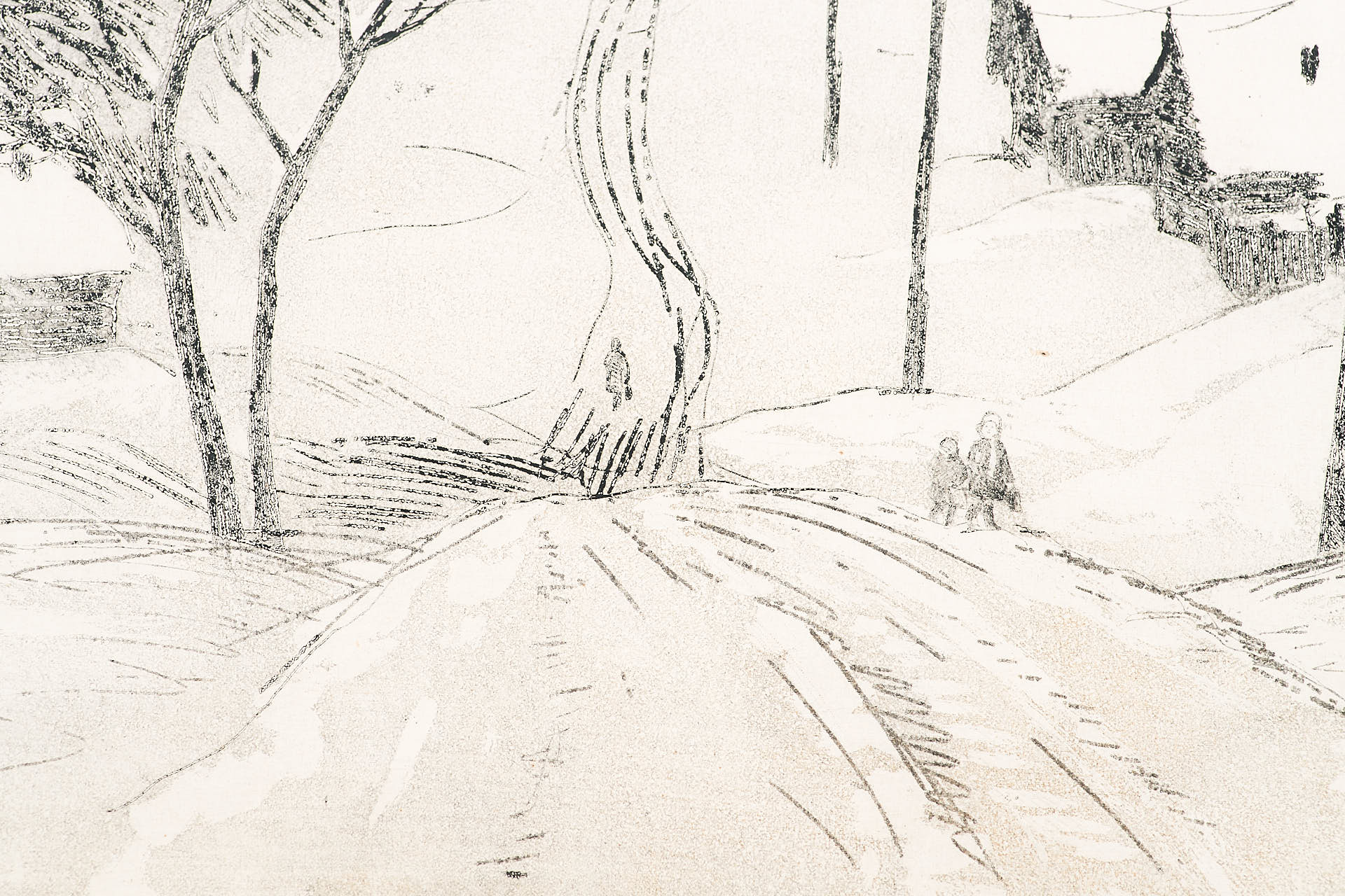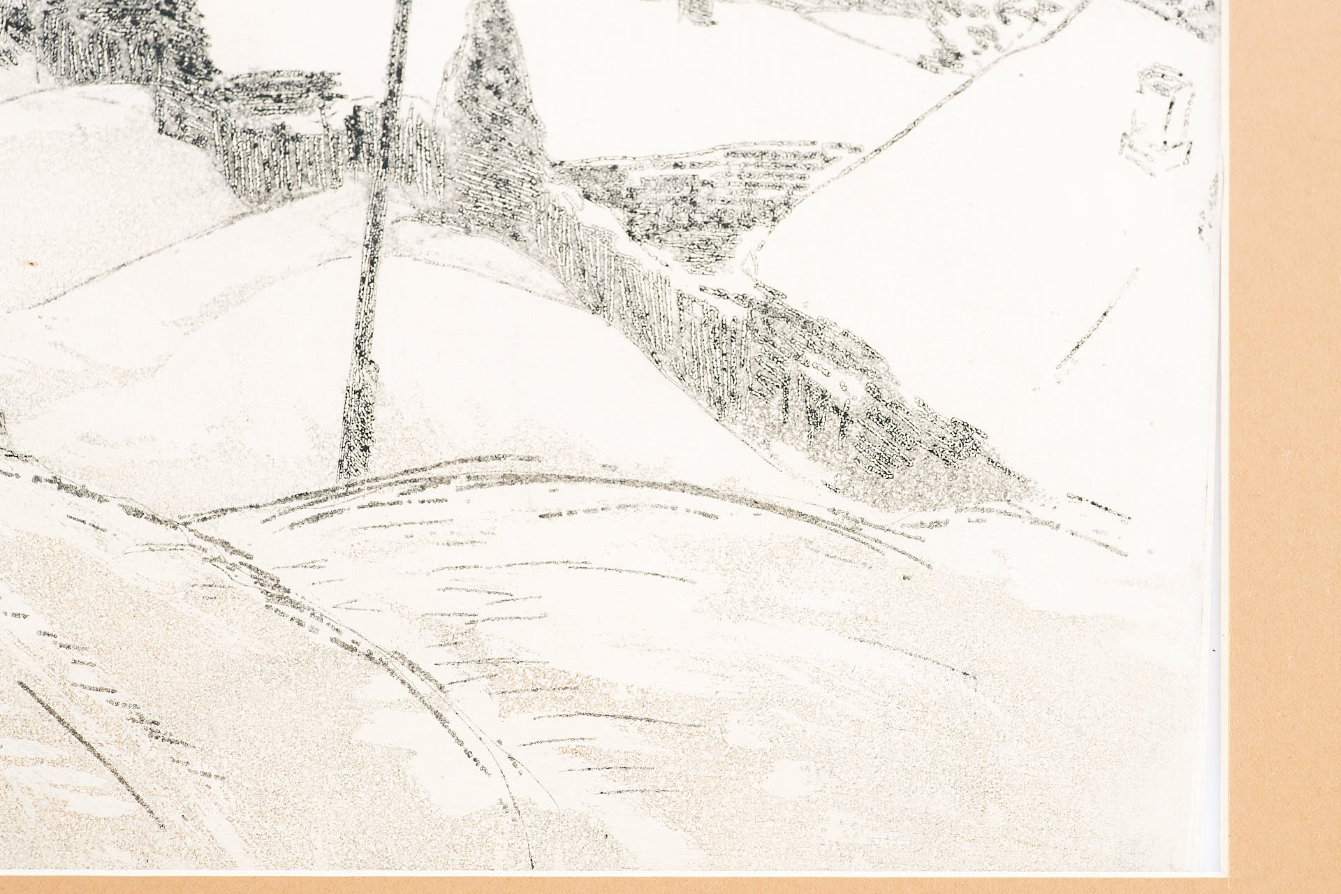 Работа исполнена в технике офорта, что позволило художнику добиться мягкой тональной градации и высокой детализации. Лёгкая, точечная штриховка создает эффект воздушной перспективы и зимней тишины. Контуры снежных покровов и архитектурных элементов выполнены с минимализмом, но при этом с предельной точностью и вниманием к композиционному равновесию.