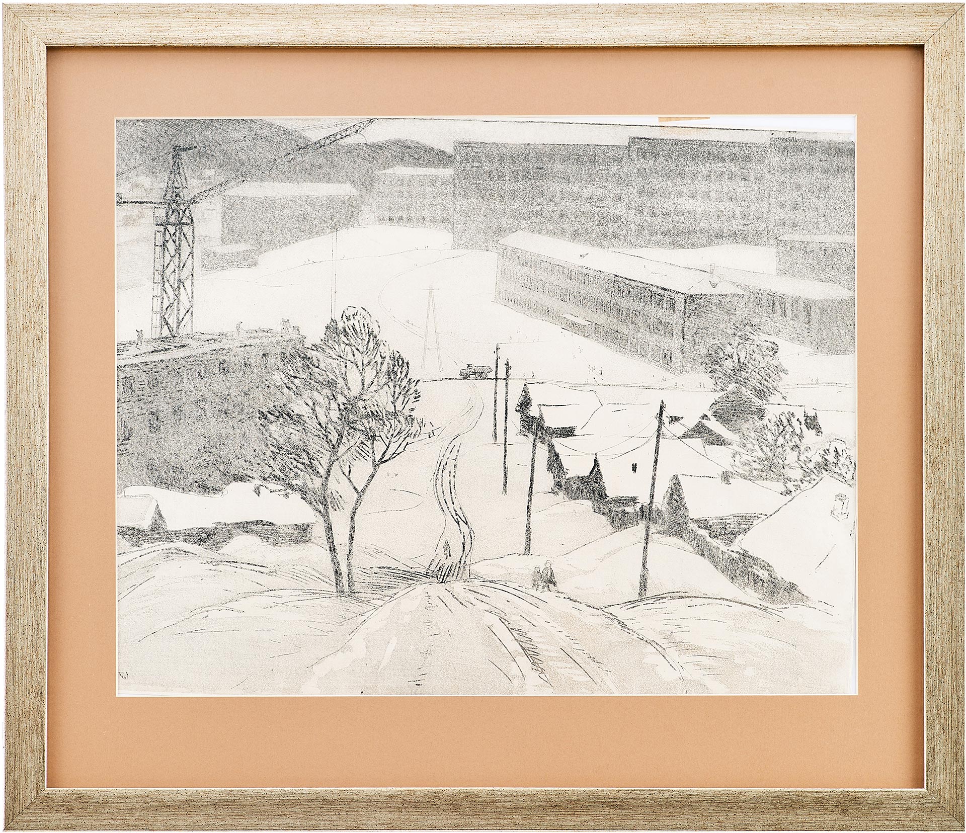 Офорт «Городской пейзаж» Валентина Алексеевича Новиченко, выполненный в 1970 году, представляет собой тонкое и сдержанное изображение зимнего пригорода в стадии урбанистического преобразования. Композиция разворачивается с возвышенности, с которой открывается вид на спускающуюся улицу. Вдали возвышаются новые многоэтажные здания, строительные краны и промышленные постройки, тогда как на переднем плане — скатанные снегом дороги, одиночные деревья и невысокие частные дома, частично занесённые снегом.