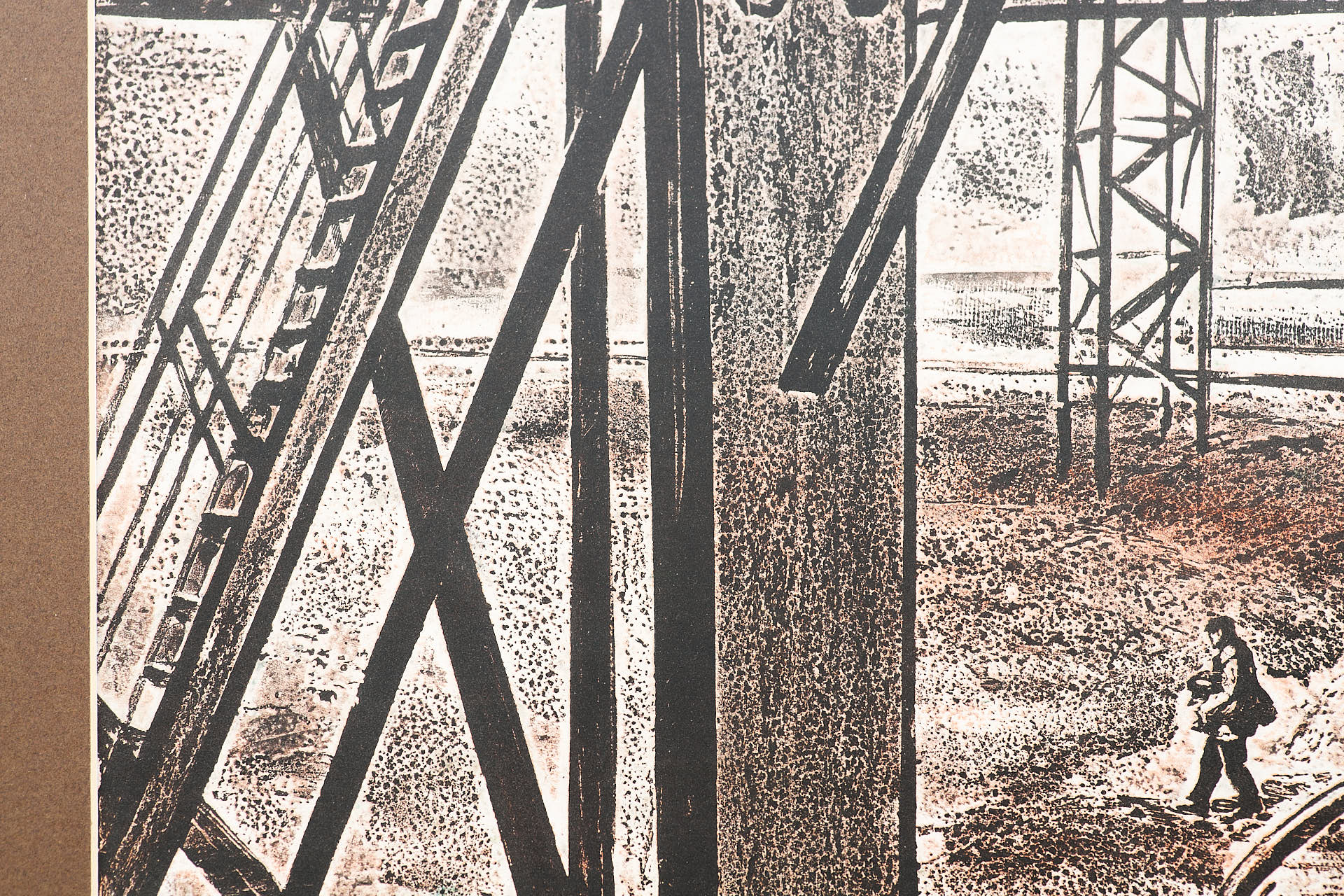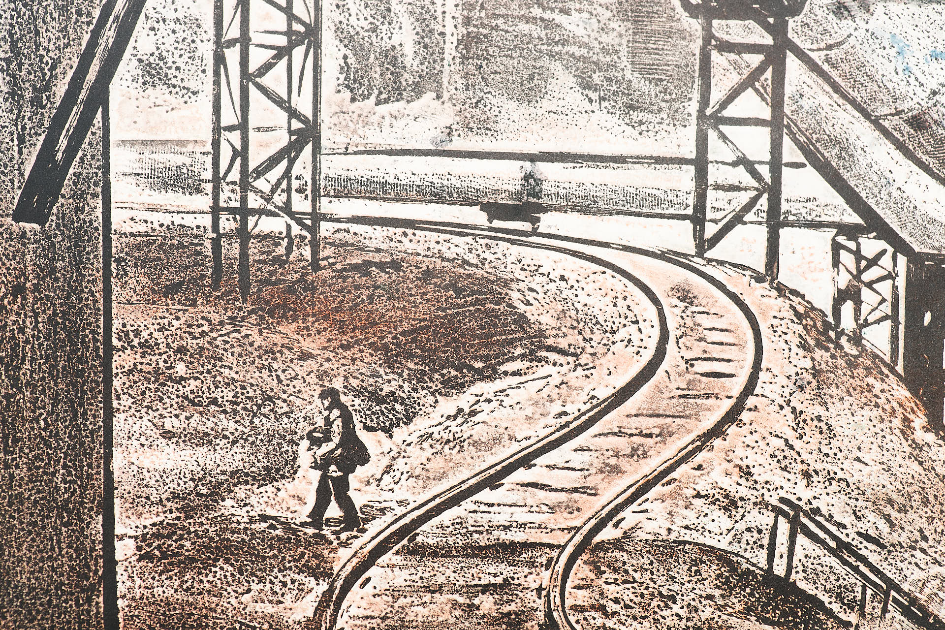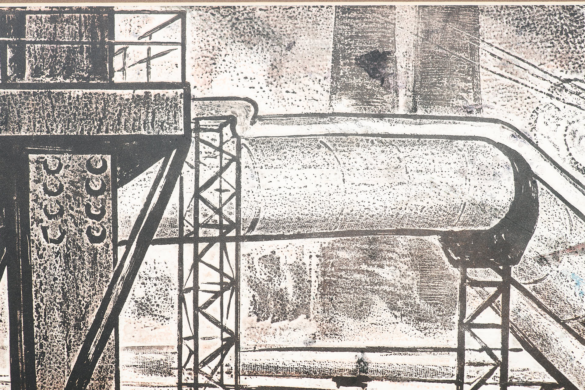 На графике изображён индустриальный пейзаж — участок металлургического комбината с трубопроводами, лестничными конструкциями и узкоколейной дорогой. Фигуры рабочих подчёркивают масштаб сооружений и добавляют динамику. Изображение выполнено с высокой детализацией, подчёркивающей индустриальный ритм.