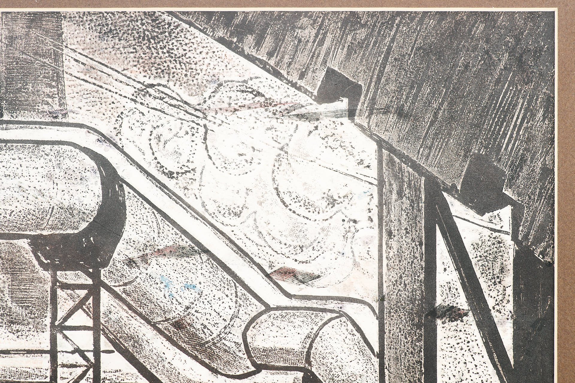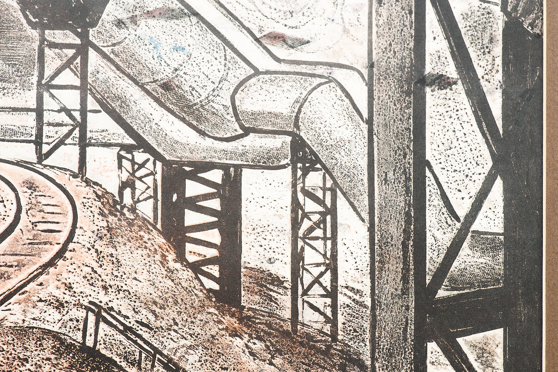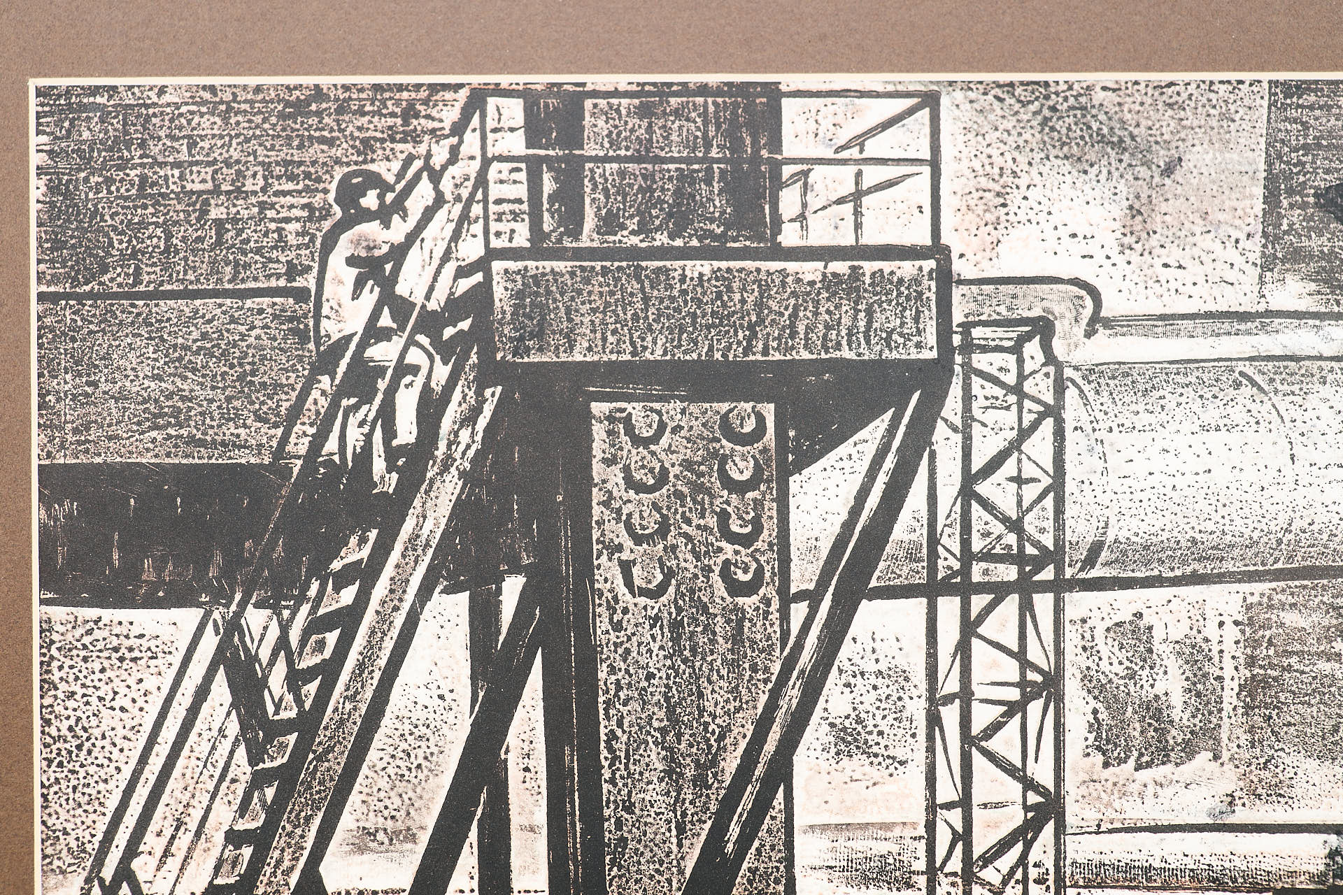 На графике изображён индустриальный пейзаж — участок металлургического комбината с трубопроводами, лестничными конструкциями и узкоколейной дорогой. Фигуры рабочих подчёркивают масштаб сооружений и добавляют динамику. Изображение выполнено с высокой детализацией, подчёркивающей индустриальный ритм.