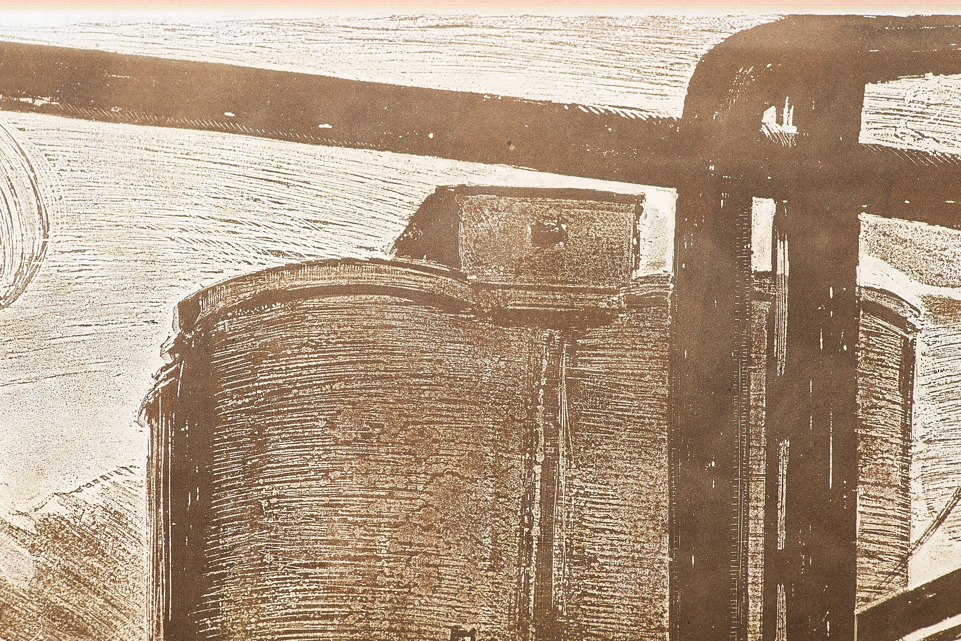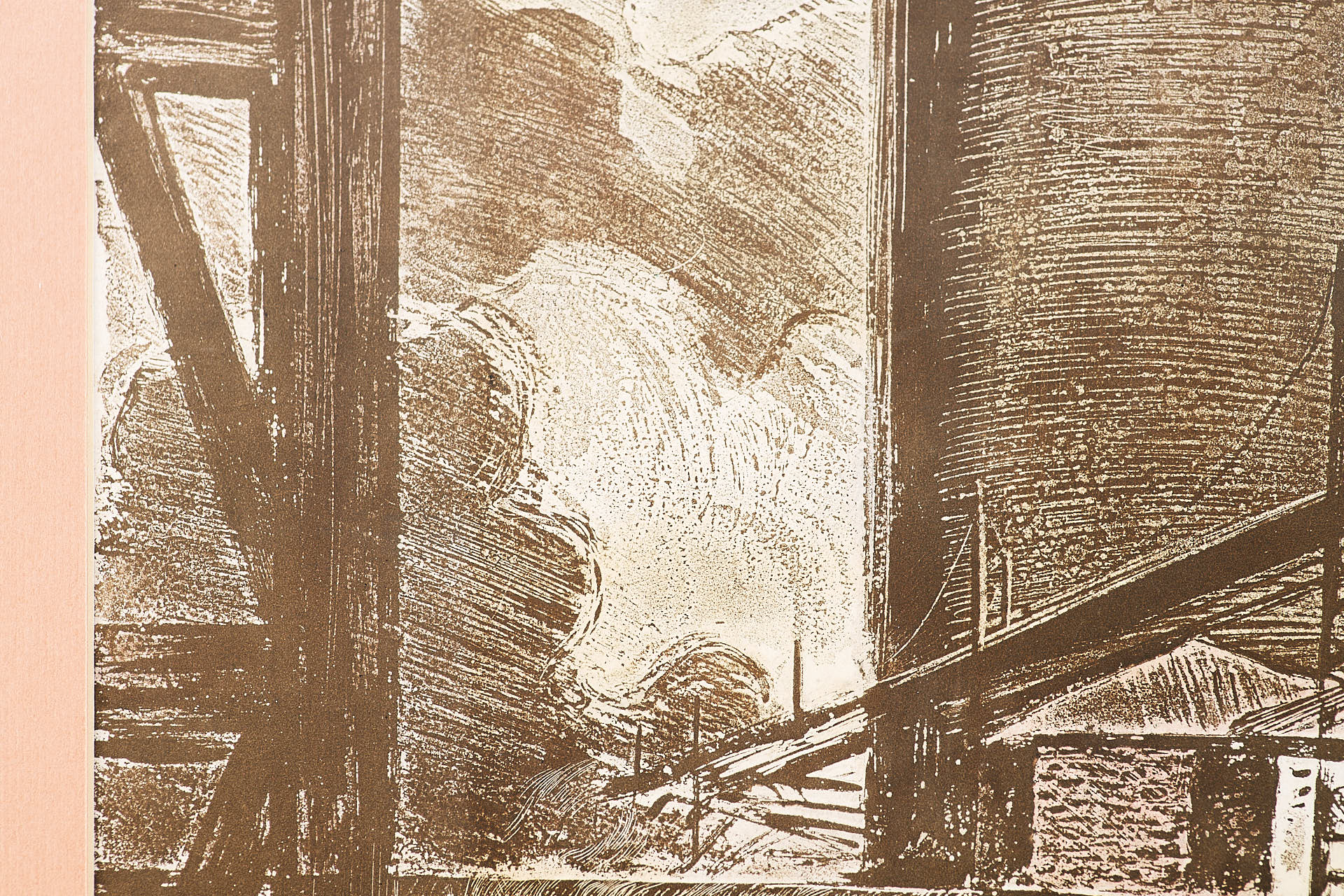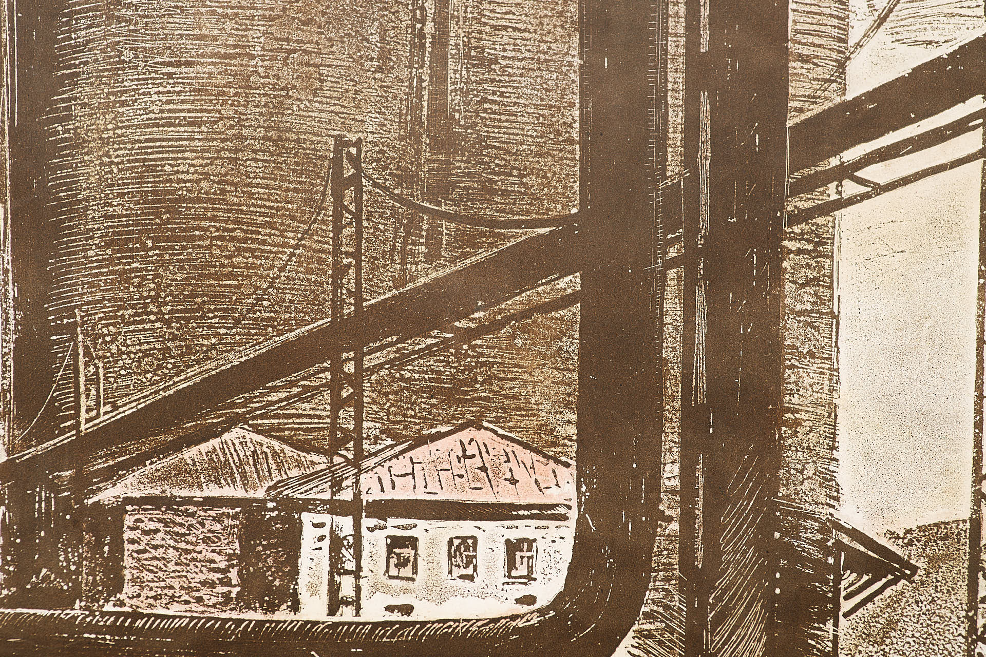 Работа выполнена в технике офорта с рельефной печатью, что позволяет художнику достигать выразительной фактуры и чёткости в передаче архитектурных и инженерных форм. Рельеф усиливает материальность объектов: грубые металлические поверхности, массив труб и башен воспринимаются почти осязаемо. Цветовая гамма выдержана в охристо-коричневых и графитовых тонах, что создаёт ощущение промышленной среды.