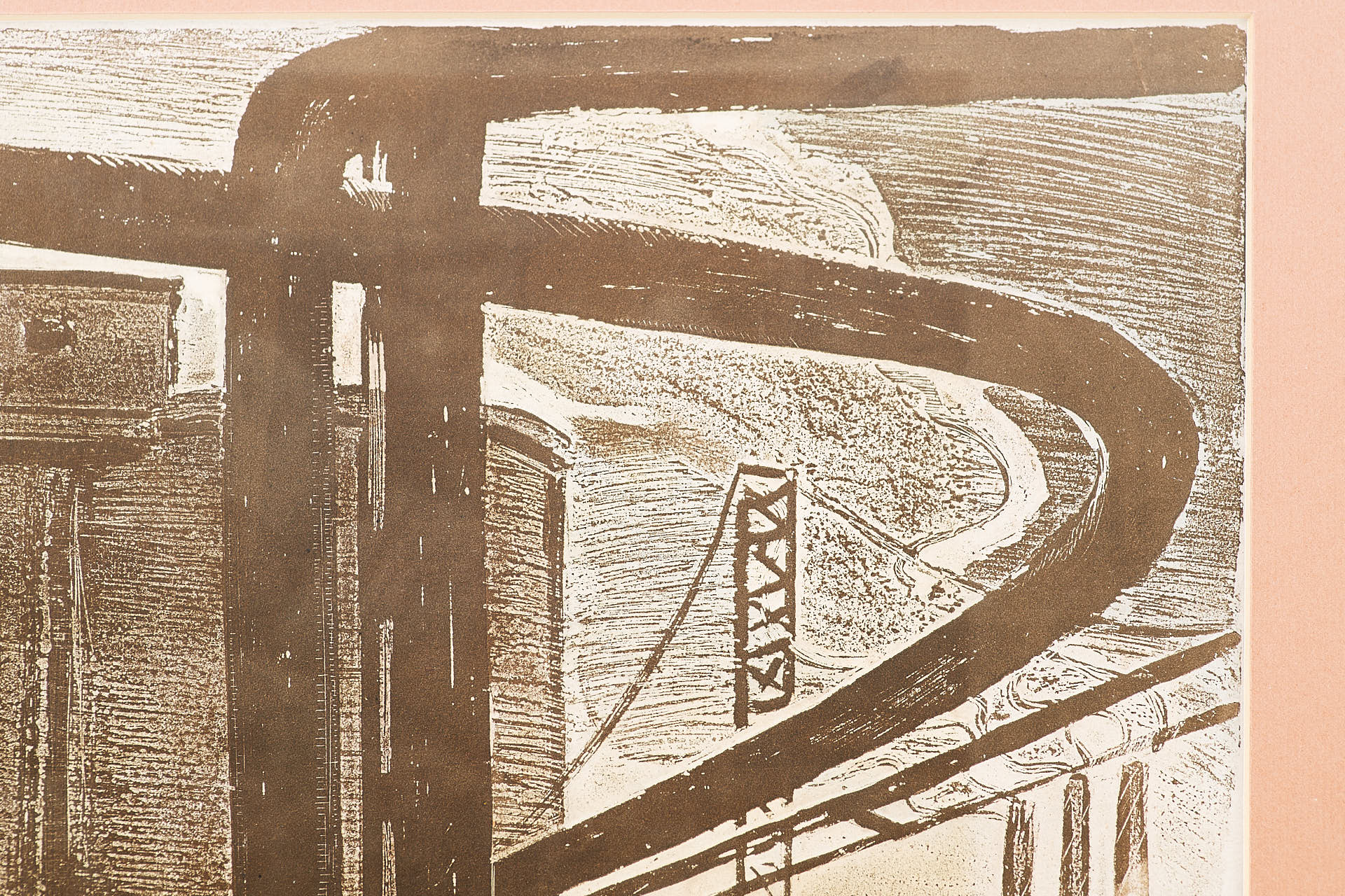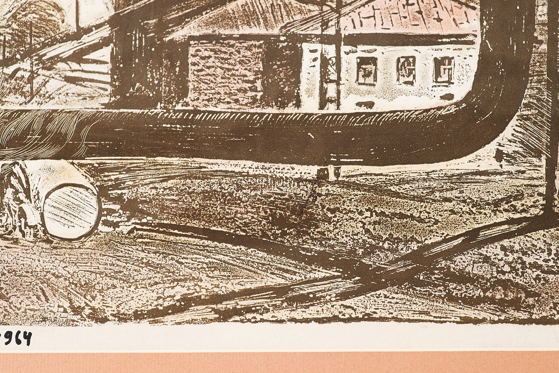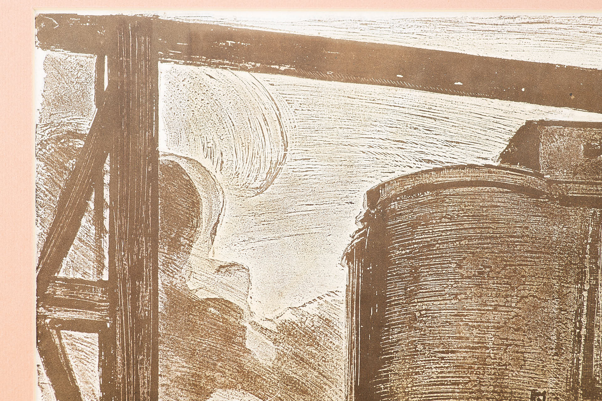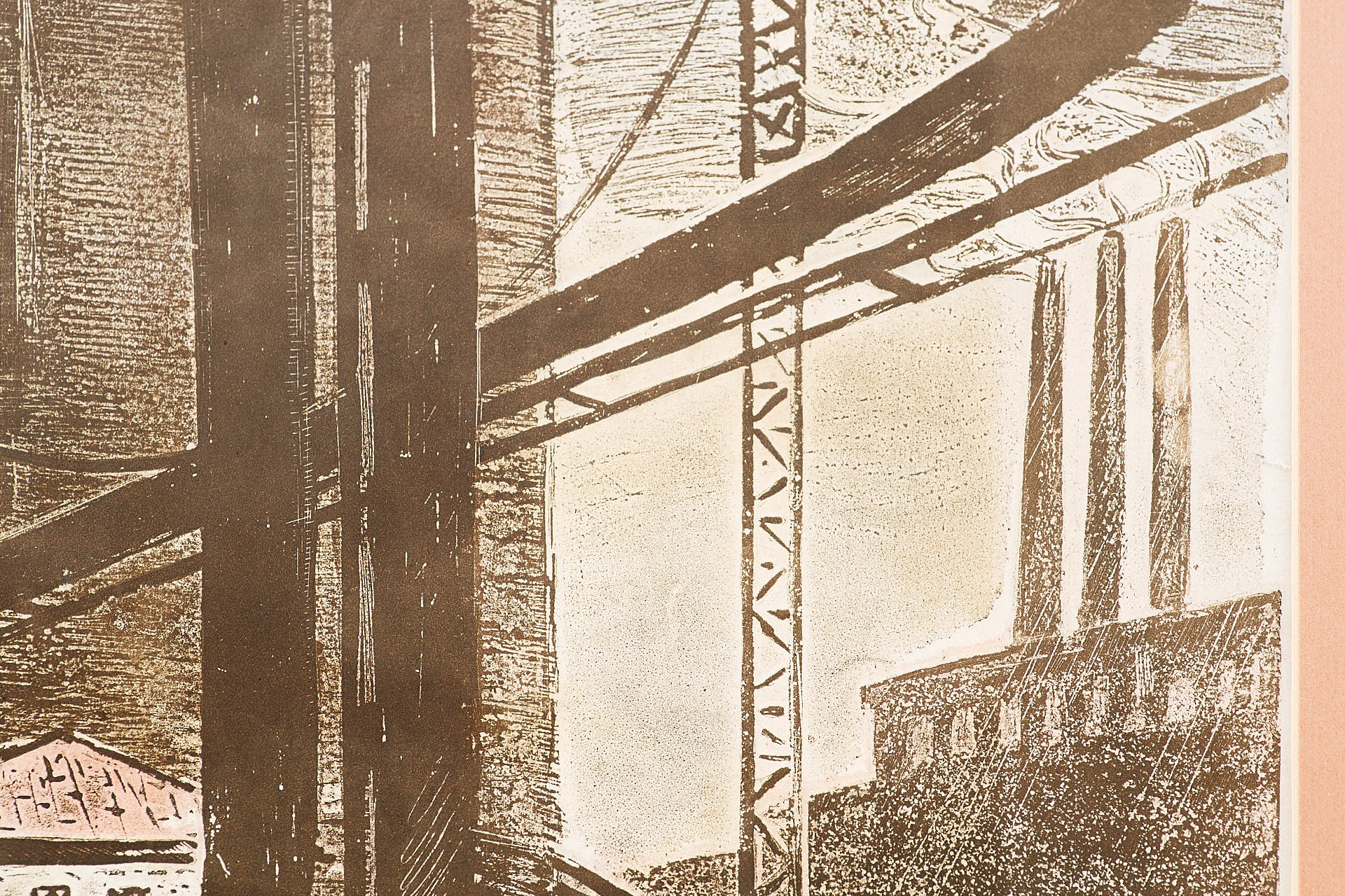 Работа выполнена в технике офорта с рельефной печатью, что позволяет художнику достигать выразительной фактуры и чёткости в передаче архитектурных и инженерных форм. Рельеф усиливает материальность объектов: грубые металлические поверхности, массив труб и башен воспринимаются почти осязаемо. Цветовая гамма выдержана в охристо-коричневых и графитовых тонах, что создаёт ощущение промышленной среды.