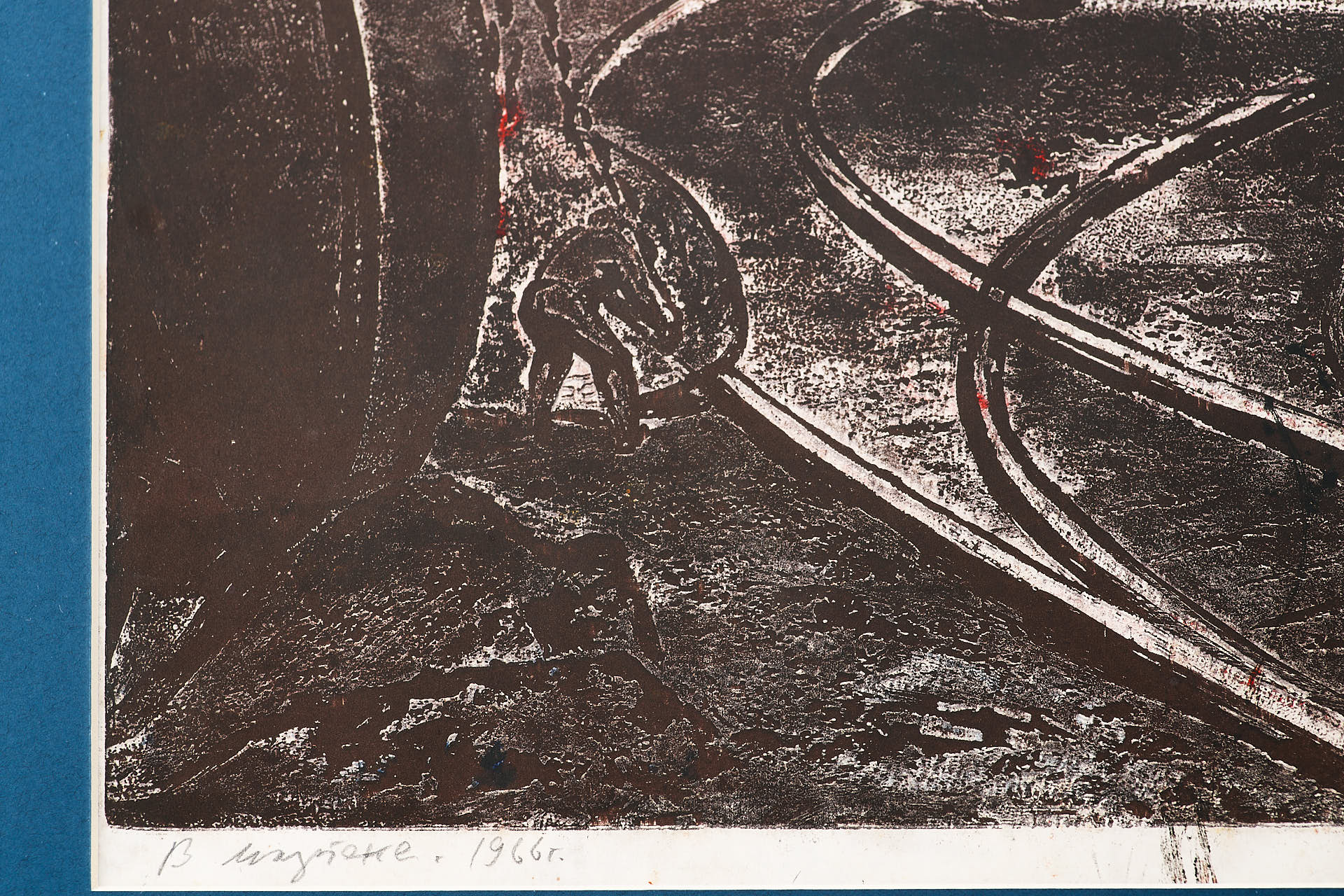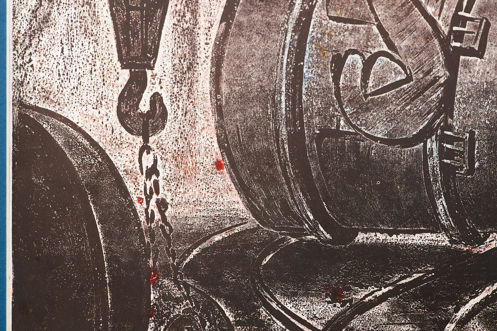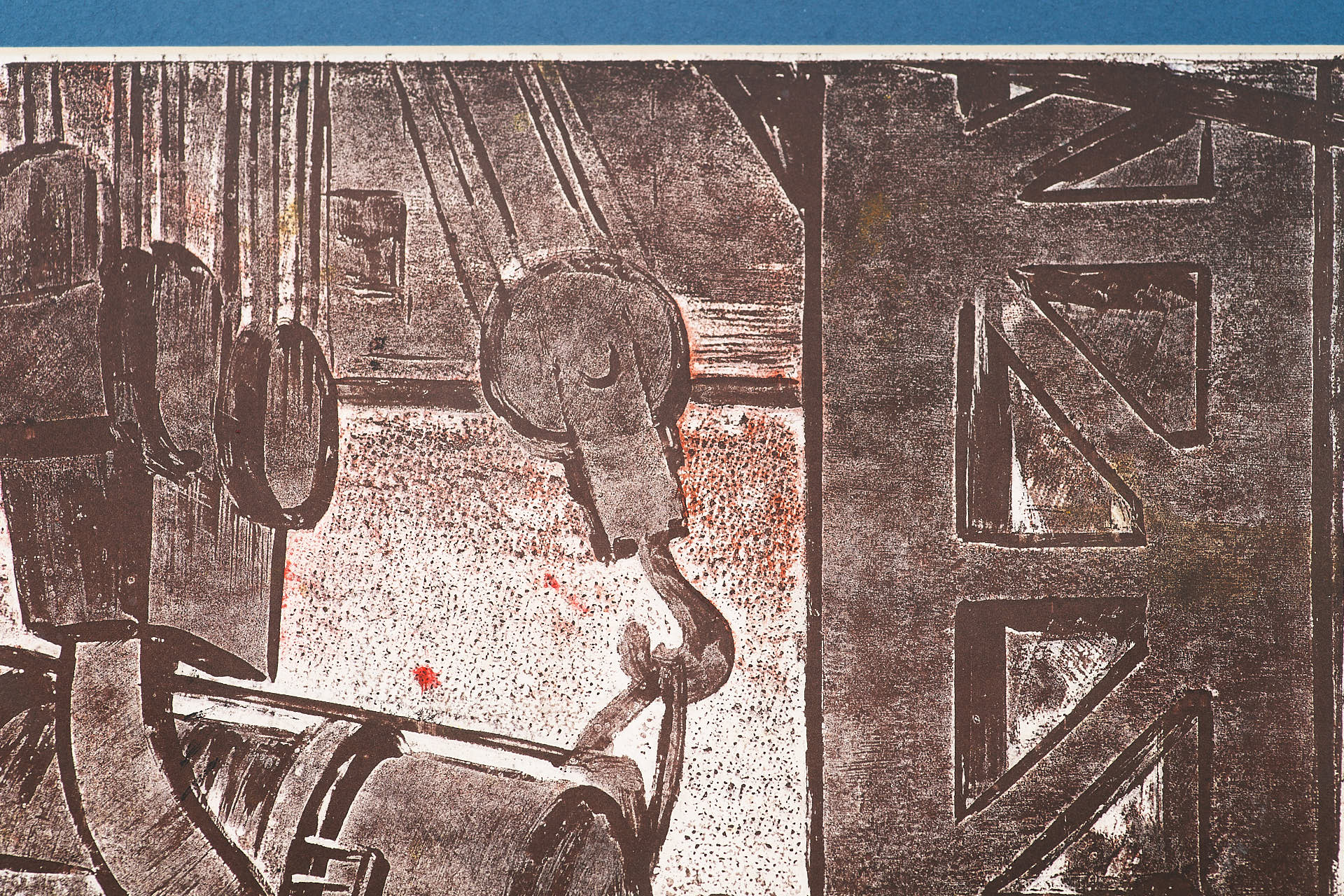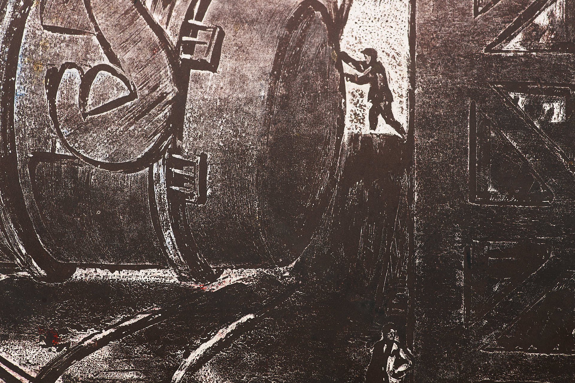 Работа выполнена в технике офорта с рельефной печатью, что позволило автору добиться особой фактурности и объёмности изображения. Использование глубоких чёрных тонов и текстурированной поверхности усиливает визуальную тяжесть металлоконструкций и передаёт гулкую, насыщенную атмосферу цеха. Контраст между освещёнными участками и глубокой тенью подчёркивает драматизм сцены.