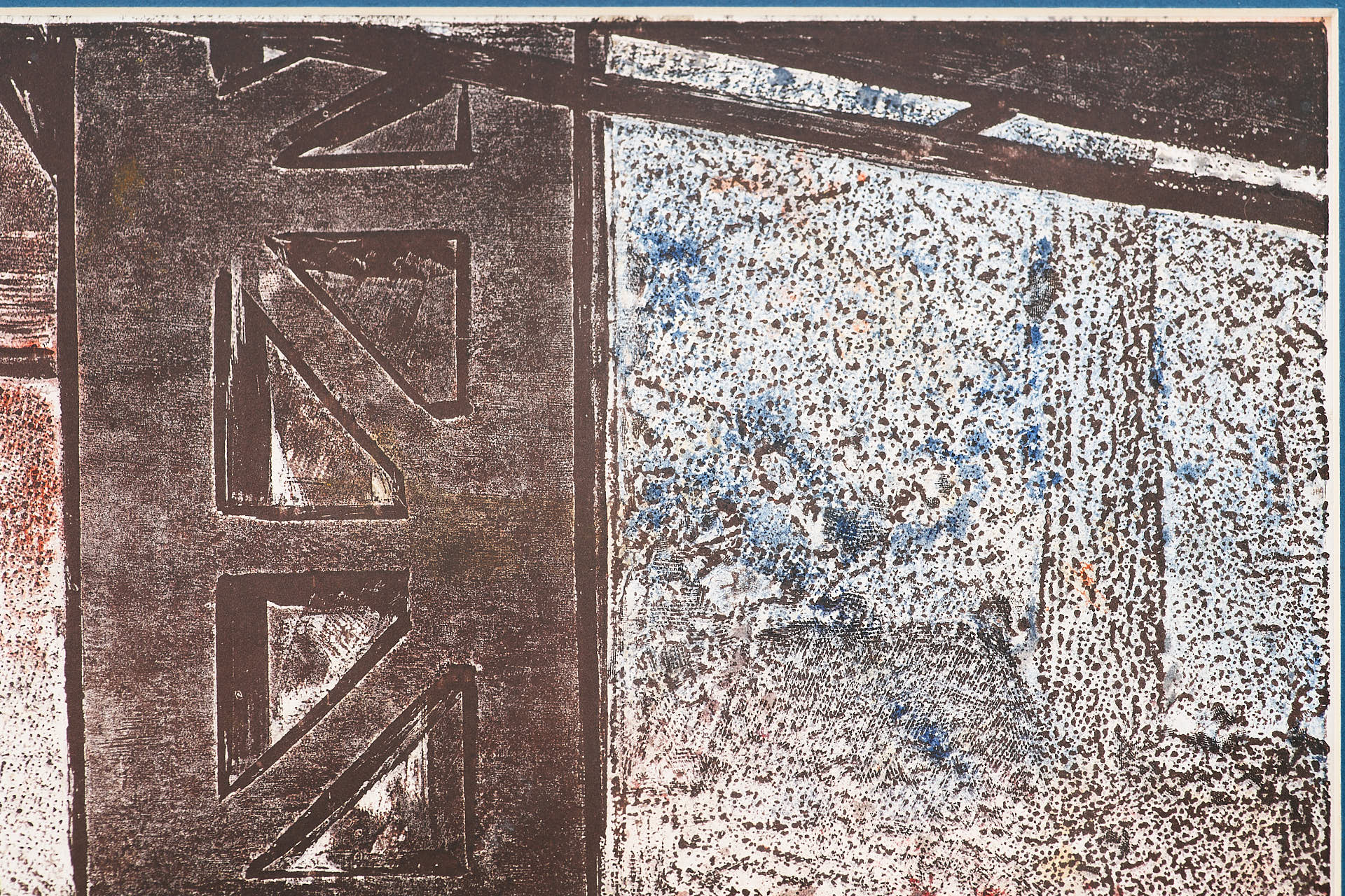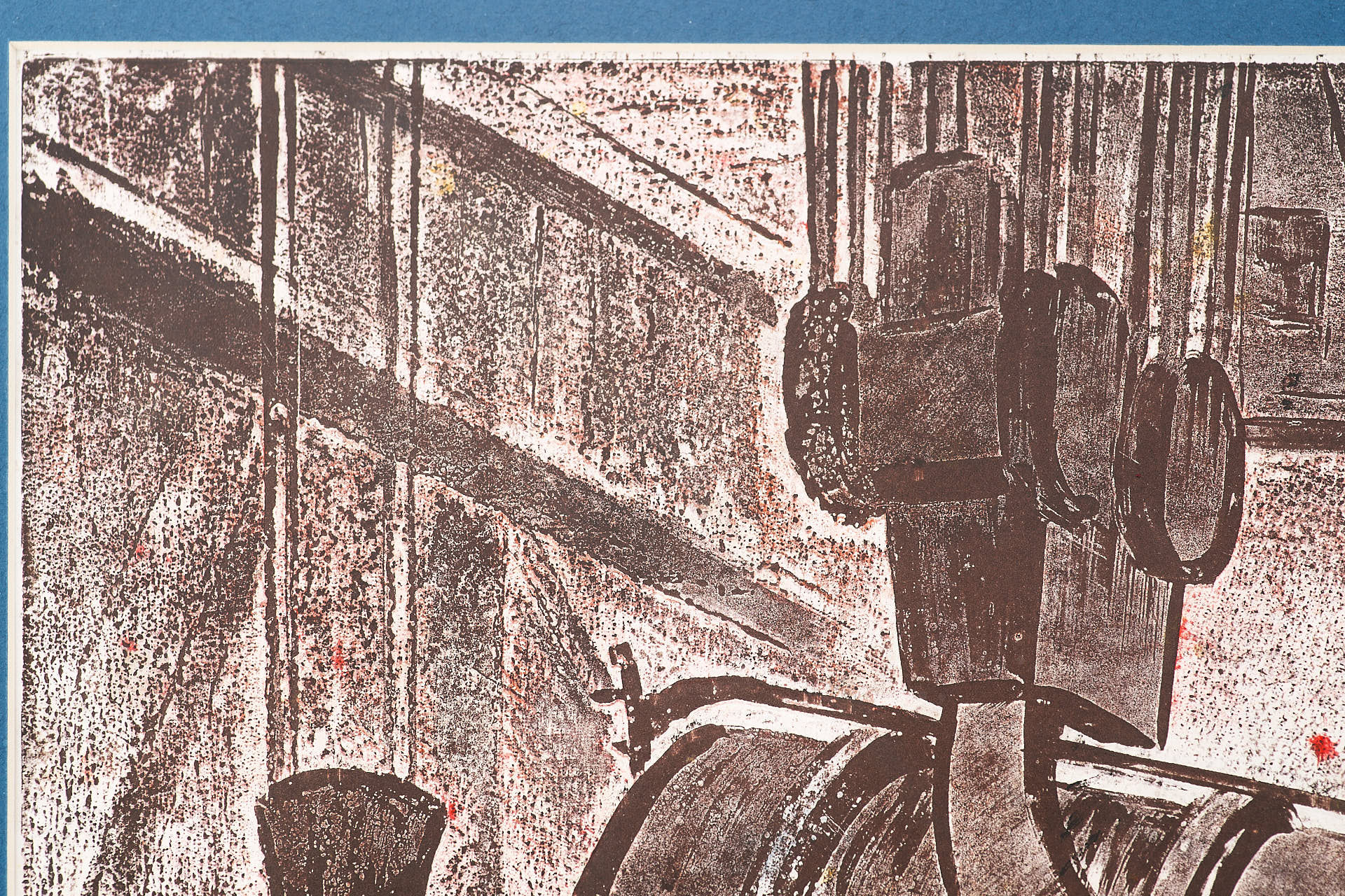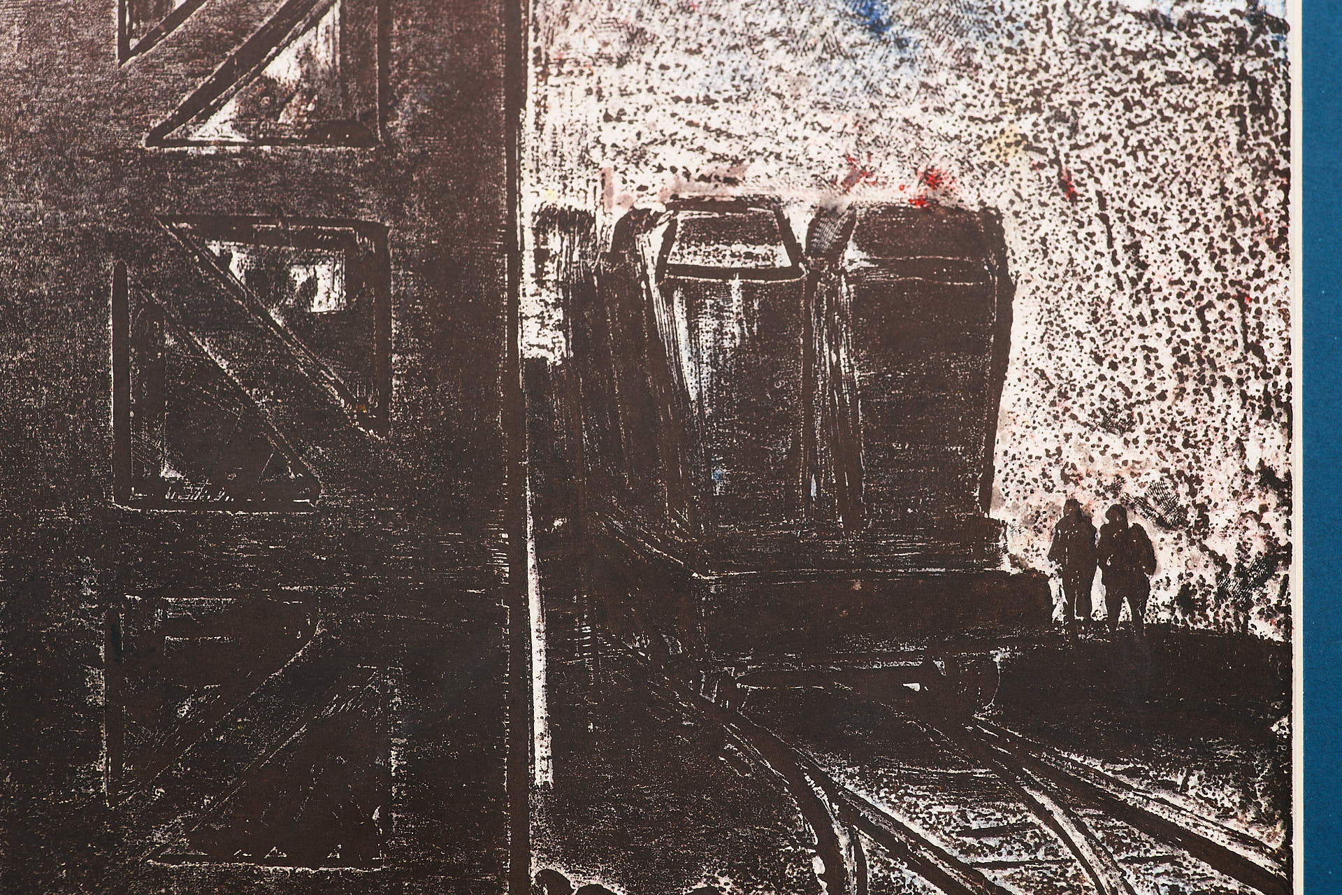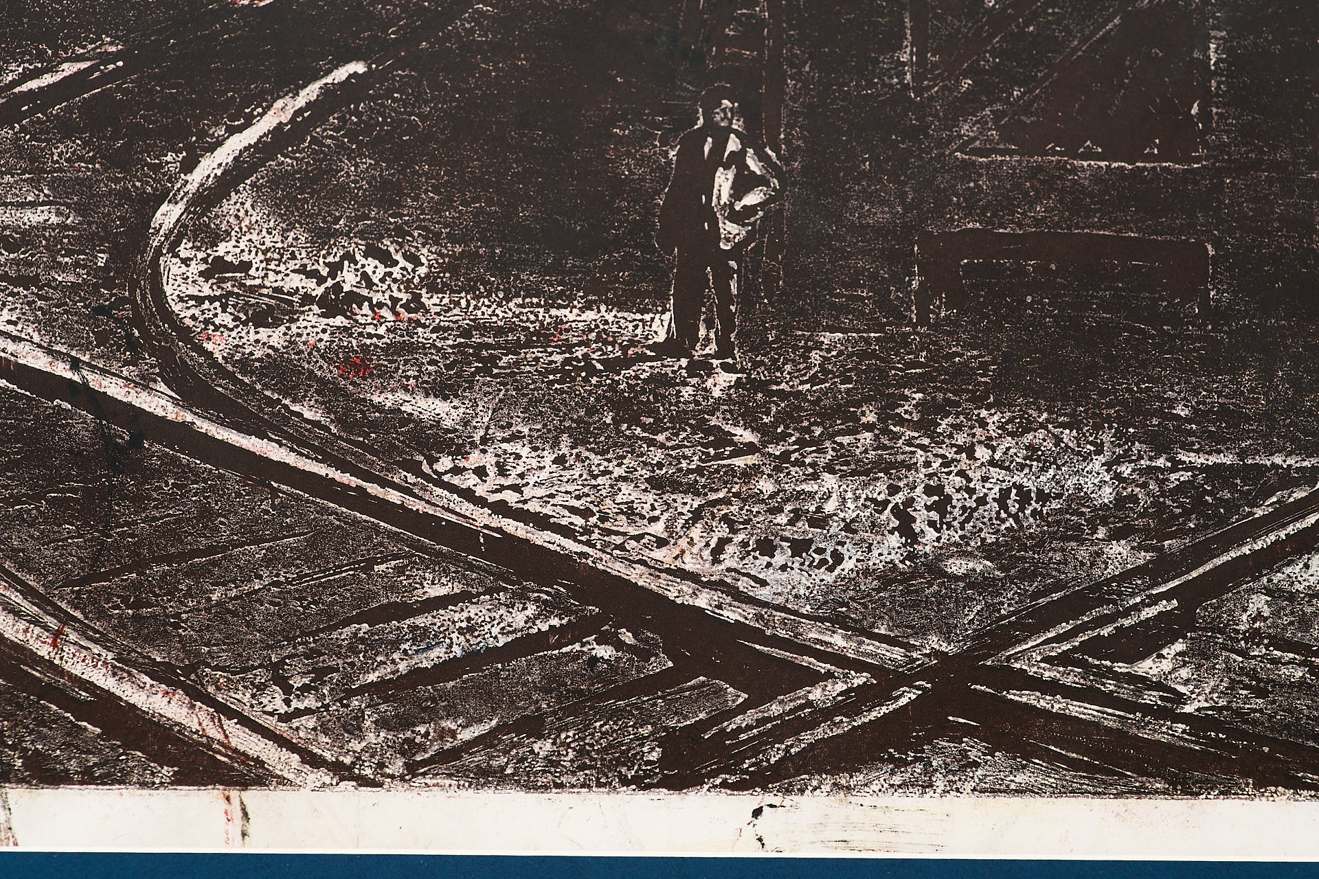 Работа выполнена в технике офорта с рельефной печатью, что позволило автору добиться особой фактурности и объёмности изображения. Использование глубоких чёрных тонов и текстурированной поверхности усиливает визуальную тяжесть металлоконструкций и передаёт гулкую, насыщенную атмосферу цеха. Контраст между освещёнными участками и глубокой тенью подчёркивает драматизм сцены.