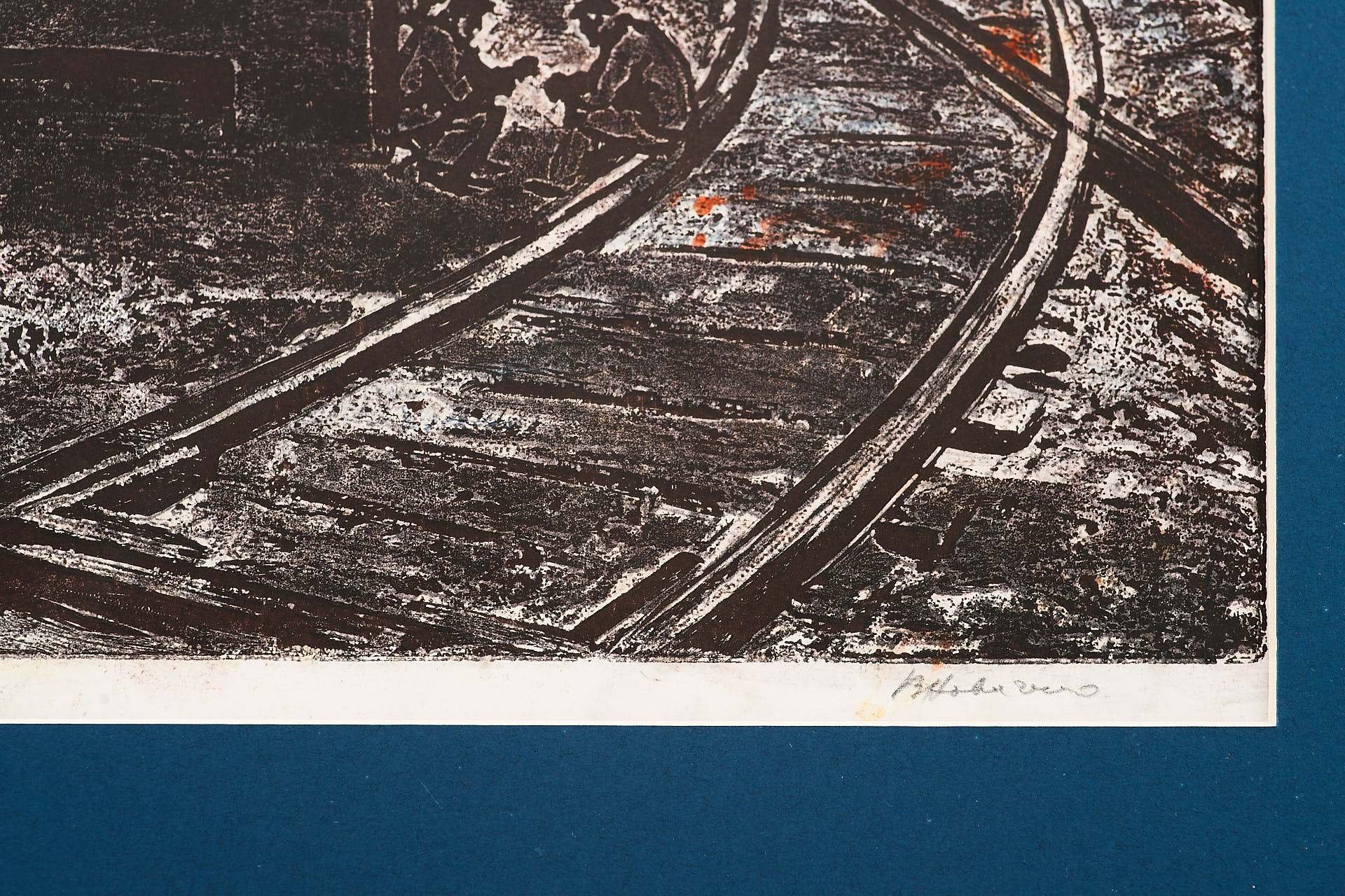 Офорт с рельефной печатью «В мартене» Валентина Алексеевича Новиченко, созданный в 1966 году, изображает внутреннее пространство мартеновского цеха металлургического комбината. Композиция выстроена вокруг массивных стальных ковшей, подвешенных на кранах. Рельсы и крюки, каркасы конструкций, фигуры рабочих на фоне промышленного интерьера создают ощущение масштабности, производственной мощи и напряжённой трудовой атмосферы.