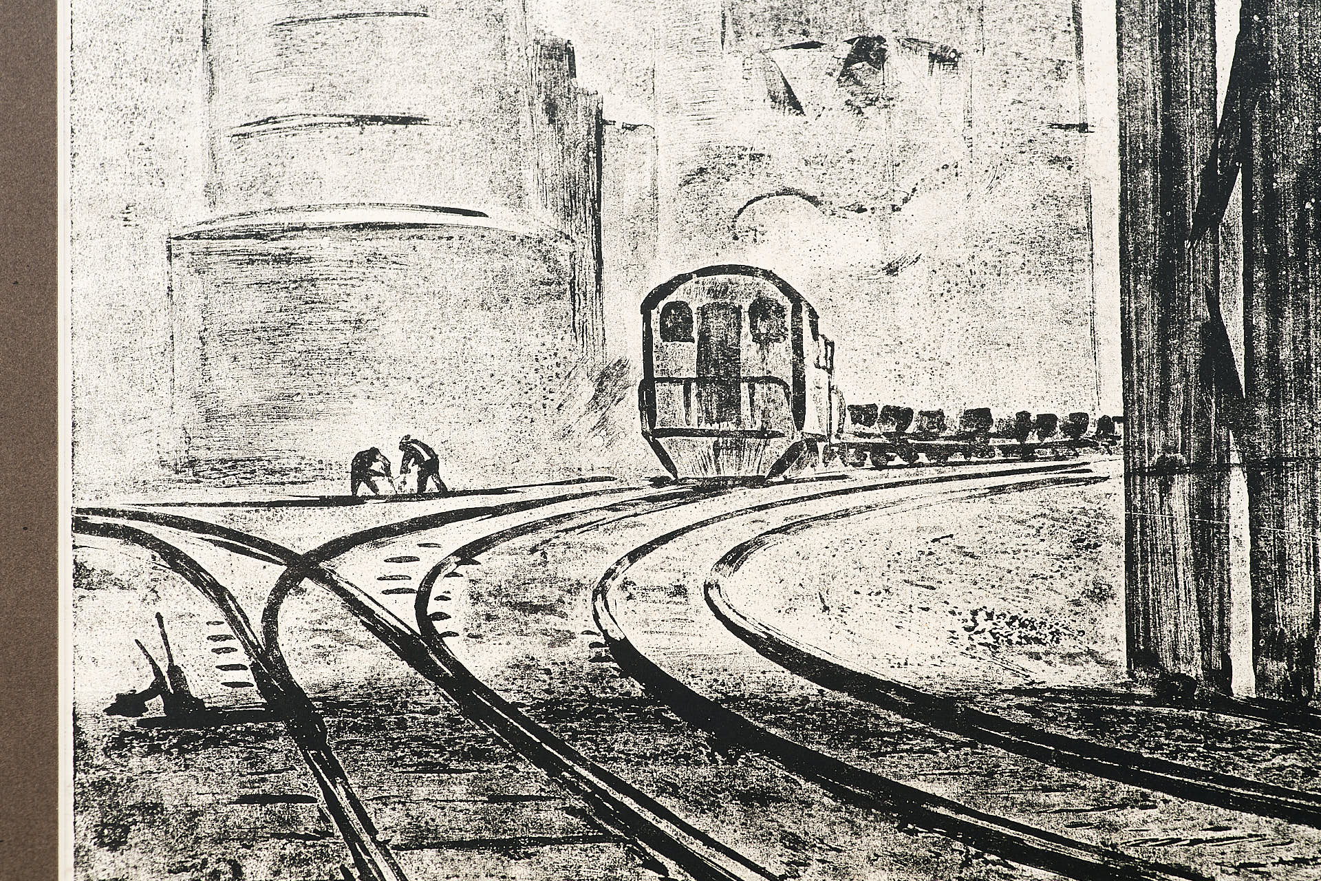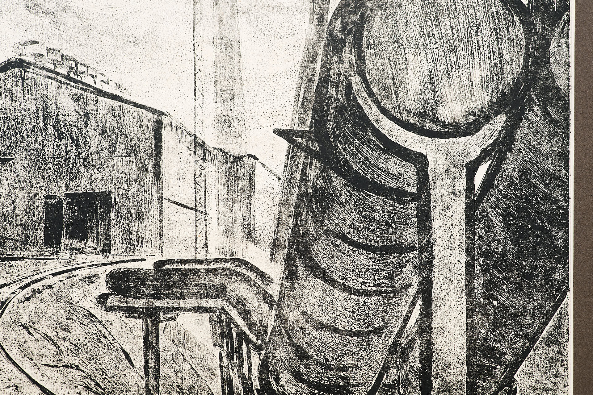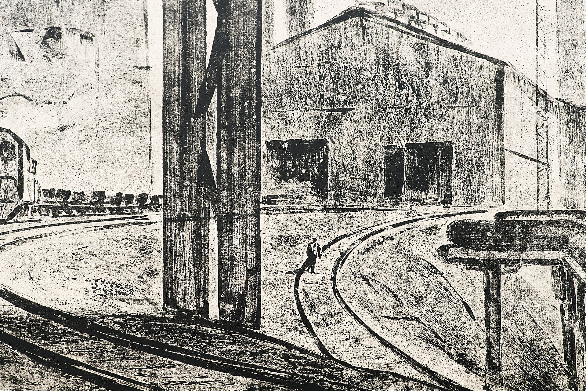 Офорт с рельефной печатью «Дорога на Шихтовый» Валентина Алексеевича Новиченко, созданный в середине 1960-х годов, представляет собой выразительное изображение индустриального пространства металлургического предприятия. Центральное место в композиции занимает разветвлённая сеть железнодорожных путей, уводящая взгляд зрителя вглубь изображения, к массивным цехам, трубам и техническим коммуникациям. По правому краю мощно выделяется изгибающаяся труба, визуально обрамляющая сцену и подчеркивающая масштаб производственной инфраструктуры.