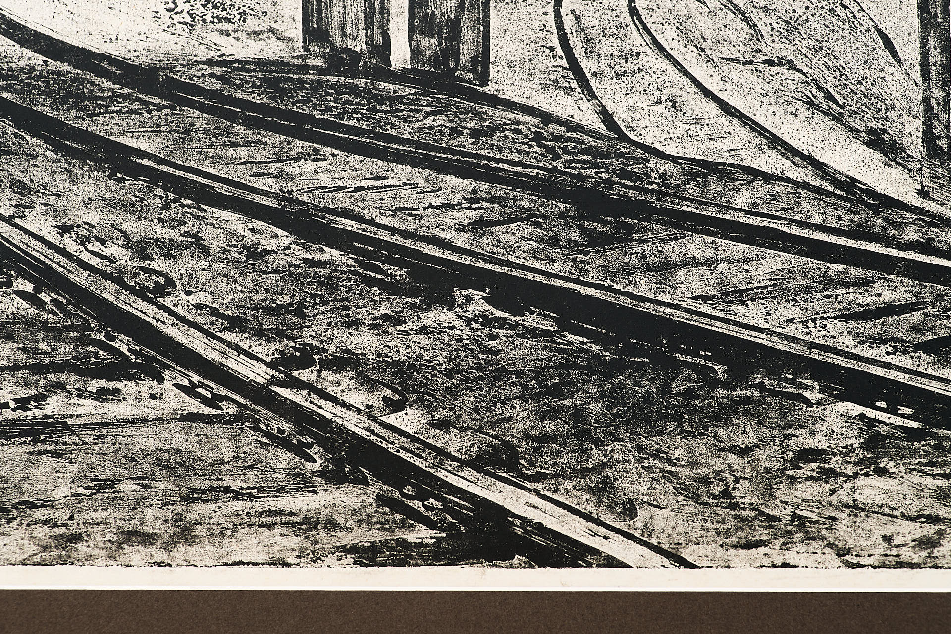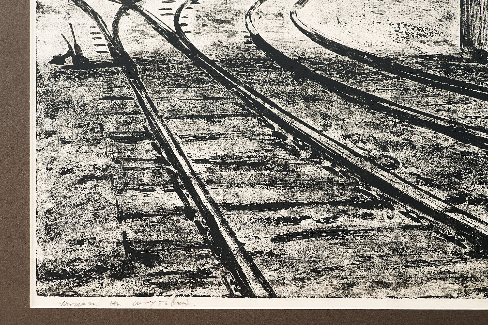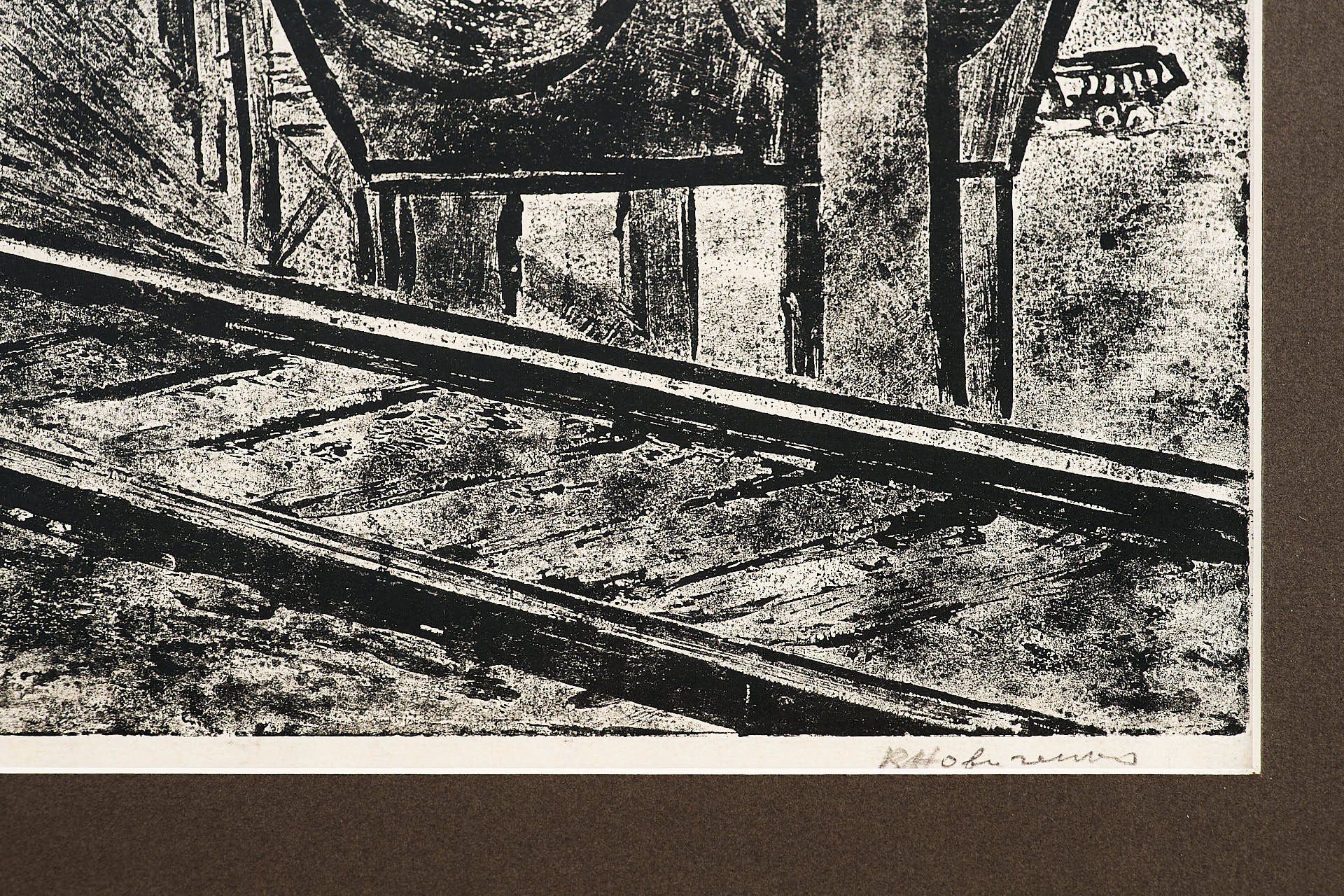 Офорт с рельефной печатью «Дорога на Шихтовый» Валентина Алексеевича Новиченко, созданный в середине 1960-х годов, представляет собой выразительное изображение индустриального пространства металлургического предприятия. Центральное место в композиции занимает разветвлённая сеть железнодорожных путей, уводящая взгляд зрителя вглубь изображения, к массивным цехам, трубам и техническим коммуникациям. По правому краю мощно выделяется изгибающаяся труба, визуально обрамляющая сцену и подчеркивающая масштаб производственной инфраструктуры.