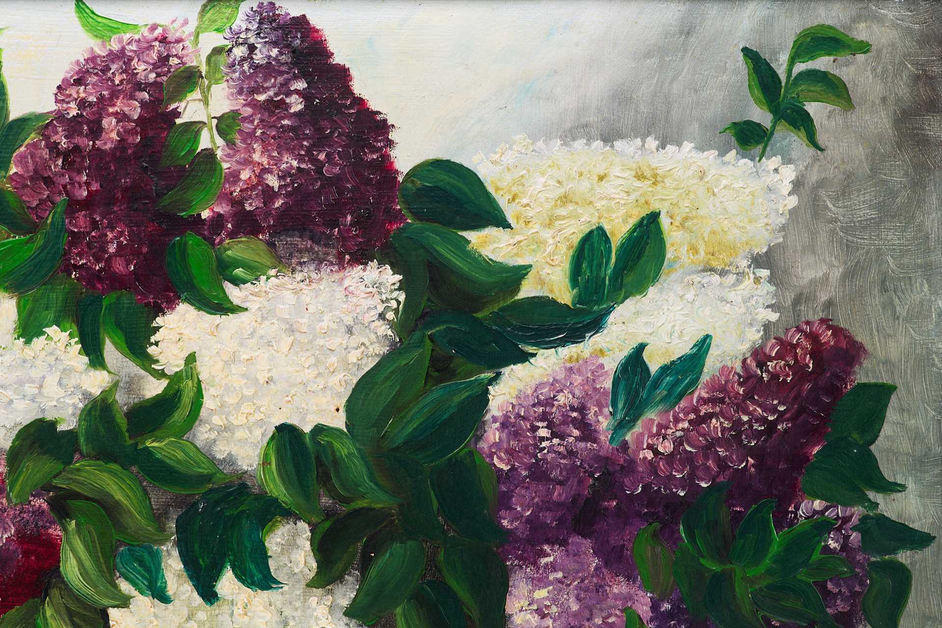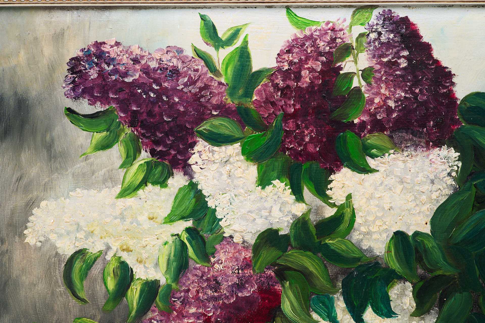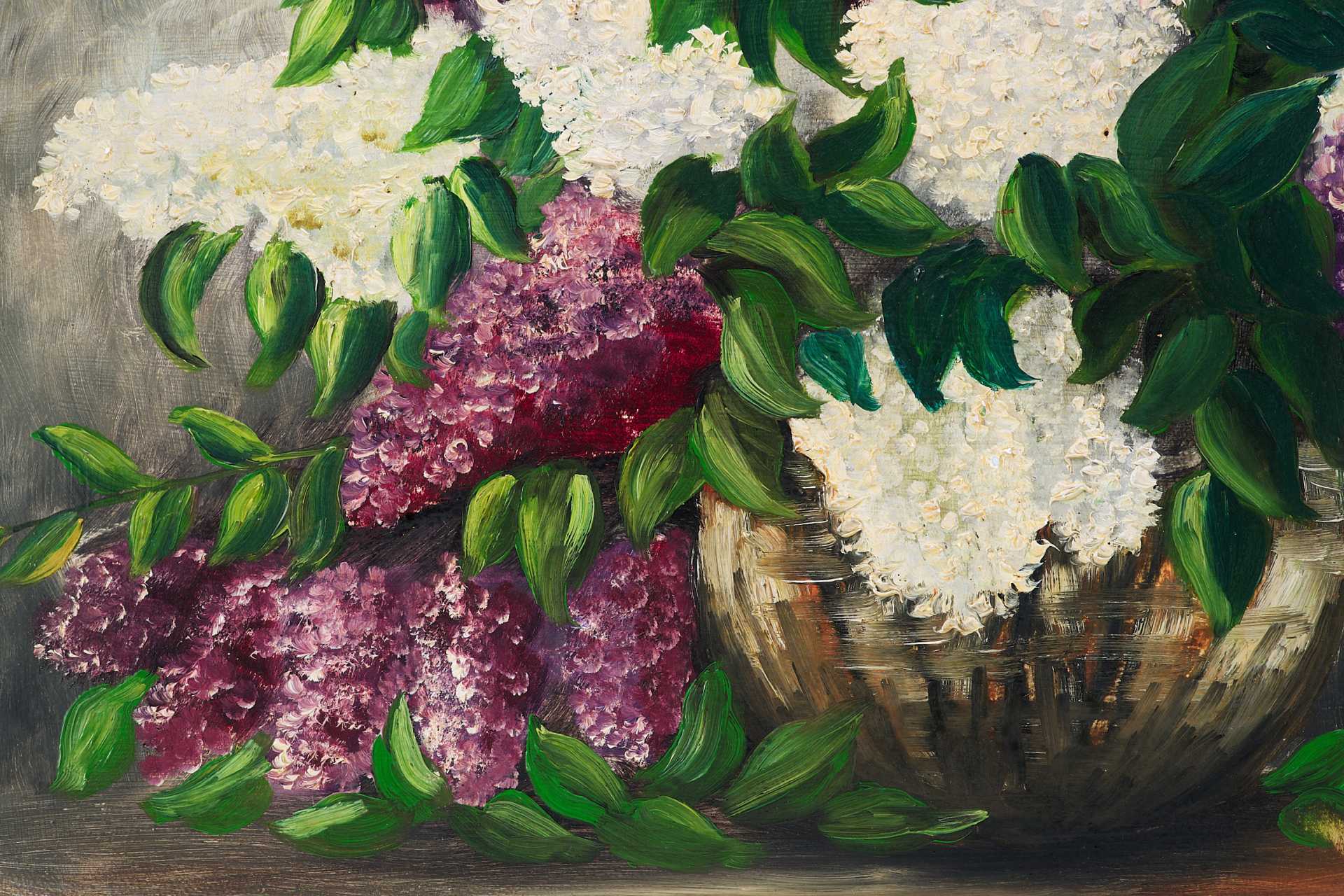 На картине изображён пышный букет сирени — белой и лиловой — в простой белой вазе, поставленной на нейтральный фон. Композиция выстроена с равномерным распределением массы цветков и листвы, в центре акцент сделан на вертикали зелёных листьев. Фон и поверхность стола выполнены декоративными мазками, подчёркивающими живописную текстуру.