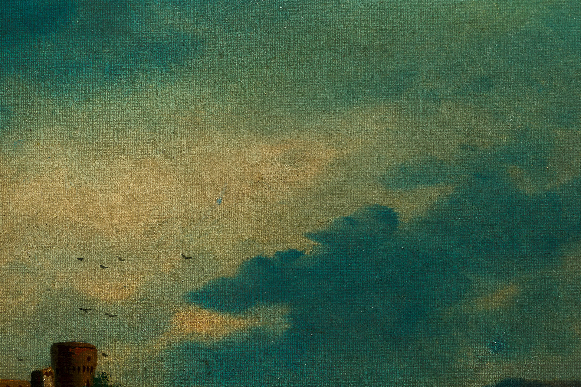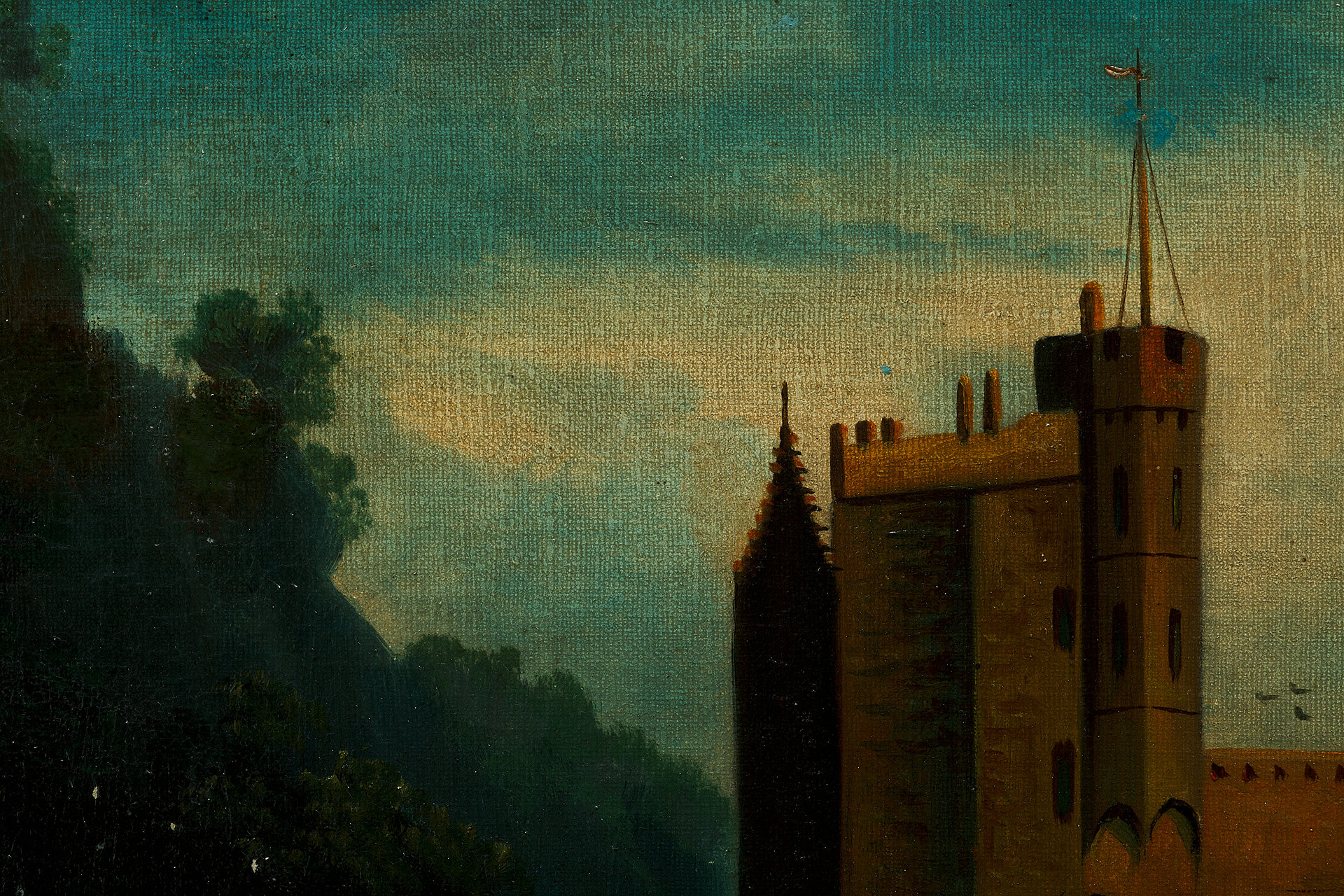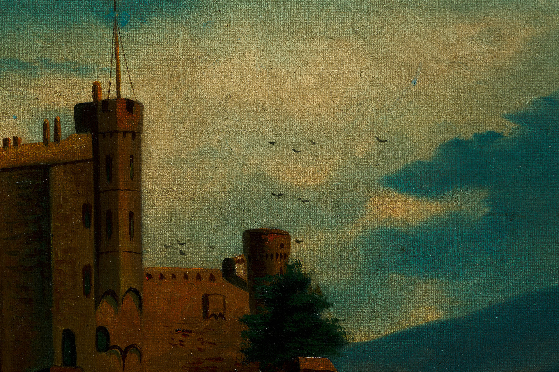 Картина написана неизвестным западноевропейским мастером, работавшим в академической традиции. Несмотря на отсутствие подписи, стиль и качество исполнения свидетельствуют о профессиональном уровне автора, хорошо владевшего перспективой, светотенью и композиционной организацией пространства. Образ крепости подчёркивает тему уединения, устойчивости и прошлого, а присутствие парусников оживляет сцену, добавляя элемент человеческого присутствия.