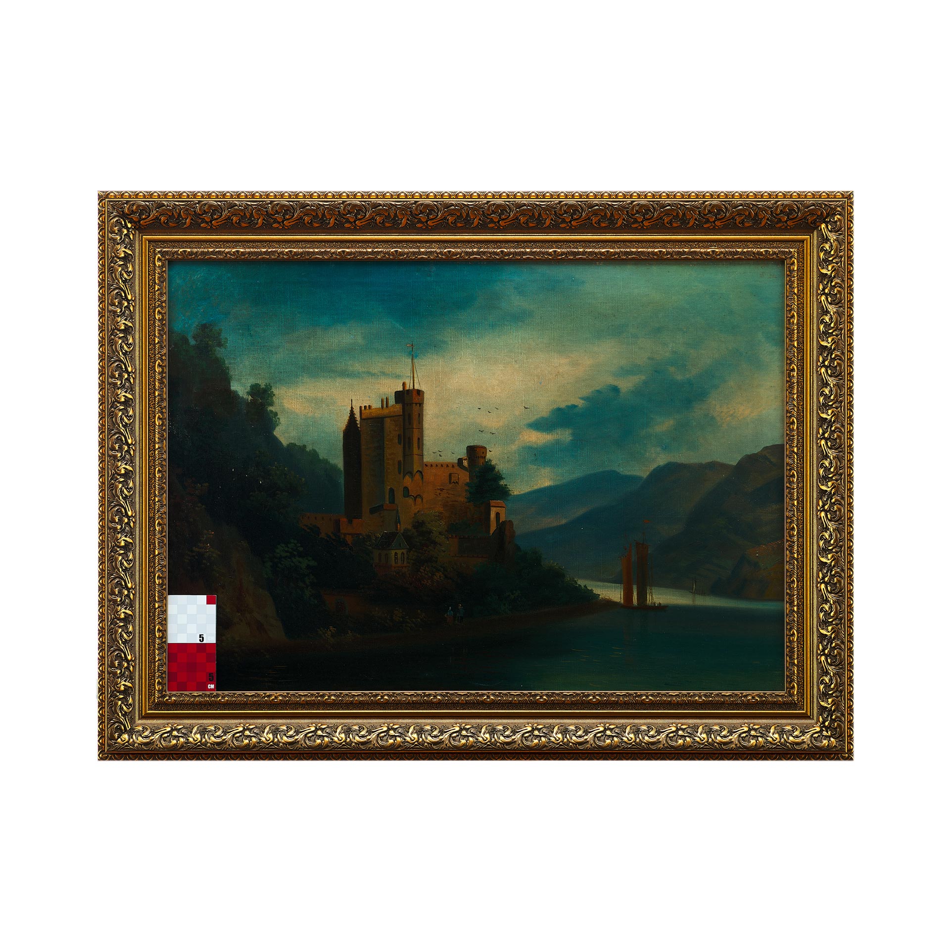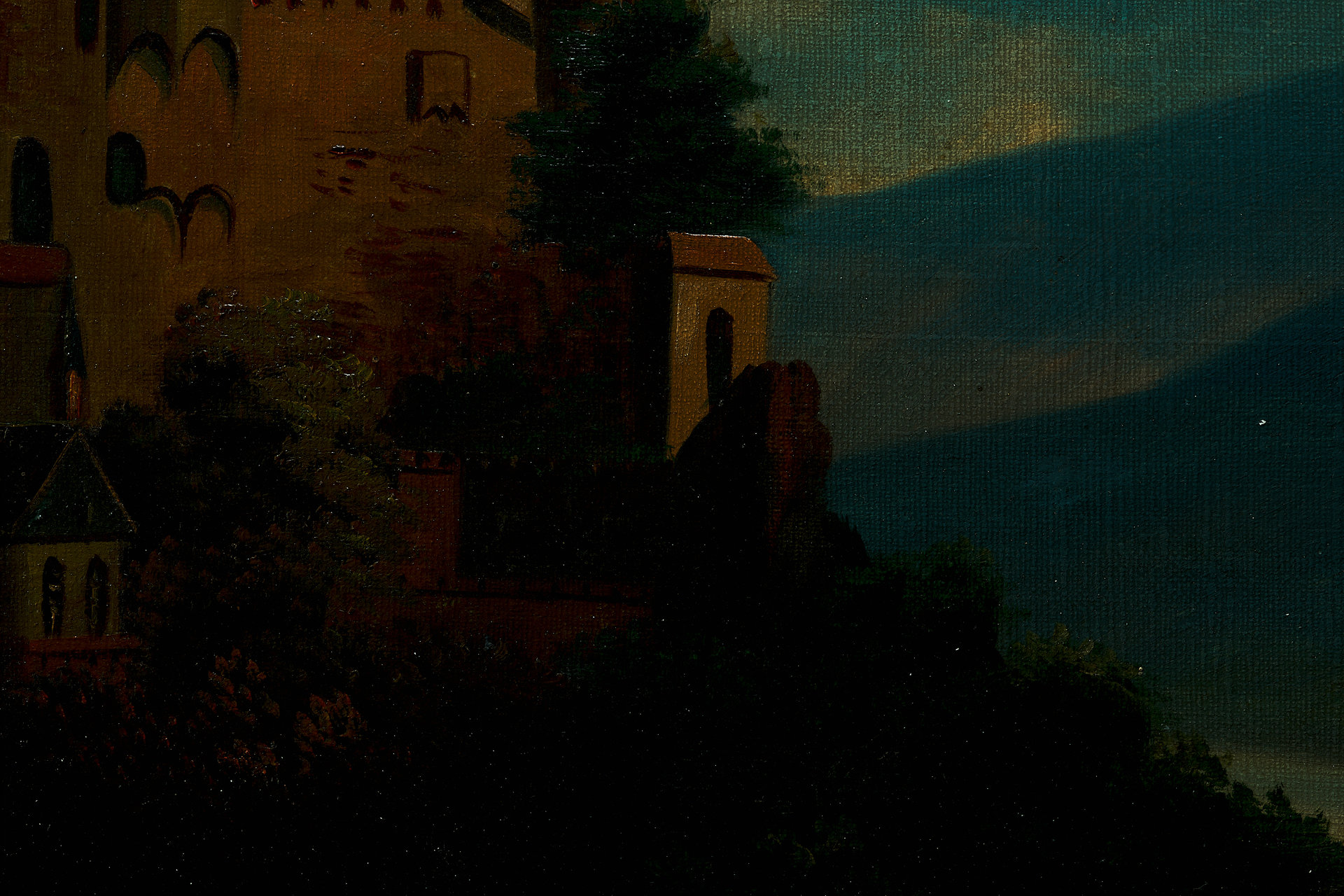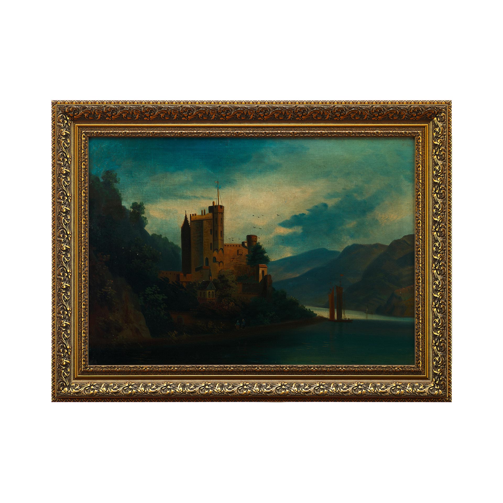 На картине изображён романтический горный пейзаж с озером, на берегу которого возвышается замок-крепость с башнями и зубчатой стеной. Его массивные формы подчёркнуты на фоне светлого неба, затянутого облаками. На гладкой водной поверхности — два парусных судна, пришвартованных у подножия утёса. Картина построена на контрасте спокойной водной глади и величественного, тёмного силуэта крепости, погружённой в тень гор.