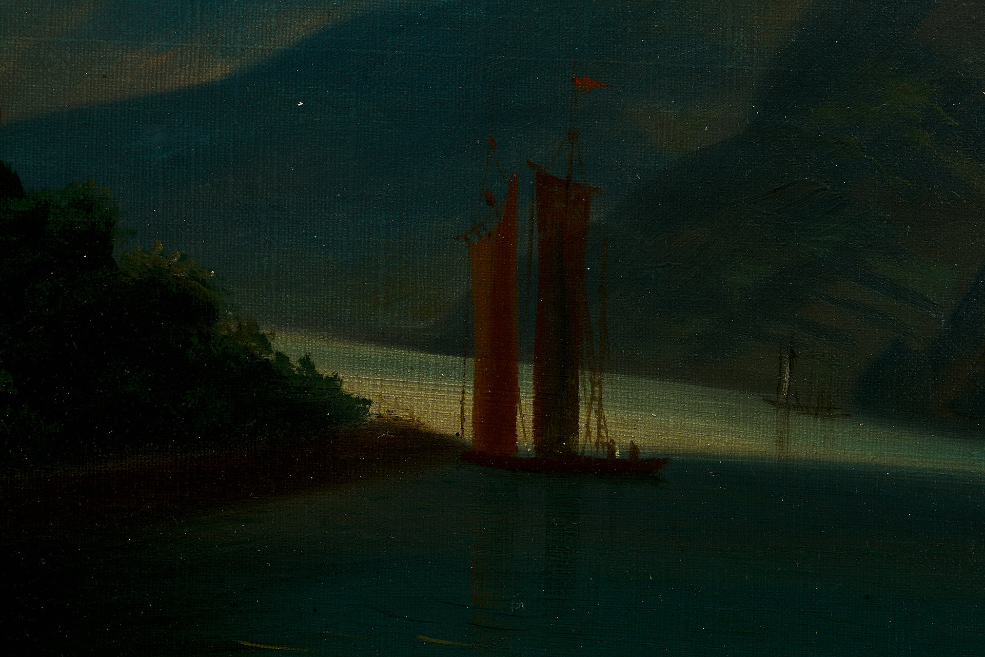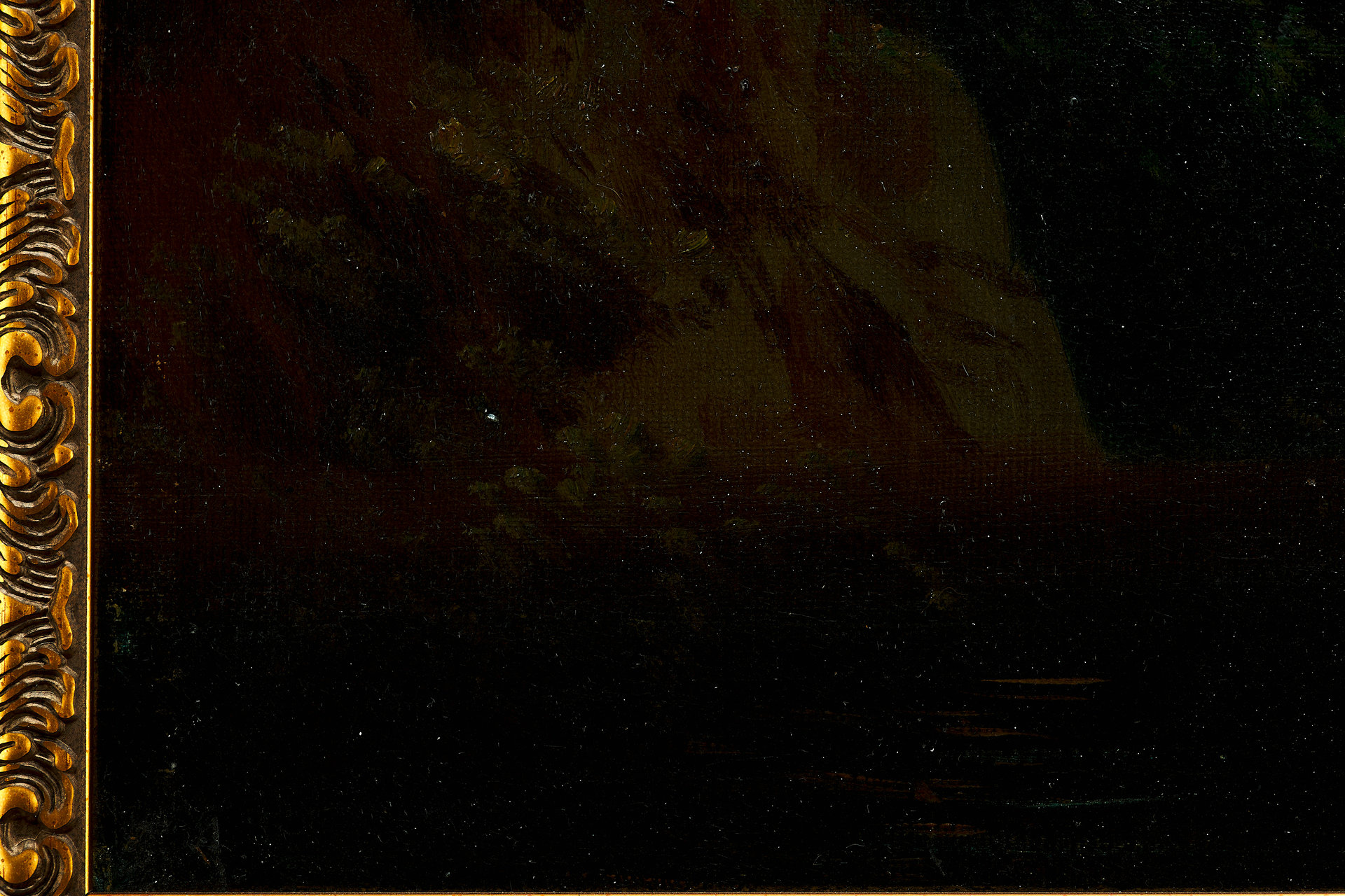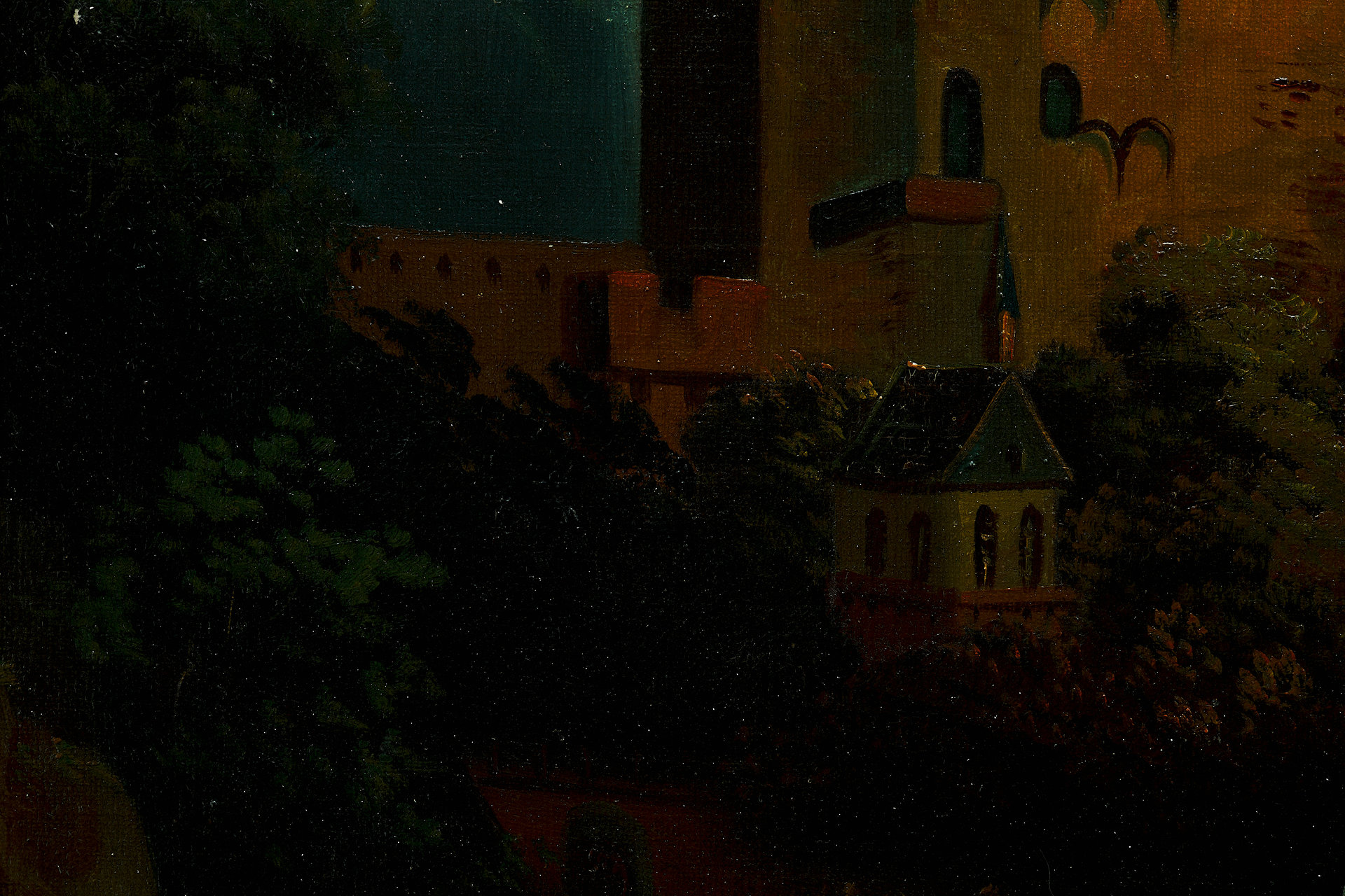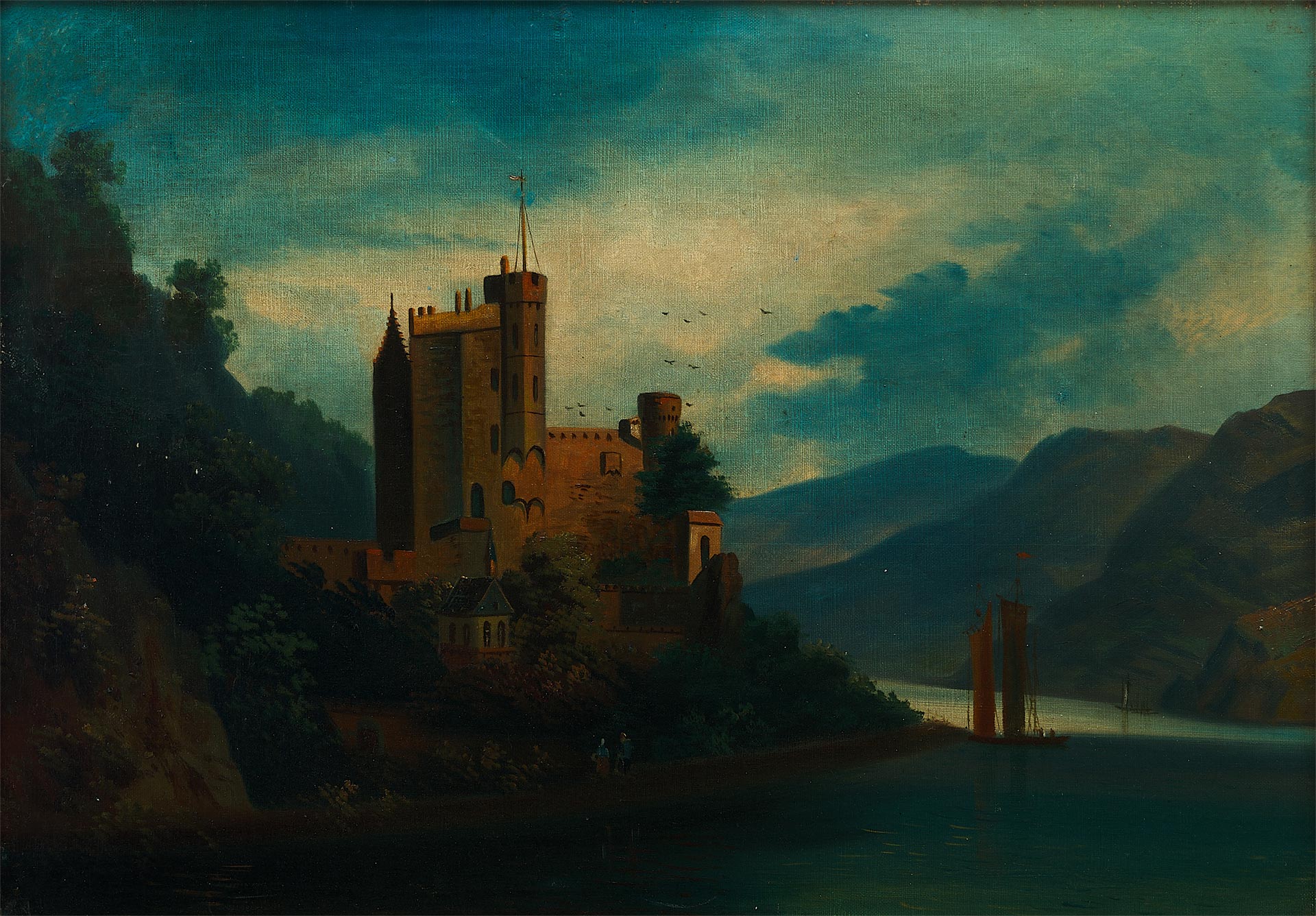На картине изображён романтический горный пейзаж с озером, на берегу которого возвышается замок-крепость с башнями и зубчатой стеной. Его массивные формы подчёркнуты на фоне светлого неба, затянутого облаками. На гладкой водной поверхности — два парусных судна, пришвартованных у подножия утёса. Картина построена на контрасте спокойной водной глади и величественного, тёмного силуэта крепости, погружённой в тень гор.