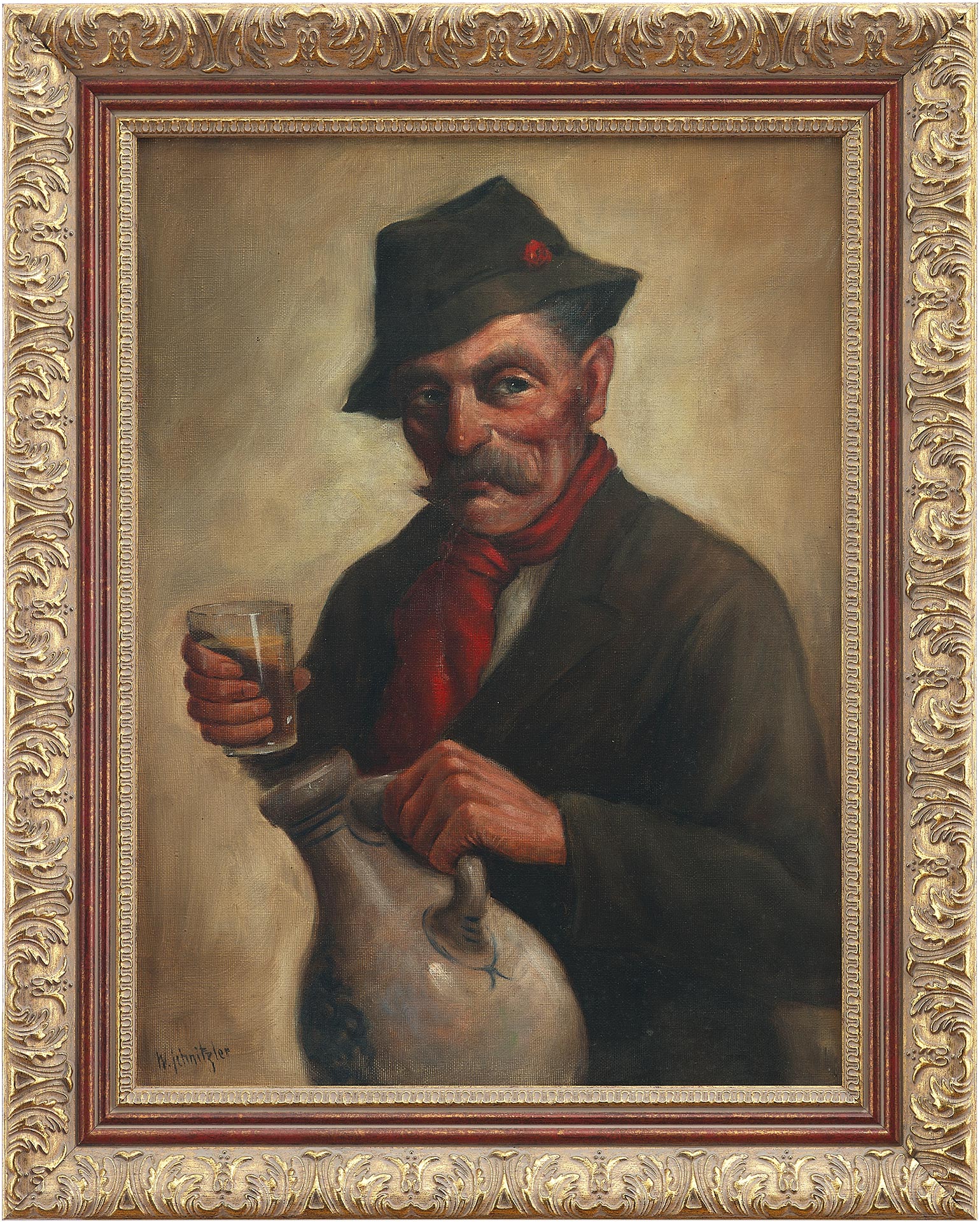 На картине изображен мужчина в пиджаке и шляпе, с красным шарфом. В его руках керамический кувшин для вина и стеклянный стакан. Слева внизу подпись: «W. Jelinitzler». Традиция пивоварения и виноделия издревле существовала в католической культуре. Иногда пиво заменяло и хлеб; густое крепкое пиво издавна называлось «жидким хлебом» и поддерживало силы монастырской братии при длительных постах, поскольку именно монастыри были одними из главных производителей виня я пива со времен средневековья. Мотив картины, манера письма соотносятся с практикой немецкой живописи того времени. Изображение монахов или любителей пива было популярно в немецкой живописи, начиная с середины XIX в. по первую половину XX в. Забавные сцены из жизни представителей бюргерства и католической братии при