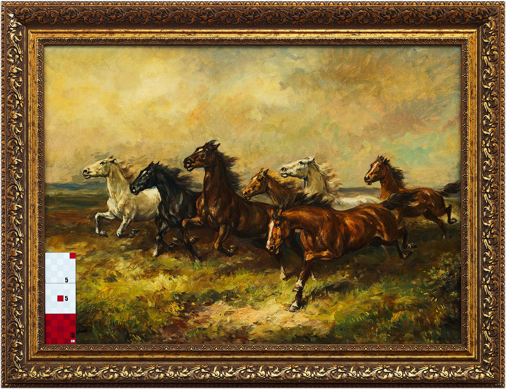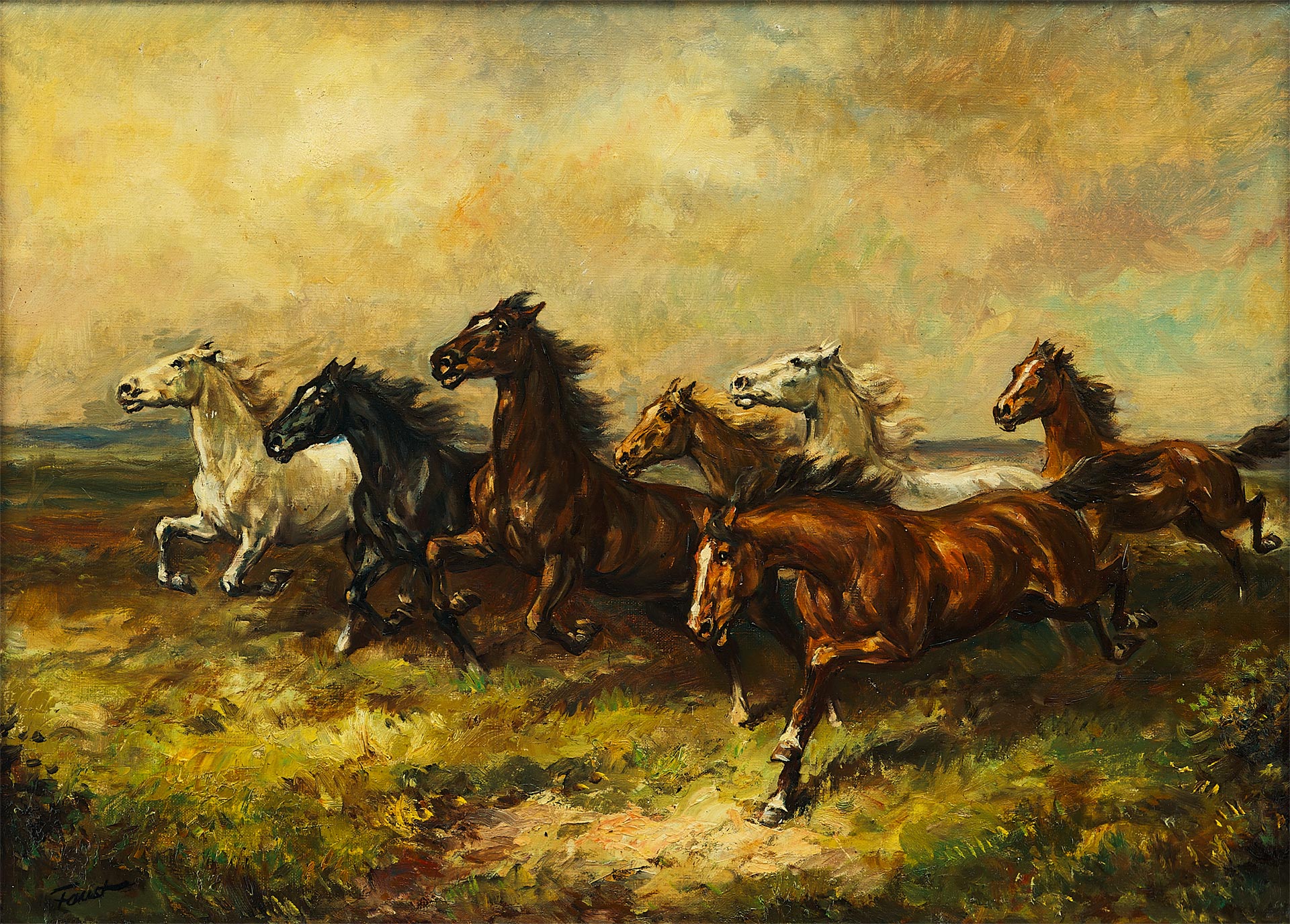 На картине изображён дикий табун из семи лошадей, мчащихся галопом по открытому полю. Животные представлены в стремительном движении, с развевающимися гривами и напряжённой мускулатурой. Разнообразие мастей — от вороной до белой — подчёркивает динамику композиции. Фон — смутное, драматичное небо и расплывающийся горизонт — усиливает эмоциональное воздействие сцены, создавая эффект стихийной энергии.