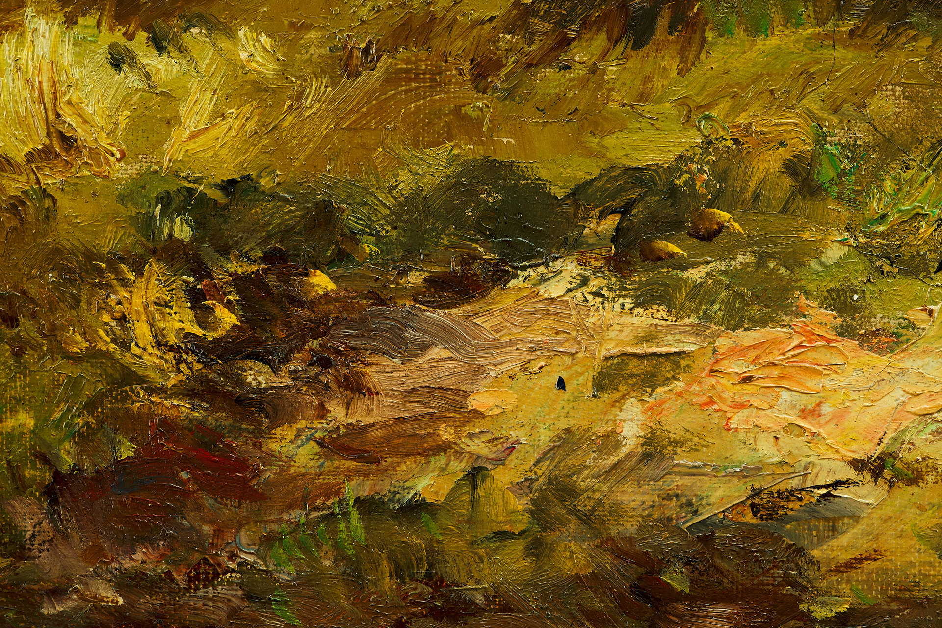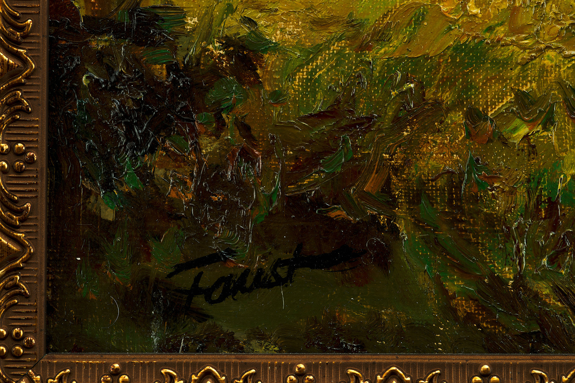 Работа написана маслом на холсте; в нижнем левом углу находится авторская подпись «Faust», стилистически и по степени старения совпадающая с остальной живописью. На обороте холста отмечен штамп производителя: «CK Malleinen», соответствующий немецкому художественному материалу начала XX века.