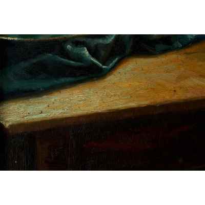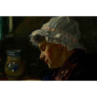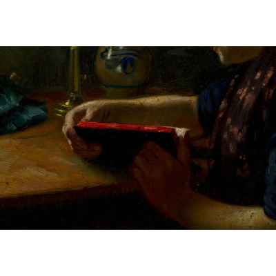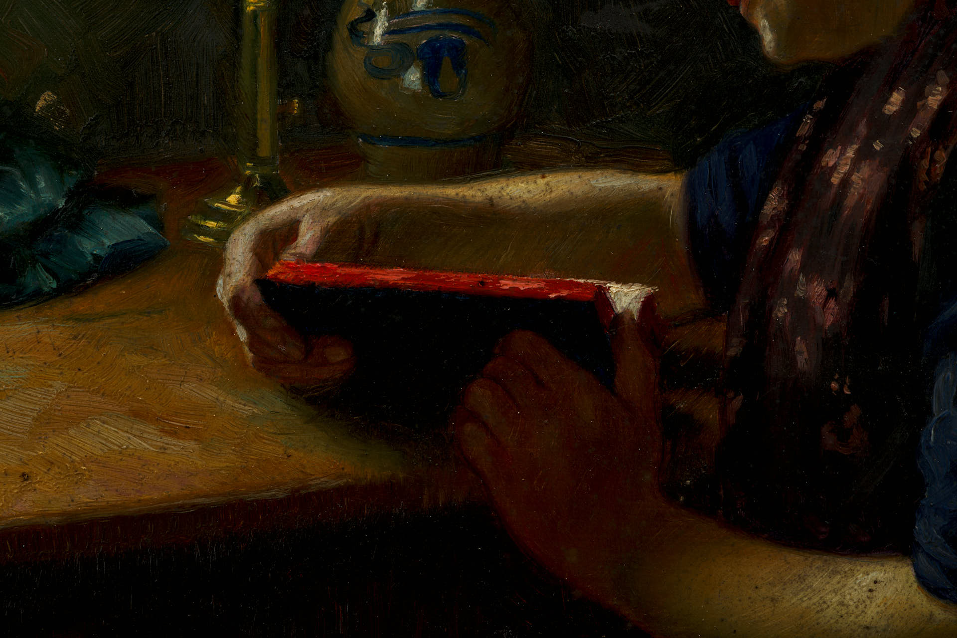 На картине изображена жанровая сцена: пожилая женщина в чепце сидит у стола и сосредоточенно читает книгу. Свет от окна слева мягко освещает её лицо, подчёркивая задумчивость и сосредоточенность. Интерьер скромен, но проработан с вниманием к деталям: на столе — свеча, керамический сосуд, ткань и тарелка. Цветовая гамма построена на тёплых охристых и глубоких тёмно-синих оттенках, создающих камерную, интимную атмосферу.