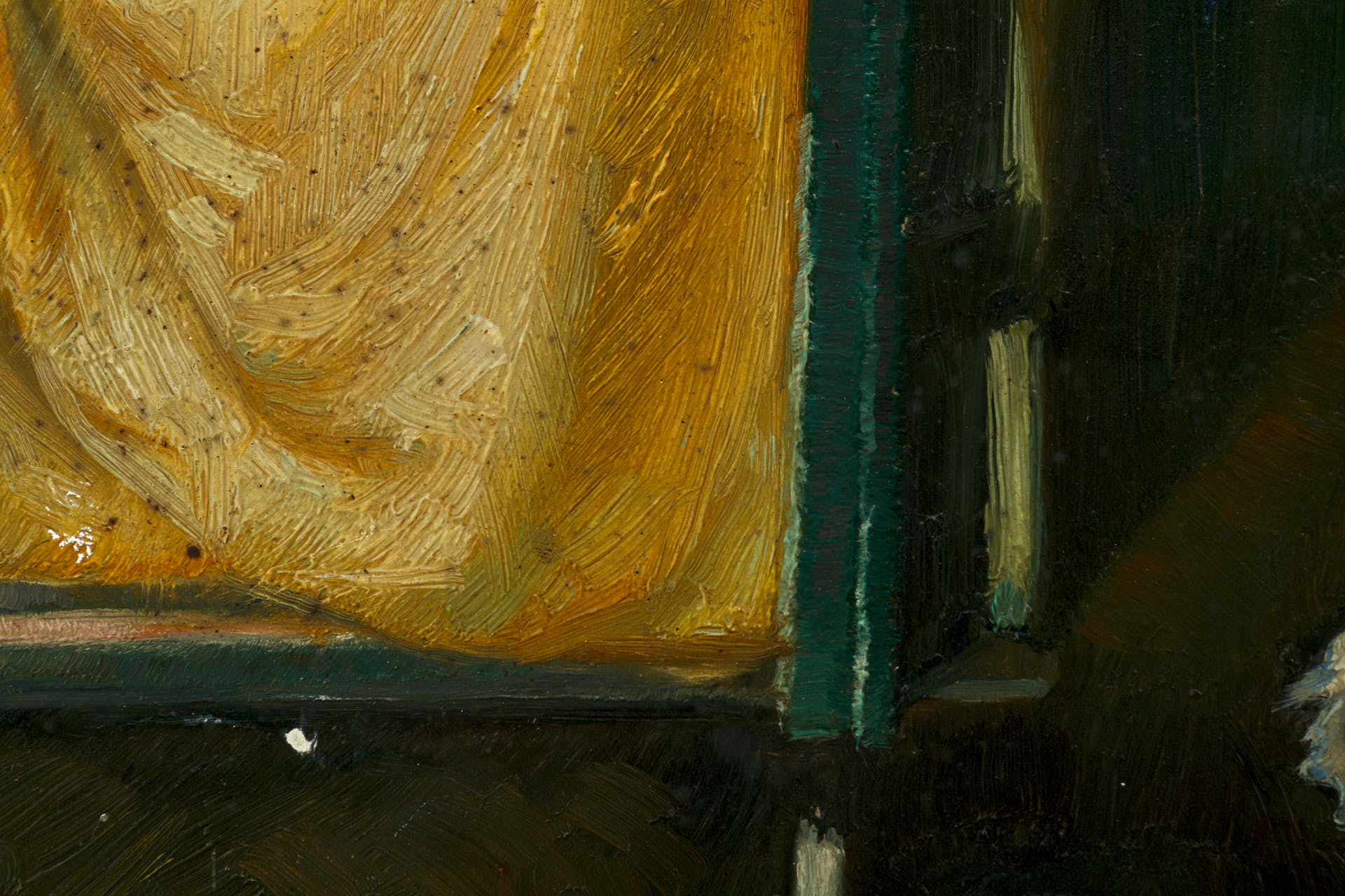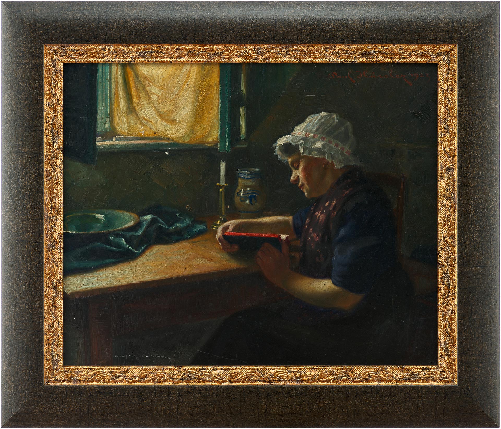 Картина выполнена в духе бытовой жанровой живописи начала XX века, характерной для немецкой академической школы. Автор акцентирует внимание на внутреннем мире персонажа, раскрывая его через простое, но выразительное действие — чтение. Светотеневая моделировка и композиционная строгость отсылают к традициям позднего реализма с элементами веризма, стремящегося к достоверной передаче повседневности.