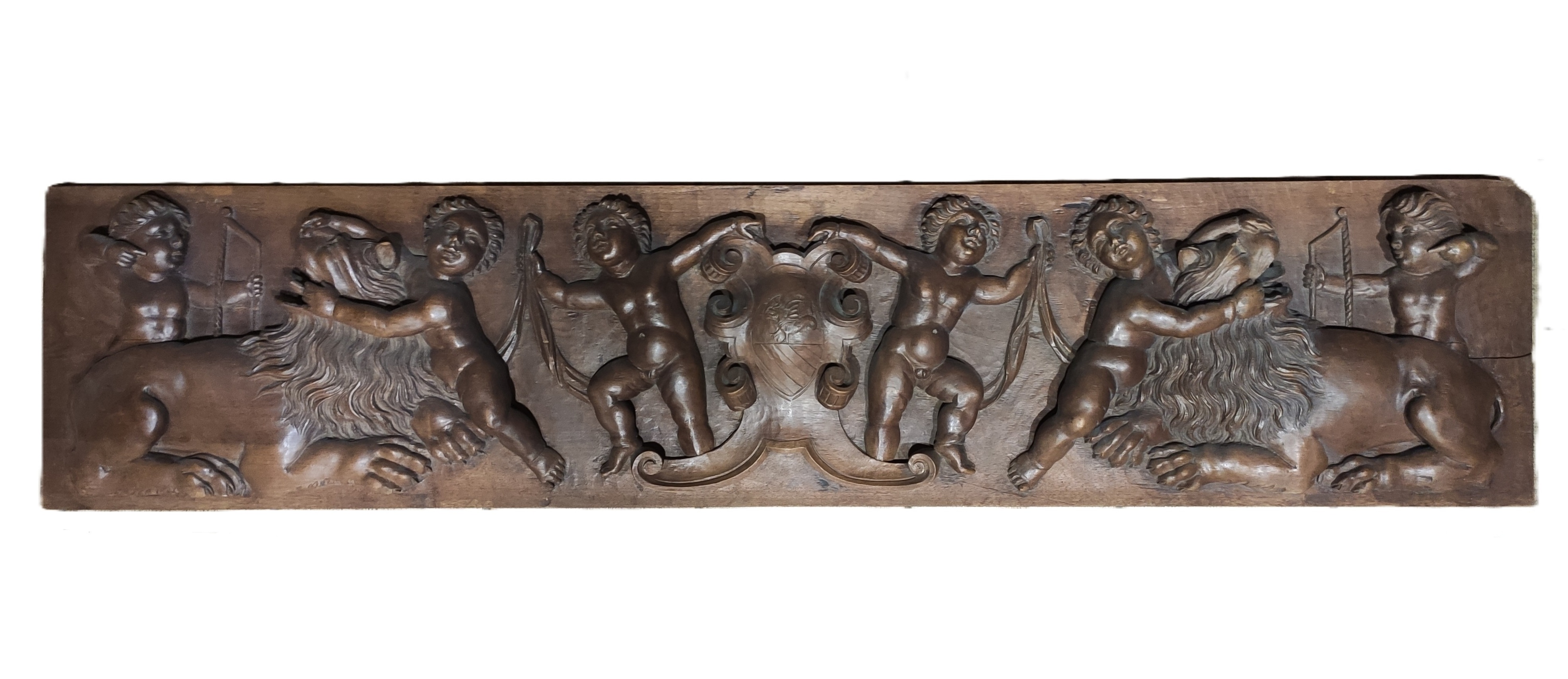 Панно Амуры, побеждающие львов дуб, резьба Европа XVII-XVIII вв. 30,5x140 см. XVII век