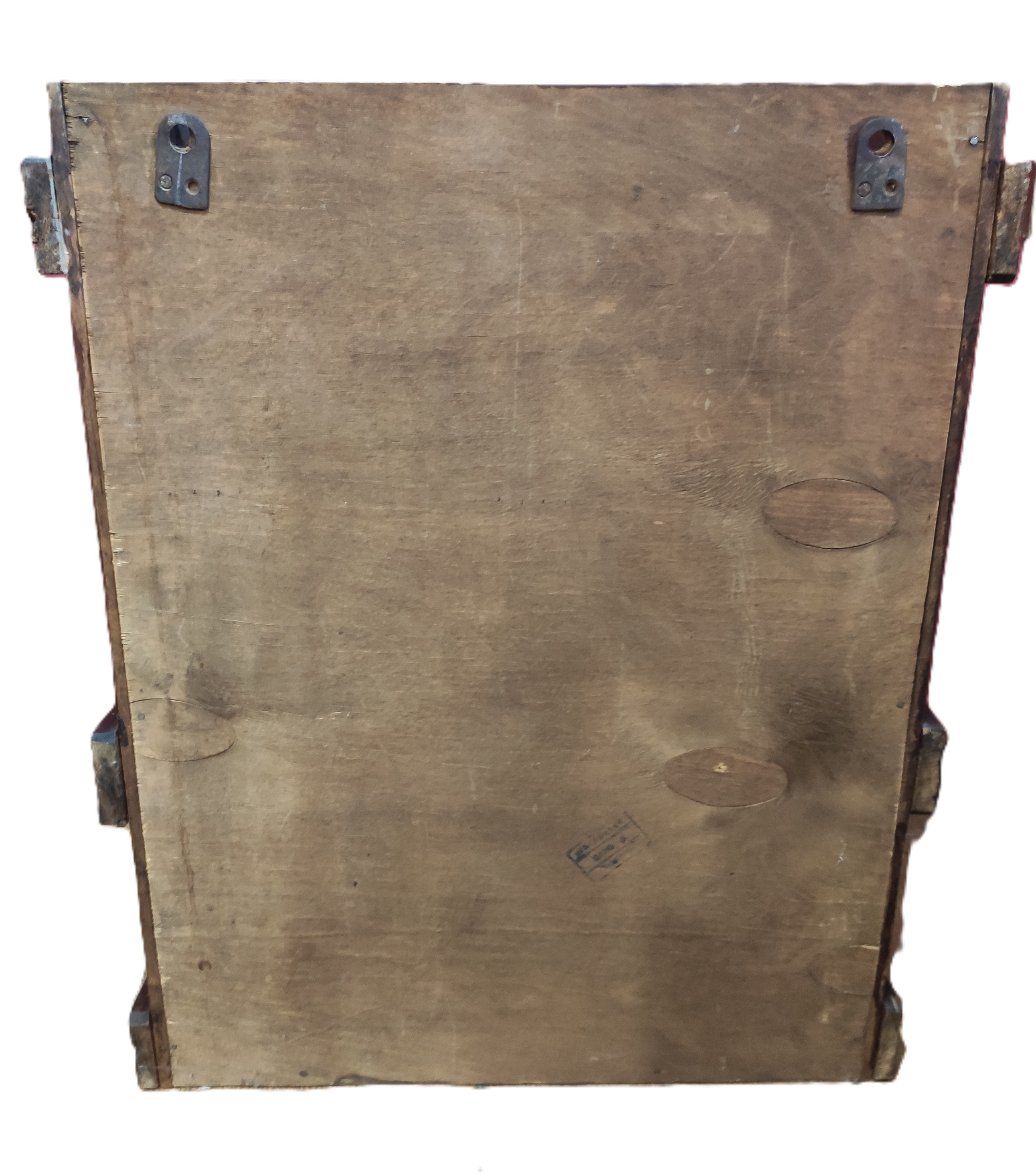 На обороте шкафчика имеется штамп: «Загорский комбинат». В 1929 году на базе кустарных артелий города Сергеева Посада была создана единая «Сергиевская кустарно-промышленная артель» как пример коллективного труда (в 1930 году город переименовали в Загорок). В артель вошло 836 мастеров. Значительная часть продукции мастерской составляли шкатулки, разного назначения и размера, ларцы с различными отделениями, сундучки, пеналы, а также ковши и декоративные блюда. Шкафчик с различным декором, выполненный из древесины, является настоящим украшением домашнего интерьера.