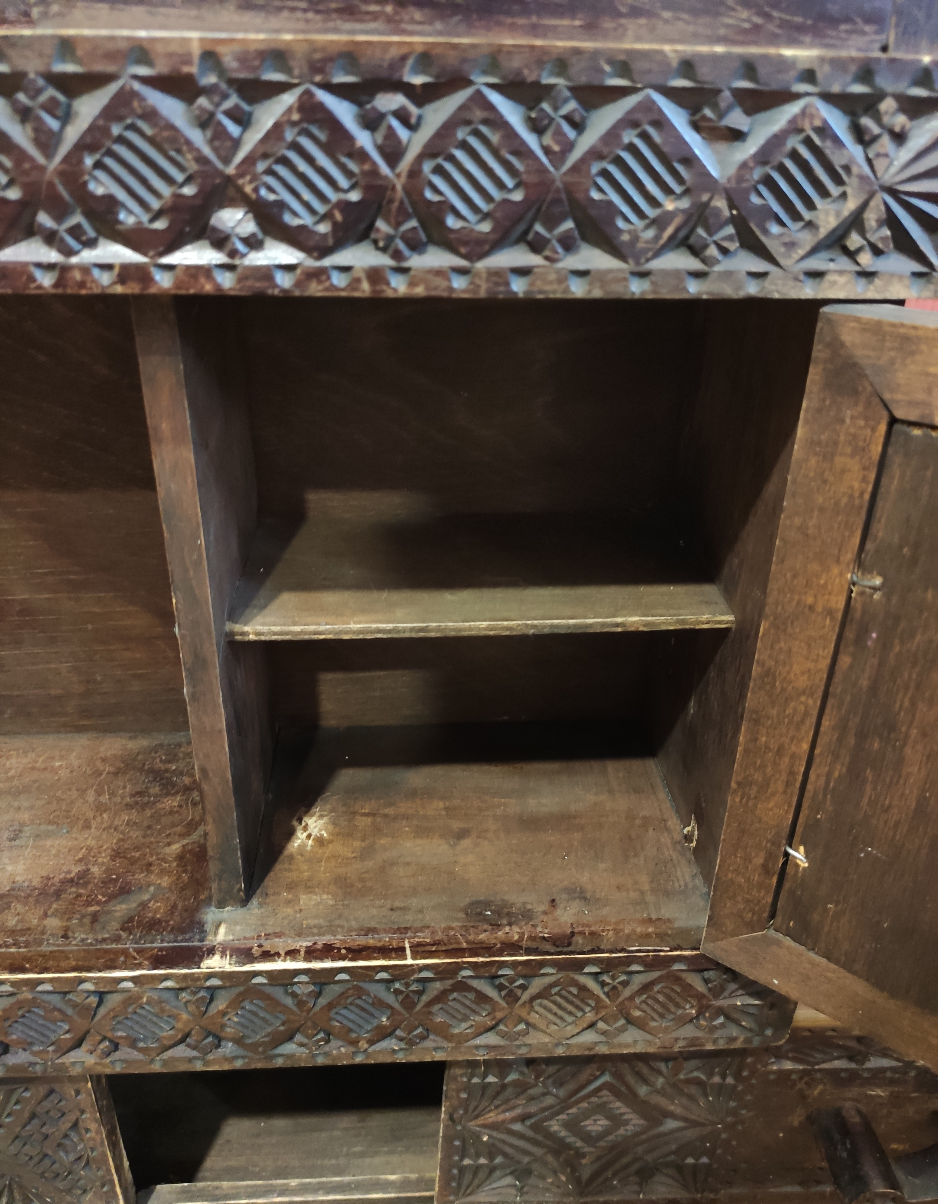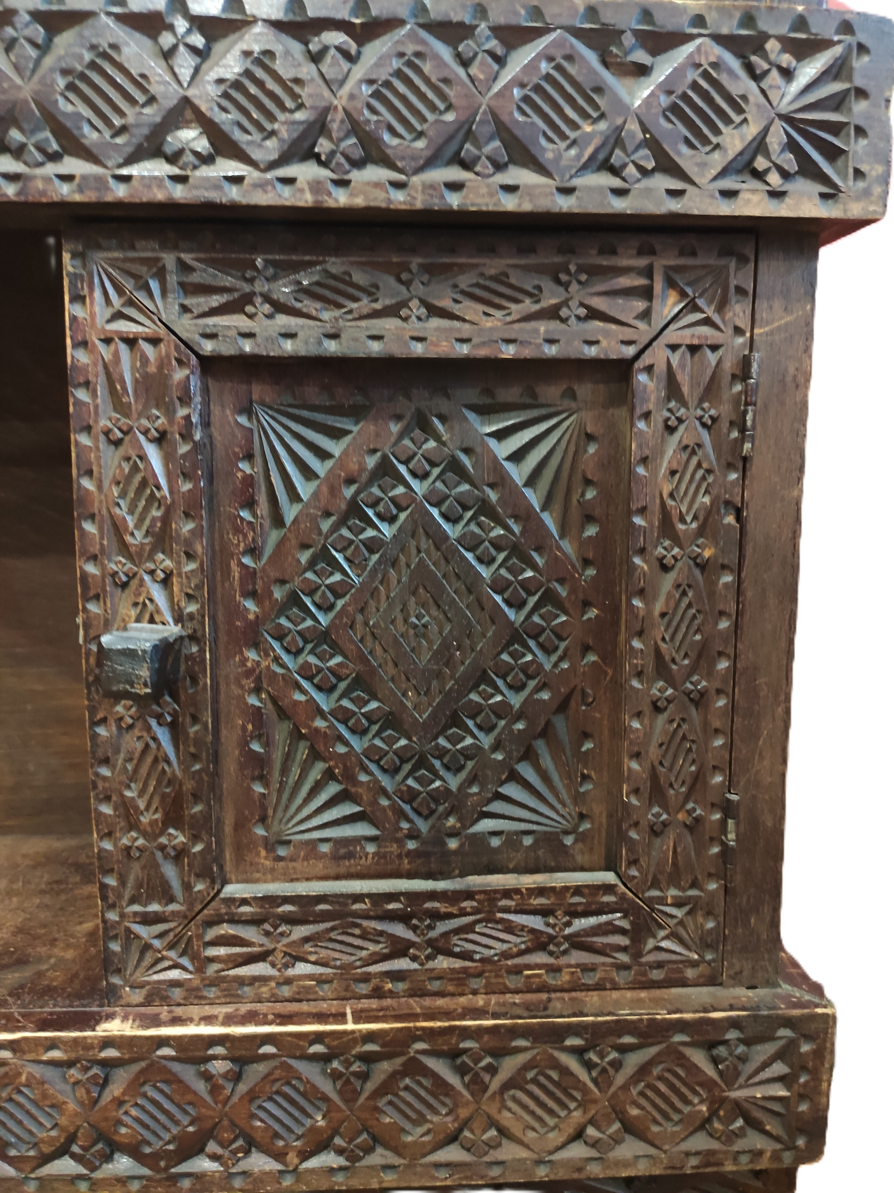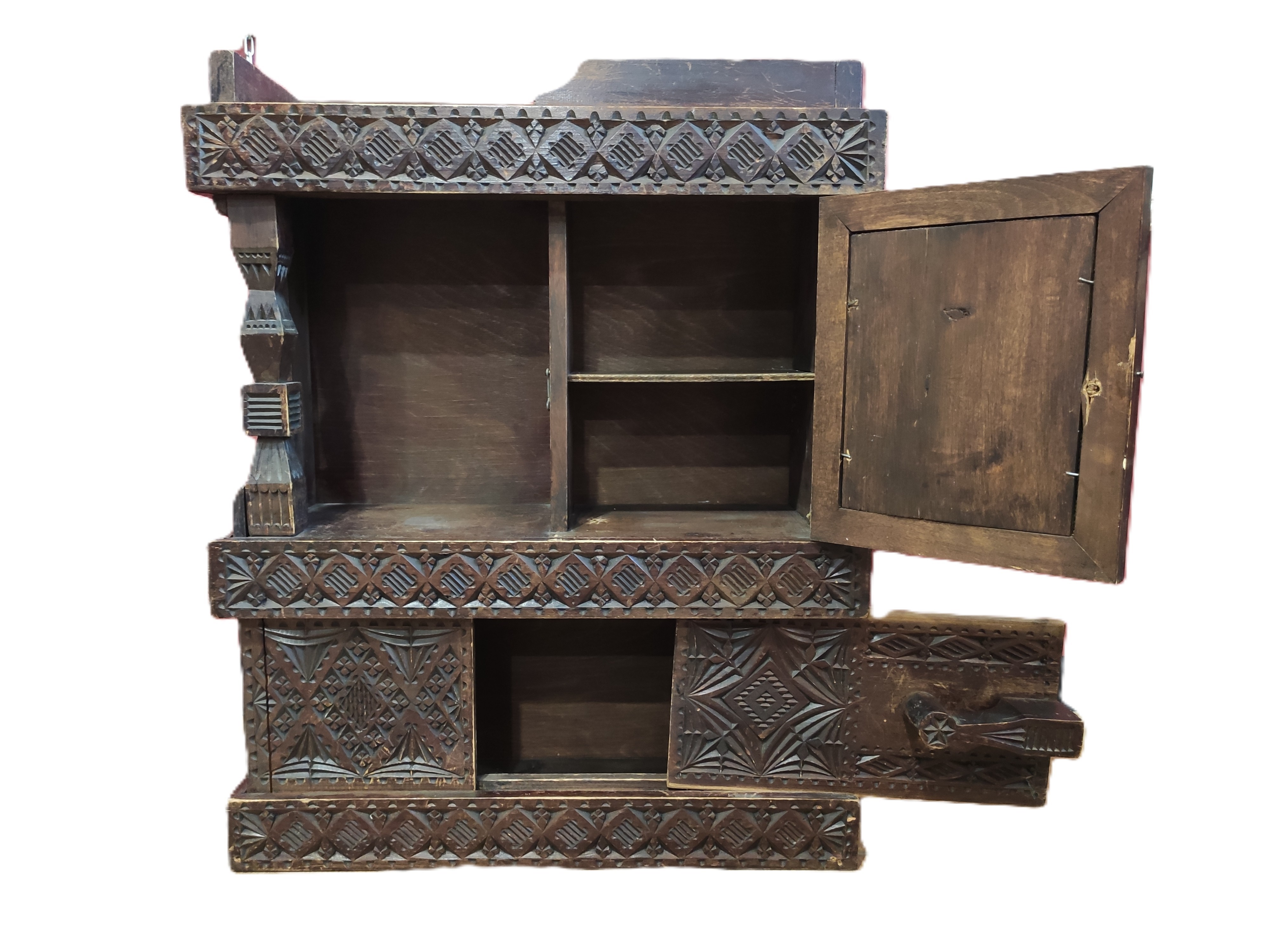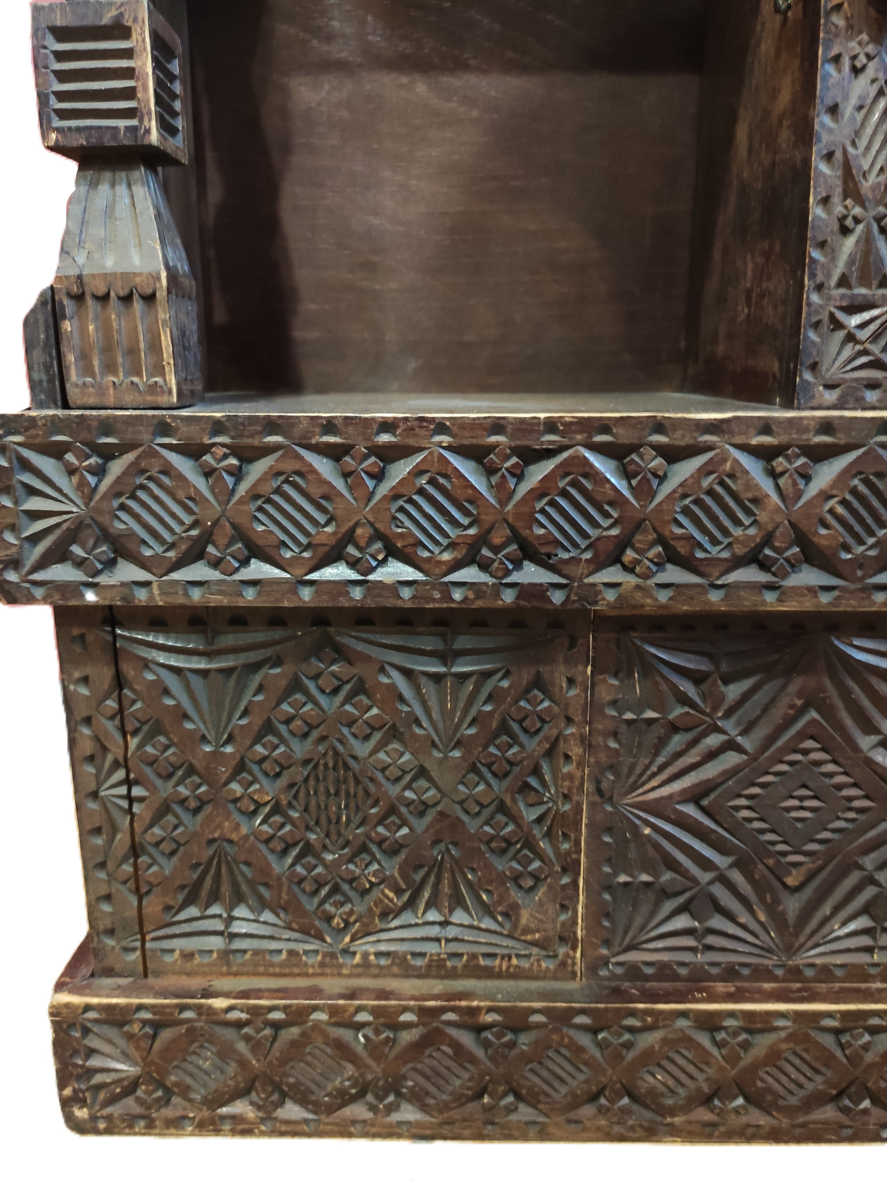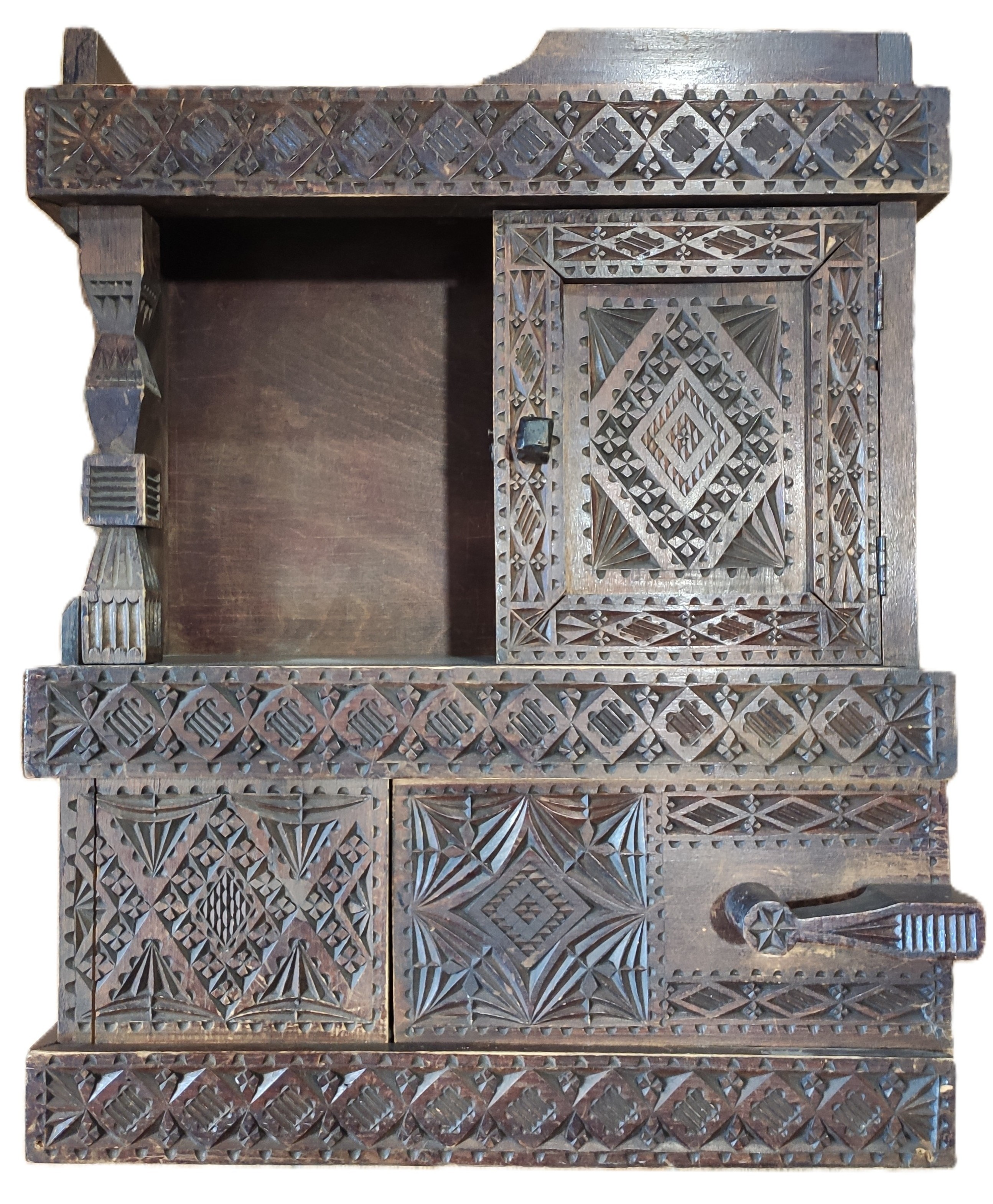 Деревянный шкафчик с резным узором представляет собой мебель для хранения различных вещей. На поверхности шкафчика резьба трехгранновыемчатая. Резьба выполнена ножом с косым срезом режущей кромки в виде трехгранных врезов в толщу доски. Из этих врезов составляли разнообразные узоры: круг и квадрат, полосы, составляющие кайму.