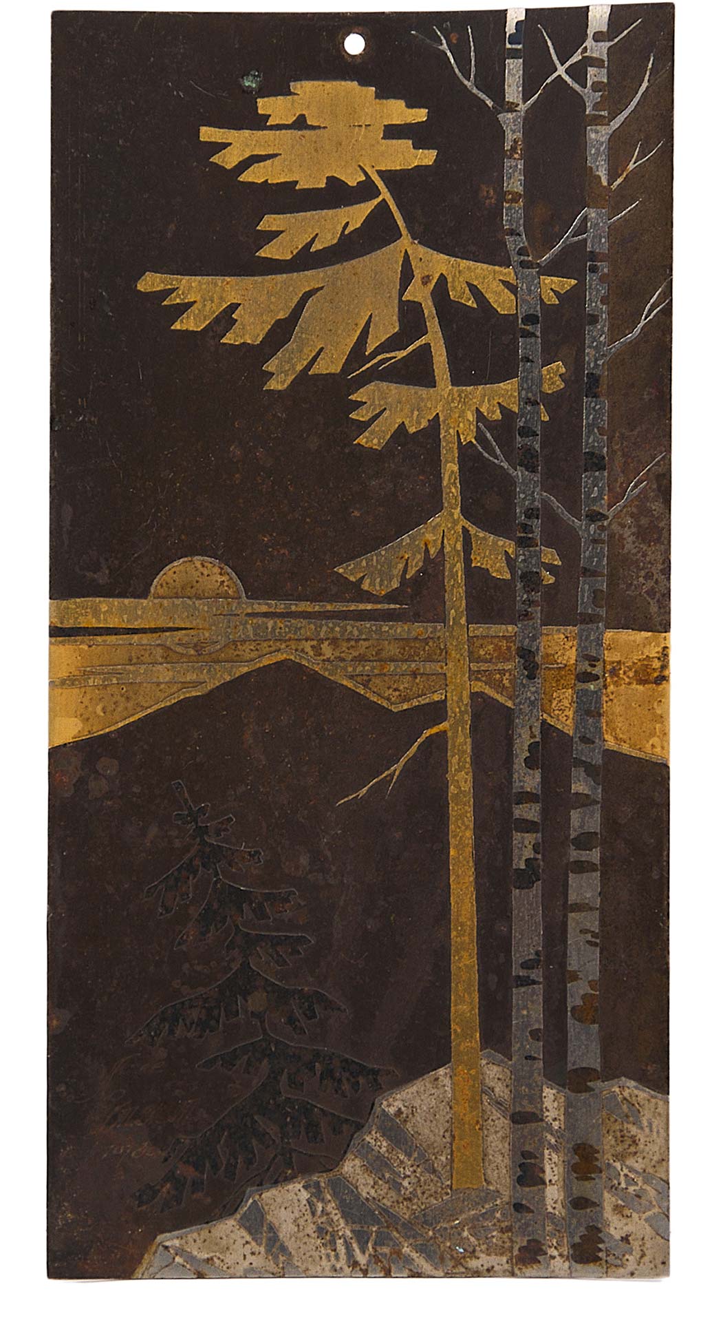 которой покосившаяся елочка. На горизонте видна половина солнца, которая освещает равнину и вершины деревьев. Пейзаж построен на контрасте черного и желтого цветов, передающего состояние природы. Имеется надпись с датой: “Златоуст 1985 г”. На Златоустовском инструментальном комбинате этот вид художественного промысла называют травлением на стальных пластинах. В 1936 году ведущий гравер А.И. Боронников при создании гравюры впервые применил никелевые полутона. При