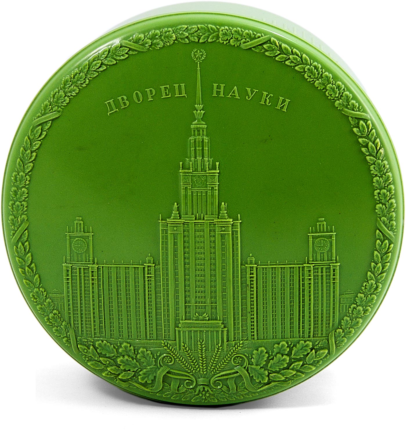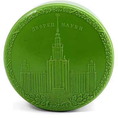 Шкатулка в виде круглой коробочки. Выполнена из пластмассы зеленого цвета.По периметру украшена гирляндой дубовых листьев. На крышке изображение Московского Университета им.М.В.Ломоносова и надпись «Дворец науки»