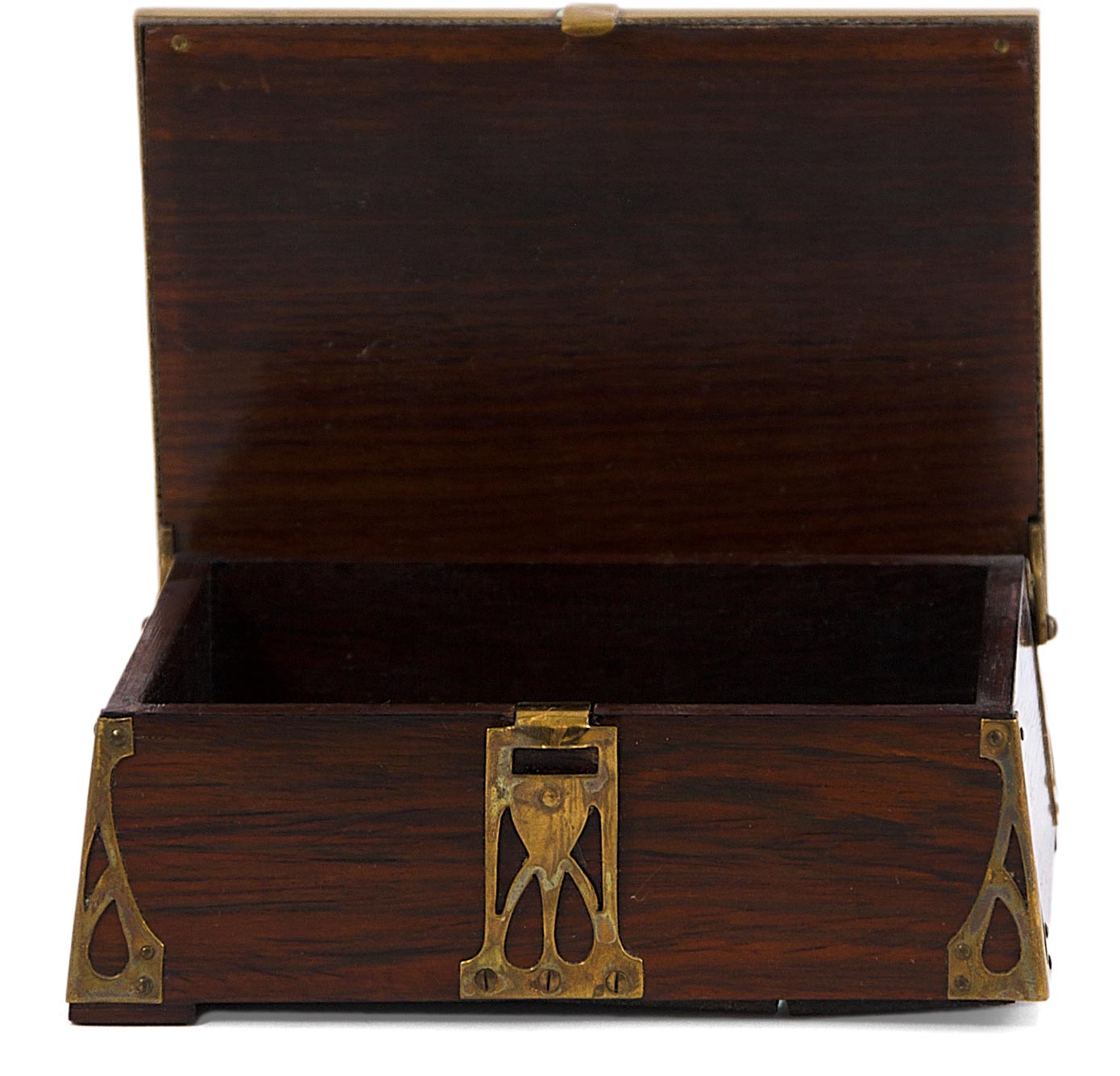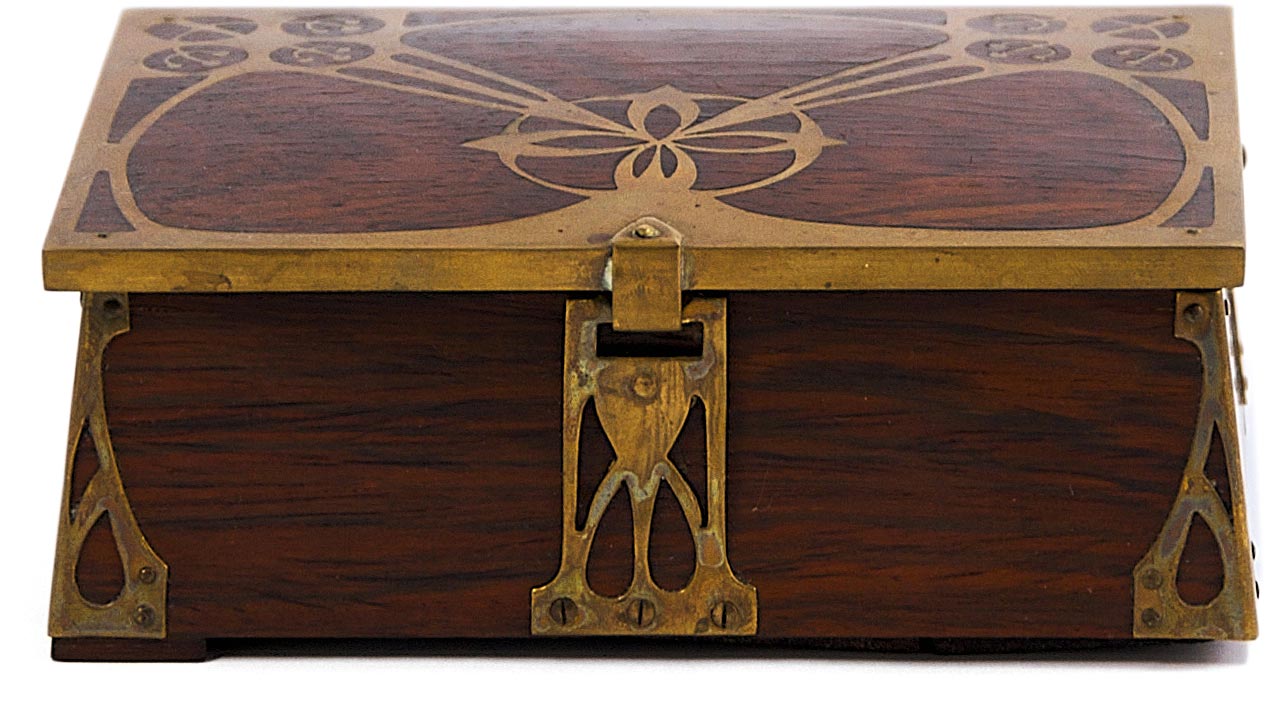 Шкатулка, украшенная латунными накладками, художественное исполнение которых явно указывает на стилевые приемы искусства модерна, вероятнее всего немецкого югендстиля, активно проявившегося в дизайне металлических предметов бытового назначени. Югендстиль - немецкое название модерна, или Art Nouveau, который в конце XIX - начале XX веков господствовал во всех странах Европы. Иметь обстановку или предмет мебели в стиле югенд считалось признаком богатства и хорошего вкуса.