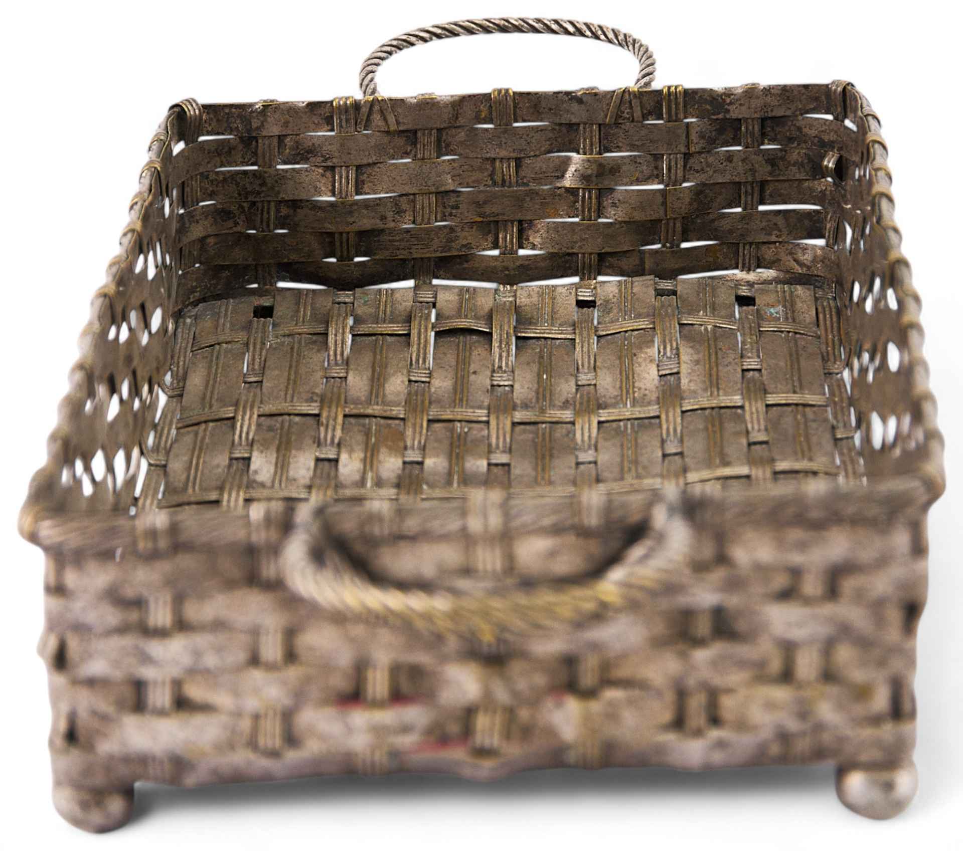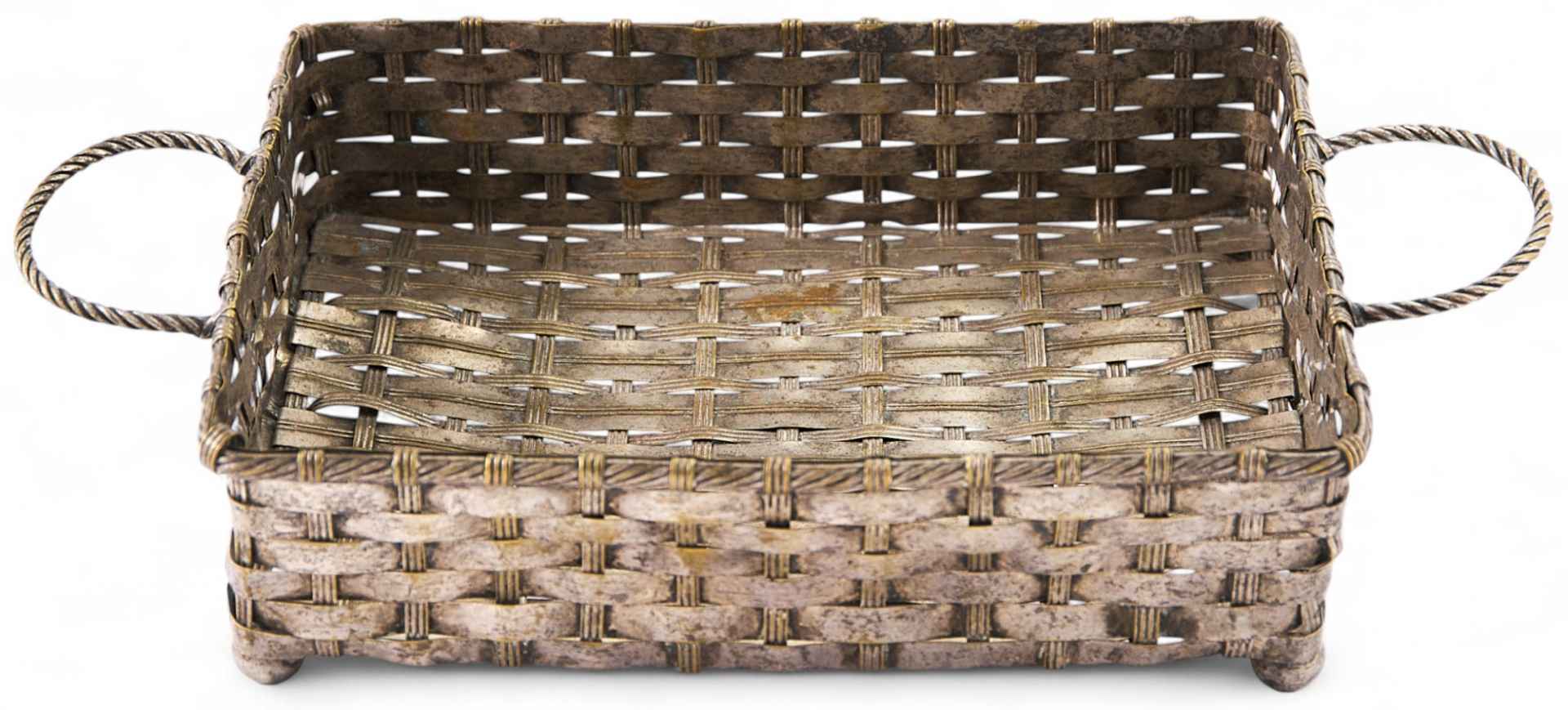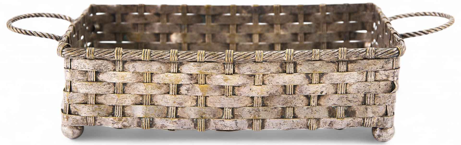 Корзинка прямоугольной формы на четырех круглых ножках. Плетение горизонтальное. Ручки оіфуглые, плетеные. Имеется клеймо: “WMFM”. WMF — Вюртембергский металлический завод; М—латунь. Клеймо подлинное. Предметы с клеймом "WMF” являются прекрасными объектами для частного коллекционирования. История завода началась с основания в городе Гайслинген в 1853 году небольшой фирмы “Страуб и Швайцер” с 60 рабочими, которая выпускала вещи, пользовавшимися неизменным спросом, — хлебные корзинки, чайники, предметы сервировки стола, канделябры, лампы и все виды домашнего обихода. Основным материалом в это время служила характерная для середины XIX века посеребренная медь, использовалась также латунь и в небольшом количестве нейзильбер. Основателем дела был Даниель Страуб (Straub).