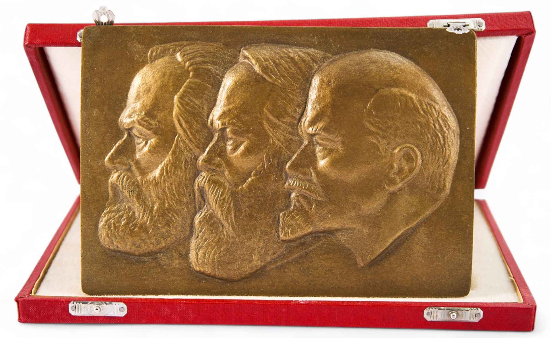 Памятная плакетка, на которой изображены профильные портреты вождей мирового пролетариата Карла Маркса, Фридриха Энгельса, В.И. Ульянова (Ленина).