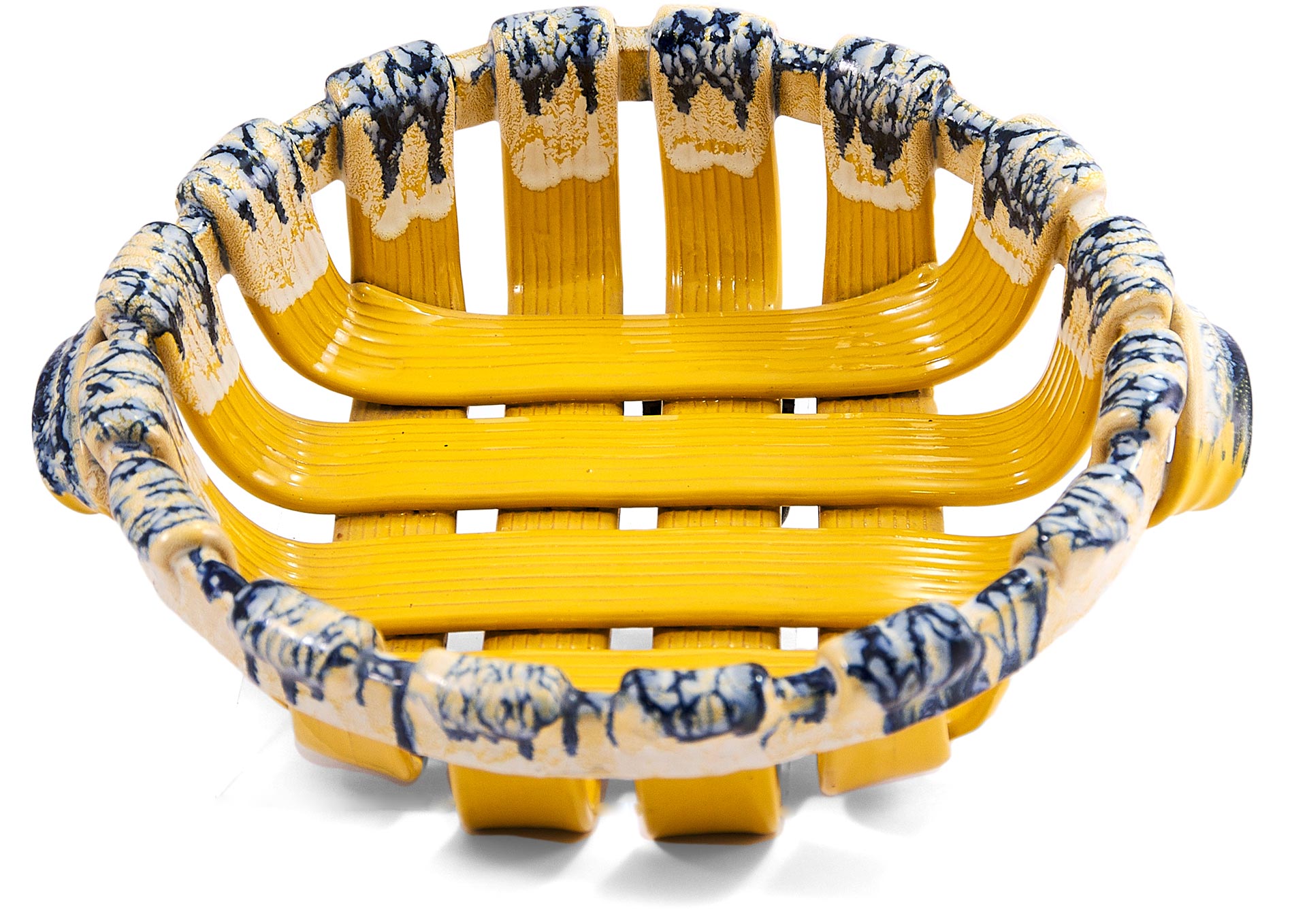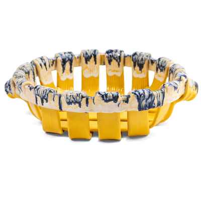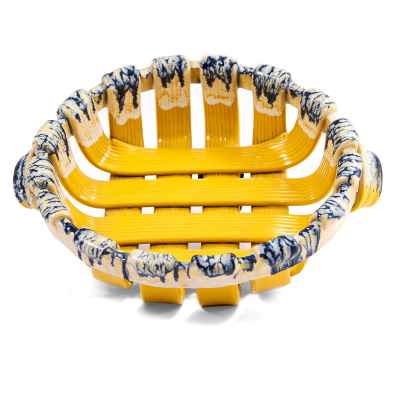 Ваза-фруктовница в виде низкой корзинки с ручками, выполненной из красной глины и покрытой цветной. глазурью (техника майолики). Майолика (от итал. Maioliča — Мальорка) — разновидность керамики, изготавливаемой из обожжённой глины с использованием расписной глазури. В технике майолики изготовляются как декоративные панно, наличники, изразцы и т. п., так и посуда и даже монументальные скульптурные изображения. В Италию майолика попадала из мавританской Испании через остров Мальорку, от названия которого и произошёл термин «майолика». Техника получила распространение в Италии в XIV в. и достигла расцвета в XVII в. Особенно прославились своими изделиями мастерские Фаэнцы, Флоренции, Кафаджоло, Сиены, Урбино, Кальтаджироне и Кастельдуранте. В этот же период майолика получает развитие в Германии, Франции и других европейских странах.