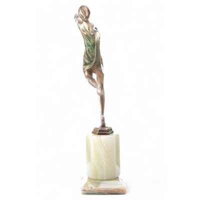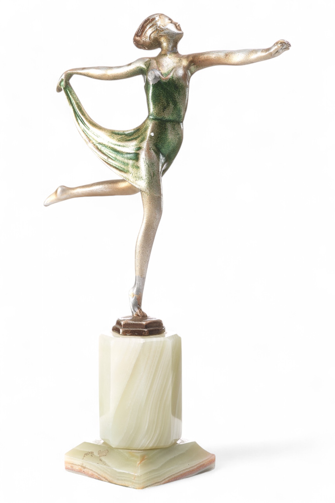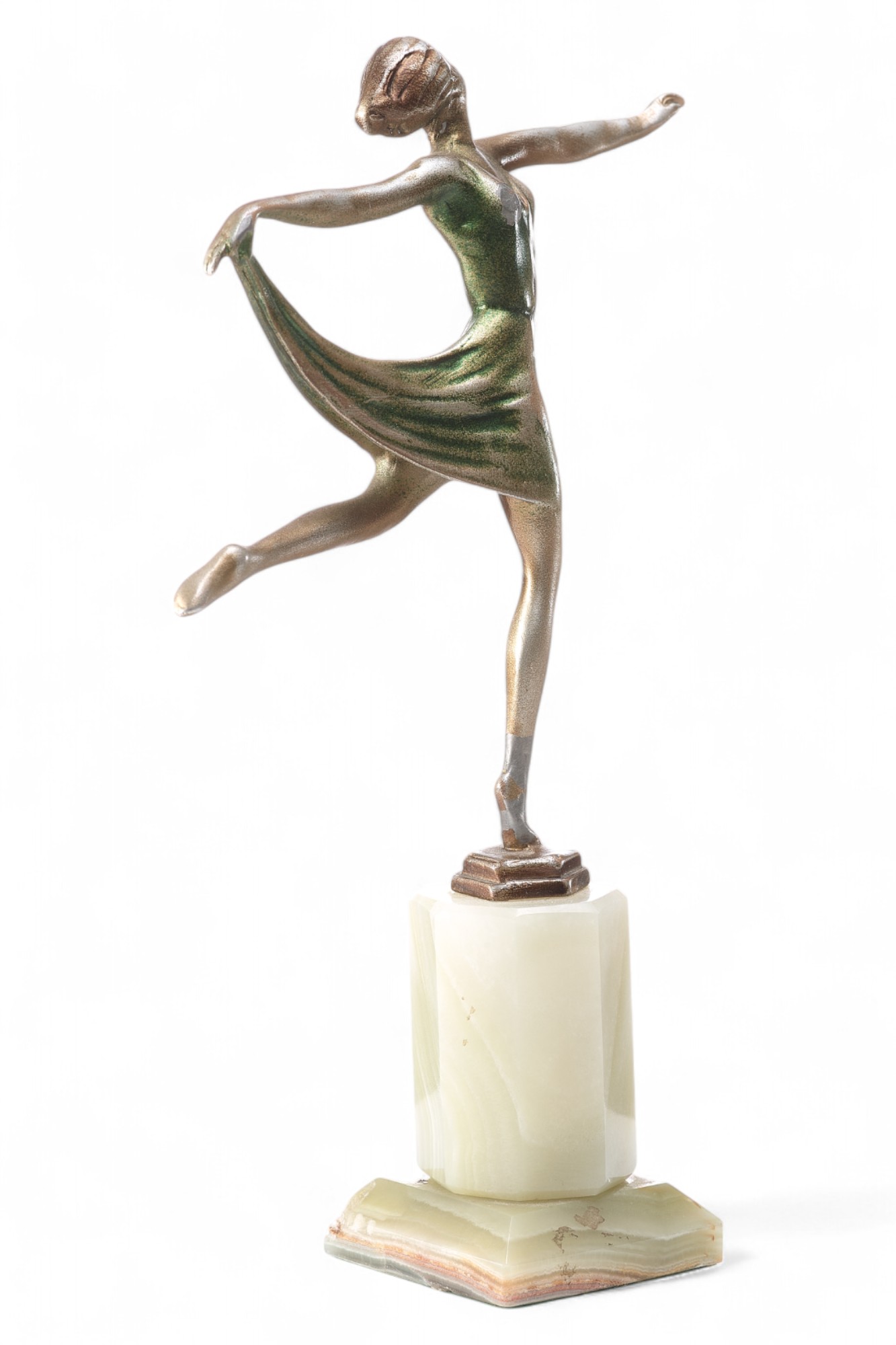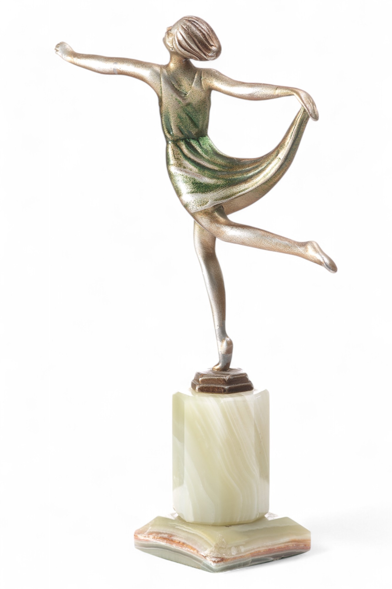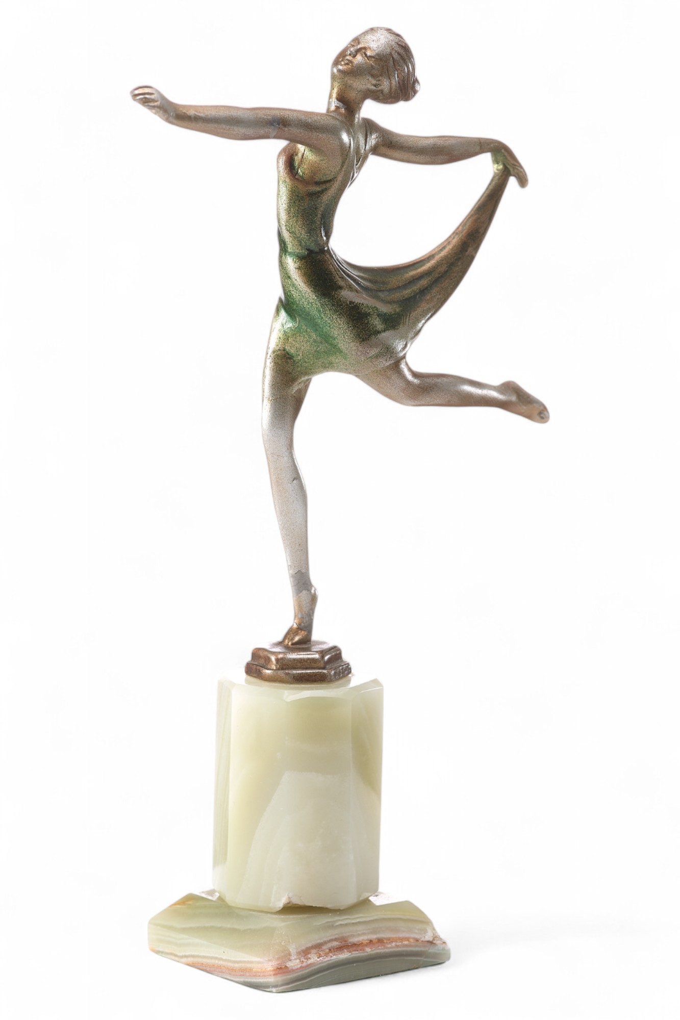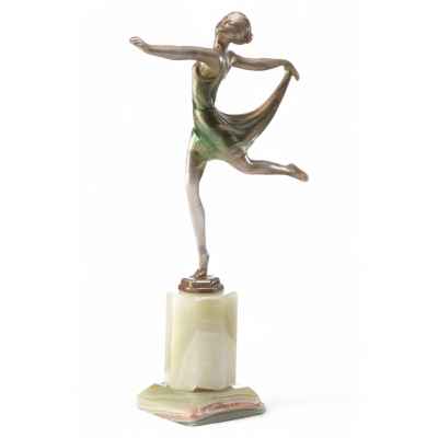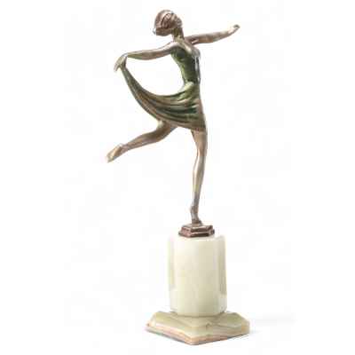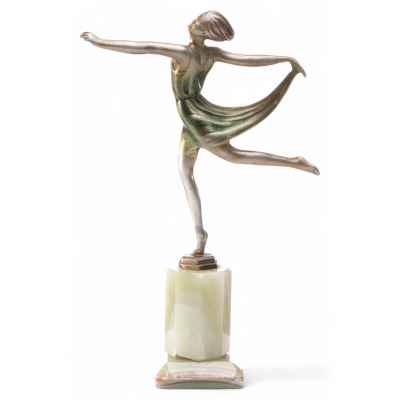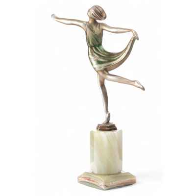 Скульптура под названием «Танец» представляет собой изящную антикварную миниатюру, выполненную в виде женской фигуры в движении, застывшей в грациозном па. Фигура танцовщицы изображена в момент вдохновенного танца: одна нога приподнята, руки раскинуты, а легкое платье струится по направлению движения. Такая поза передает ощущение свободы, экспрессии и пластичности, что характерно для декоративной пластики первой половины XX века. Скульптура имеет декоративный, не утилитарный характер и, как правило, предназначалась для украшения интерьеров, личных кабинетов или витрин в домах состоятельных коллекционеров.