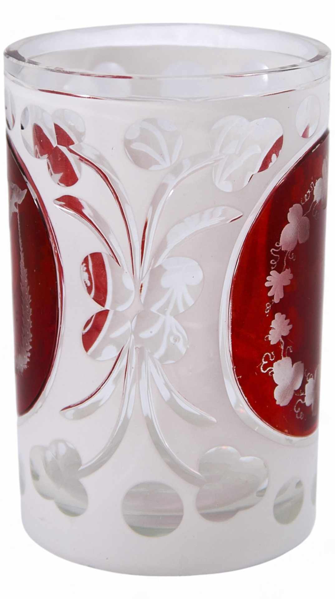 птицы на цветном корпусе в круглом медальоне украшен стакан. Такие стаканы стоили дорого и предназначались для