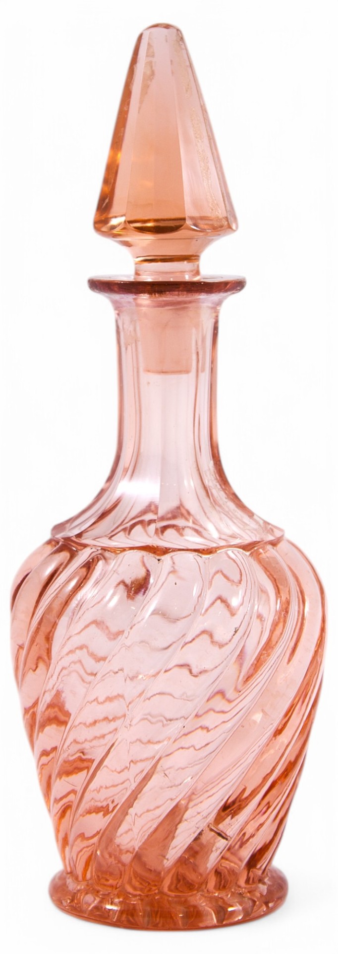 Материалы и техника изготовления включают цветное стекло, обработанное методом литья и шлифовки. Витиеватая форма сосуда с плавными завитками на поверхности создаёт эффект текучести, а насыщенный розовый оттенок придаёт ему особую декоративность. Фигурная гранёная пробка дополняет изысканный облик графина, делая его не только функциональным предметом, но и произведением искусства.